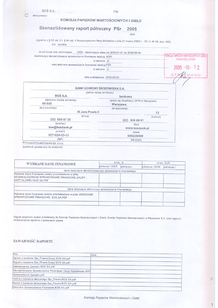 OŚWIADCZENIA ZARZĄDU BANKU OCHRONY ŚRODOWISKA S.A. W SPRAWIE PODMIOTU UPRAWNIONEGO DO BADANIA SPRAWOZDANIA FINANSOWEGO Zarząd Banku Ochrony Środowiska S.A. oświadcza, że podmiot uprawniony do badania sprawozdań finansowych, dokonujący badania półrocznego sprawozdania finansowego za I półrocze 2005 r. został wybrany zgodnie z przepisami prawa oraz że podmiot ten oraz biegli rewidenci dokonujący tego badania spełniali warunki do wydania bezstronnego i niezależnego raportu z badania, zgodnie z właściwymi przepisami prawa krajowego. W SPRAWIE RZETELNOŚCI SPORZĄDZENIA SPRAWOZDANIA FINANSOWEGO Zarząd Banku Ochrony Środowiska S.A. oświadcza, że wedle ich najlepszej wiedzy, półroczne sprawozdanie finansowe za I półrocze 2005 r. i dane porównywalne sporządzone zostały zgodnie z obowiązującymi zasadami rachunkowości oraz że odzwierciedlają w sposób prawdziwy, rzetelny i jasny sytuację majątkową i finansową Grupy Kapitałowej BOŚ S.A. oraz jego wynik finansowy oraz że półroczne sprawozdanie Zarządu Banku Ochrony Środowiska S.A. zawiera prawdziwy obraz rozwoju, osiągnięć i sytuacji Grupy, w tym opis podstawowych ryzyk i zagrożeń. Podpisy wszystkich Członków Zarządu: Data 29.09.2005 Sergiusz Najar Prezes Zarządu ........................... Data 29.09.2005 Piotr Wiesiołek Wiceprezes - I Zastępca Prezesa Zarządu ........................... Data 29.09.2005 Eric Rydmark Wiceprezes Zarządu ........................... Data 29.09.2005 Jerzy Markiewicz Wiceprezes Zarządu ........................... Data 29.09.2005 Wiesław Żółtkowski Wiceprezes Zarządu ........................... Data 29.09.2005 Weine Günther Svensson Wiceprezes Zarządu ........................... PricewaterhoyseCoopers Sp, z o.o. Al. Armii Ludowej 14 00-638 Warszawa, Polska Telefon +48 (22) 523 4000 Faks +48 (22) 523 4040 www.pwc.com/pl Opinia niezależnego biegłego rewidenta z badania półrocznego skonsolidowanego sprawozdania finansowego za okres od 1 stycznia 2005 r. do 30 czerwca 2005 r. Dla Walnego Zgromadzenia Akcjonariuszy i Rady Nadzorczej Banku Ochrony Środowiska S.A. Przeprowadziliśmy badanie załączonego półrocznego skonsolidowanego sprawozdania finansowego Grupy Kapitałowej Banku Ochrony Środowiska S.A. (zwanej dalej „Grupą") sporządzonego przez Bank Ochrony Środowiska S.A. (zwaną dalej „Jednostką dominującą") z siedzibą w Warszawie przy Al. Jana Pawła II 12, obejmującego: (a) skonsolidowany bilans sporządzony na dzień 30 czerwca 2005 r., który po stronie aktywów i pasywów wykazuje sumę 6.639.004 tyś. zł; (b) skonsolidowany rachunek zysków i strat za okres od 1 stycznia do 30 czerwca 2005 r. wykazujący zysk netto w kwocie 13.911 tyś. zł; (c) skonsolidowane zestawienie zmian w kapitale własnym za okres od 1 stycznia do 30 czerwca 2005 r. wykazujące zmniejszenie kapitału własnego o kwotę 6.971 tyś. zł; (d) skonsolidowany rachunek przepływów pieniężnych za okres od 1 stycznia do 30 czerwca 2005 r. wykazujący wpływy pieniężne netto w kwocie 58.010 tyś. zł; (e) informację dodatkową. Za sporządzenie zgodnego z obowiązującymi przepisami półrocznego skonsolidowanego sprawozdania finansowego oraz sprawozdania z działalności Grupy odpowiedzialny jest Zarząd jednostki dominującej. Naszym zadaniem było wyrażenie, na podstawie przeprowadzonego badania, opinii o półrocznym skonsolidowanym sprawozdaniu finansowym. Badanie przeprowadziliśmy stosownie do obowiązujących na terytorium Rzeczypospolitej Polskiej: (a) przepisów rozdziału 7 Ustawy z dnia 29 września 1994 r. o rachunkowości („Ustawa" tekst jednolity - Dz.U. z 2002 r. Nr 76 póz. 694 z późniejszymi zmianami); (b) norm wykonywania zawodu biegłego rewidenta, wydanych przez Krajową Radę Biegłych Rewidentów w Polsce. PricewaterhouseCoopers Sp, z o.o. wpisana jest do Krajowego Rejestru Sądowego prowadzonego przez Sąd Rejonowy dla m. st Warszawy, XIX Wydział Gospodarczy Krajowego Rejestru Sądowego, pod numerem KRS 0000044655. Kapitał zakładowy wynosi 5.358.850 PLN. Siedzibą Spółki jest Warszawa, Ai.Armii Ludowej 14. Członkami Zarządu są: George dohnstone, Antoni F. Reczek, Peter Driscoli, Adam Celiński, Andrzej J. Konopacki, Grzegorz Skrzeszewski, Antoni Tymiński, Piotr Waliński, Artur Ziobro, Halina Konieeka - Maliszewska, Ewa Sowińska, Wojciech Maj, Mirosław Szmigieiski, Waldemar Lachowski, Sebastian Dziadek, Tomasz Reinfuss, Reginald Webb. Opinia niezależnego biegłego rewidenta z badania półrocznego skonsolidowanego sprawozdania finansowego za okres od 1 stycznia 2005 r. do 30 czerwca 2005 r. (cd.) Badanie zostało zaplanowane i przeprowadzone tak, aby uzyskać wystarczającą pewność, że półroczne skonsolidowane sprawozdanie finansowe nie zawiera istotnych błędów i przeoczeń. Badanie obejmowało między innymi sprawdzenie, na podstawie wybranej próby, dowodów potwierdzających kwoty i informacje wykazane w półrocznym skonsolidowanym sprawozdaniu finansowym. Badanie obejmowało również ocenę zasad rachunkowości stosowanych przez Grupę oraz istotnych oszacowań dokonywanych przy sporządzeniu półrocznego skonsolidowanego sprawozdania finansowego, a także ogólną ocenę jego prezentacji. Uważamy, że nasze badanie stanowiło wystarczającą podstawę dla wyrażenia opinii. Informacje zawarte w sprawozdaniu z działalności Grupy za rok obrotowy od 1 stycznia do 30 czerwca 2005 r. uwzględniają przepisy Rozporządzenia Rady Ministrów z dnia 21 marca 2005 r. w sprawie informacji bieżących i okresowych przekazywanych przez emitentów papierów wartościowych (Dz.U. z 2005 r. nr 49, póz. 463) i są zgodne z informacjami zawartymi w zbadanym półrocznym skonsolidowanym sprawozdaniu finansowym. Naszym zdaniem, załączone półroczne skonsolidowane sprawozdanie finansowe we wszystkich istotnych aspektach: (a) zostało sporządzone na podstawie prawidłowo prowadzonej dokumentacji konsolidacyjnej i z
