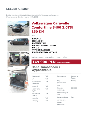 LELLEK GROUP Źródło: http://portal.lellek.pl/lel/komis/auto13685,Volkswagen.pdf?grupa=6 Wygenerowano: Sobota, 4 marca 2017, 10:11 Volkswagen Caravelle Comfortline 3400 2,0TDI 150 KM Nowy ROK2016 MOC150 KM PRZEBIEG7 KM NADWOZIEPRZESZKLONY POJ.2.0 TYP SILNIKADIESEL KOLORBRĄZOWY METALIK kupiony w polsce bezwypadkowy 149 900 PLN nowy z salonu netto faktura VAT Dane samochodu i wyposażenie klimatyzacja Tak Pochodzenie kupiony w Polsce ABS Tak wspomaganie kierownicy Tak Kraj pochodzenia Niemcy poduszki Tak elektryczne szyby Tak Pierwsza rejestracja elektryczne lusterka Tak serwisowany w aso komputer Tak halogeny Tak VIN bezwypadkowy garażowany książka serwisowa 00-0000 Tak I właściciel kupiony w salonie tunning homologacja stan idealny właściciel niepalący Opis dodatkowy Handlowiec Maciej Szubert LELLEK Opole VW Użytkowe +48 77 400 70 35 zapytaj mobile Wyposażenie dodatkowe zawarte w cenie pojazdu : Gwarancja Gwarancja dostępna Ubezpieczenie Ubezpieczenie dostępne Kredyt Kredyt W przypadku finansowania zakupu w leasingu - cena pojazdu po rabacie wyniesie 149 900,-zł netto + ubezpieczenie komunikacyjne na pierwszy rok (OC,AC,NNW,ASS) za 1,9%. Przy zakupie pojazdu za gotówkę lub w kredycie przy tej samej wartości sprzedaży (149 900,-zł netto) dodatkowo ubezpieczenie komunikacyjne na pierwszy rok (OC,AC,NNW,ASS) ZA 0,1%. dostępny - światła przeciwmgielne z przodu zintegrowane ze zderzakiem - lusterka zewnętrzne składane elektrycznie - reflektory LED z przodu i z tyłu - asystent świateł drogowych Light Assist - czujnik deszczu, automatycznie przyciemniane lusterko wsteczne - klimatyzacja trzystrefowa Climatronic elektroniczną regulacją - tempomat - wyświetlacz wielofunkcyjny Premium - zbiornik paliwa 80l - ogrzewany fotel kierowcy i pasażera - uchwyty wejściowe na słupkach A - okna w przestrzeni pasażerskiej przyciemniane - nawigacja Discover Media (8 głośników) + bluetooth - alarm antywłamaniowy z funkcją dozoru wnętrza - okno przesuwne po lewej stronie - podgrzewana szyba przednia - elektryczne wspomaganie domykania tylnej klapy - pakiet akustyczny - obręcze kół aluminiowe 16" Clayton -drzwi przesuwne po prawej stronie ze wspomaganiem domykania Cena katalogowa pojazdu : 162 900,-zł netto Zeskanuj kod, aby zobaczyć ofertę online Termin realizacji zamówienia : samochód magazynowy *zdjęcia pojazdu w oferowanej kolorystyce i zbliżonym wyposażeniu Nota prawna Informacja nie stanowi oferty w rozumieniu art. 66 Kodeksu Cywilnego. Podane dane mają charakter wyłącznie informacyjny. Pełna informacja dostępna jest u handlowca. Sprzedający nie odpowiada za ewentualne błędy lub nieaktualność ogłoszenia.