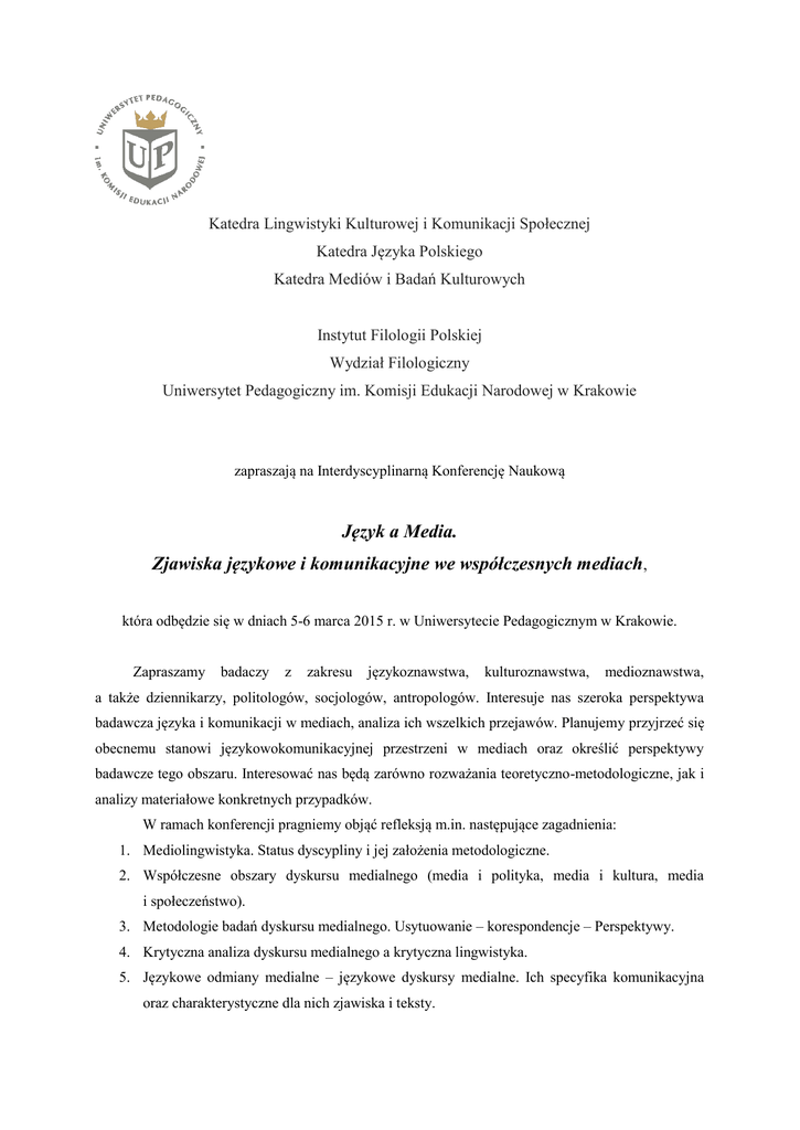 Katedra Lingwistyki Kulturowej i Komunikacji Społecznej Katedra Języka Polskiego Katedra Mediów i Badań Kulturowych Instytut Filologii Polskiej Wydział Filologiczny Uniwersytet Pedagogiczny im. Komisji Edukacji Narodowej w Krakowie zapraszają na Interdyscyplinarną Konferencję Naukową Język a Media. Zjawiska językowe i komunikacyjne we współczesnych mediach, która odbędzie się w dniach 5-6 marca 2015 r. w Uniwersytecie Pedagogicznym w Krakowie. Zapraszamy badaczy z zakresu językoznawstwa, kulturoznawstwa, medioznawstwa, a także dziennikarzy, politologów, socjologów, antropologów. Interesuje nas szeroka perspektywa badawcza języka i komunikacji w mediach, analiza ich wszelkich przejawów. Planujemy przyjrzeć się obecnemu stanowi językowokomunikacyjnej przestrzeni w mediach oraz określić perspektywy badawcze tego obszaru. Interesować nas będą zarówno rozważania teoretyczno-metodologiczne, jak i analizy materiałowe konkretnych przypadków. W ramach konferencji pragniemy objąć refleksją m.in. następujące zagadnienia: 1. Mediolingwistyka. Status dyscypliny i jej założenia metodologiczne. 2. Współczesne obszary dyskursu medialnego (media i polityka, media i kultura, media i społeczeństwo). 3. Metodologie badań dyskursu medialnego. Usytuowanie – korespondencje – Perspektywy. 4. Krytyczna analiza dyskursu medialnego a krytyczna lingwistyka. 5. Językowe odmiany medialne – językowe dyskursy medialne. Ich specyfika komunikacyjna oraz charakterystyczne dla nich zjawiska i teksty. 6. Medialne obrazy świata. Medialne wzorce konceptualizacji rzeczywistości. 7. Podejście kognitywne w badaniach komunikacji medialnej. 8. „Stare” i „nowe” media w perspektywie badań lingwistycznych i komunikacyjnych. 9. Językoznawstwo normatywne a komunikacja medialna. Kultura języka w mediach. 10. Polszczyzna w Internecie. Realizacje – specyfika - przemiany – perspektywy. 11. Kategorie formalno-gramatyczne medialnych realizacji językowych i ich kulturowe aspekty. 12. Perspektywa aksjologiczna w badaniach komunikacji medialnej. Teoria i praktyka. 13. Perspektywa stylistyczna w badaniach komunikacji medialnej. Teoria i praktyka. 14. Wzorce genologiczne tekstów motywowanych medialnie oraz ich (ewentualne) redefinicje. Tekstologia medialna. 15. Problem usytuowań dyskursywnych (kulturowo-ideologicznych) określonych zjawisk językowych i tekstów, charakterystycznych dla komunikacji medialnej. 16. Specyfika socjolingwistyczna i pragmalingwistyczna komunikacji medialnej. 17. Czy istnieją mediolekty? Medialne odmiany środowiskowe języka. 18. Media jako praktyki społeczne. Użytkowanie a/i kompetencje medialne. 19. Nowa komunikacja: social media, blogosfera, Facebook, Twitter, itp. 20. Główne cechy języka w mediach i komunikacji medialnej. Internetyzacja? Tabloidyzacja? Dyferencjacja nadawczo-odbiorcza? Ideologizacja? Emocjonalizacja? Hybrydyzacja formalno-genologiczna? 21. Komunikacja polityczna w mediach. Język – styl – ideologia. 22. Public relations i ich przejawy językowe w przestrzeni medialnej. 23. Od reklamy retro do reklamy współczesnej. Język – kultura – polityka. Patroni konferencji: Polskie Towarzystwo Komunikacji Społecznej Polskie Towarzystwo Językoznawcze Koszty konferencji obejmują udział w konferencji oraz druk artykułu (po uzyskaniu pozytywnej recenzji wydawniczej) w monografii wieloautorskiej. Pracownicy naukowi – 350 zł Doktoranci – 150 zł. Organizatorzy Konferencji: prof. dr hab. Bogusław Skowronek dr Ewa Horyń dr Agnieszka Walecka-Rynduch