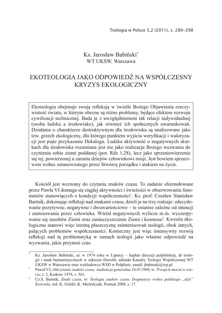 Ekoteologia jako odpowiedź na współczesny kryzys ekologiczny