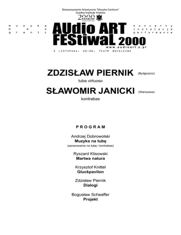 Stowarzyszenie Artystyczne Muzyka Centrum Goethe-Institute Kraków m b g u z r a e y k n i a z c AUdio ART FEStiwaL 2000 k o n c e r t y i n s t a l a c j e p e r f o r m a n c e www.audioart.z.pl 3 LISTOPADA, 20:00, TEATR BÜCKLEINA ZDZIS£AW PIERNIK (Bydgoszcz) S£AWOMIR JANICKI (Warszawa) tuba virtuoso kontrabas PROGRAM Andrzej Dobrowolski Muzyka na tubê (opracowanie na tubê i kontrabas) Ryszard Klisowski Martwa natura Krzysztof Knittel Gluckpavilon Zdzis³aw Piernik Dialogi Bogus³aw Scheaffer Projekt ZDZIS£AW PIERNIK - tuba virtuoso Born on the 10th of November,1942 in Toruñ, hes married to Teresa Widlak and has a daughter Justina. He graduated in Warsaw in 1971. He has played a few hundred concerts as a soloist. He also plays solo recitals. His repertoire includes his own transcriptions of some old masterpieces and the newest avant-garde works also the ones dedicated especially for him written by K. Penderecki, J. Fotka, Z. Bargiewski, M. Borkowski B. Sheaffer, A. Dobrowolski, W. Szalonka, A. Kszanowski, k.Knitel, W. Kilar, B.Ammann, F.Grillo, P. Lacher and many others. So far he recorded a lot of records: 2LPs for Polish Records 1 LP for Pro-Viva and Sonoton, some records for radio stations in Germany, Belgium, France, Sweden Great Britain also some stuff for TV stations in Monachium and London. He spends his free time in his garden, taking to mountaineering, listening to music. He collects old clocks, kerosene lamps and photographs. ZDZIS£AW PIERNIK - tuby mi³onik sztuk piêknych Urodzony na 10th listopada, 1942 w Toruñ, on bra³ lub do Teresa Widlak i ma córki Justina. On ukoñczy³ studia w Warszawie w 1971. On gra³ kilka sto zgody jak solistê. On te¿ gra jednoosobowe opowiadania. Jego repertuar w³¹cza jego w³asne transkrypcje kilku starych arcydzie³ i najbardziej nowych awangardowych zak³adów te¿ jedne powiêca³ specjalnie dla niego pisany przez K. Penderecki, J. Fotka, Z. Bargiewski, M. Borkowski B. Sheaffer, A. Dobrowolski, W. Szalonka, A. Kszanowski, K. Knitel, W. Kilar, B. Ammann, F. Grillo, P. Lacher i du¿o inni. Dotychczas on rejestrowa³ du¿o zapisy: 2LP dla Polish Rejestruje" 1 Lp dla Pro egzamin ustnego " i Sonoton " , kilku rejestruje dla radia stacji w Niemcach, Belgia, Francja, Szwecji Wielka Brytania te¿ jaki materia³ dla Tv stacji w Monachium i Londyn. On spêdza jego wolny czas w jego ogrodzie, bior¹c do uprawiania alpinizm, s³uchaj¹c muzyki. On zbiera stare zegary, nafty lampy i fotografie . One thing which was very interesting was Zdislaw Pierniks tuba (Which is rarely used as a solo instrument) playing. He showed how many sounds an artist can pull out from this motionless and gross tube. Mobility of passages and timbre variation, unbelievable special effects, we could see it all during Pierniks interpretation of Vaughan Williamss concert and in fragments of Boccherini, Saint Soensa aad Mozart. Roman Kraszewski Kurier Szczeciñski Jedna rzecz który bardzo zainteresowa³ by³ Zdislaw Piernik tuba (Który rzadko jest u¿ywany jak jednoosobowy instrument) bawi¹c siê. On pokazywa³ ile dwiêkom artysta mo¿e wyci¹gaæ siê od tej bez ruchu i t³ustej rury. Ruchliwoæ przejæ i barwy dwiêku odmiany, nieprawdopodobnych specjalnych skutki, my moglibymy widzieæ te wszystko podczas Piernik interpretacji Vaughan Williams zgody i w fragmentach Boccherini, wiêtego Soensa aad Mozart . Rzymskie Kraszewski Kurier Szczeciñski " S£AWOMIR JANICKI - double-bass player (born 16.05.1967) He started his career in the late 80s as a member of legendary band from Bydgoszcz Henry the Bearded. In 1991together, with Tomasz Gwinciñski and Jacek Buhl he created the Trytony. In 1992 jointly with Jacek Majewski funded the F.R.G.S. the Brain. Next, he started playing concerts and publish his records with Mazzoll & Arrhythmic Perfection. Then, with Jerzy Mazzoll and Jacek Majewski, he funded the radical trio Arrhythmic Brain and next with Jacek Majeswki and John Dobie the band called The Pieces of Brain. In 1999 he met the world-standard tuba player Zdzislaw Piernik. The result of it was the record that can be found on the collection from The Brain and plans for the future concerts. Despite his activity as a musician, he runs, together with Jacek Majewski, the pub called The Brain which publishes records (mail order included), and the association The Bydgoszcz Canal which is to facilitate scrounging money from sponsors for the whole activity that has been described. S£AWOMIR JANICKI - kontrabasu gracz muzyk (urodzony 16.05.1967) On zaczyna³ jego karierê w pónym 80 jak cz³onek legendarnej bandy od Bydgoszcz Henry Stawiane czo³o ". W 1991together, z Tomasz Gwinciñski i Jacek Buhl on tworzy³ Trytony " . W 1992 wspólnie z Jacek Majewski funded F . R . G . S . Mózgu ". Nastêpny, on zaczyna³ gry zgody i publikuje jego zapisy z Mazzoll & Arrhythmic Doskona³oci". Wtedy, z Jerzy Mazzoll i Jacek Majewski, on funded podstawowe tria Arrhythmic Mózgu" i nastêpny z Jacek Majewski i John Dobie banda nazywa³ The Kawa³ki Mózgu". W 1999 on spotyka³ wiatowe standardowe tuby gracza muzyka Zdzislaw Piernik. Wynik tego by³ zapis które mo¿e byæ znajdowany na gromadzeniu od The Mózgu " i plany dla przysz³ych zgód. Wbrew jego dzia³alnoci jak muzyk, on jedzie, razem z Jacek Majewski, knajpa nazywa³a The Mózgu " który publikuje zapisy (zamówienie poczt¹ w³¹cza³o), i po³¹czenia The Bydgoszcz Kana³u " który ma u³atwiaæ winiêcie pieni¹dze od sponsor dla ca³ej dzia³alnoci której by³ opisywany . Discography: with Trytony Bydgoszcz Dancing Outline of Innocent Mathematics with Mazzoll & Arrhythmic Perfection a Out, Out To Lunch Talk With a Cat-executioner Janicki pulling the double bass, hidden behind the leaders back, does a lot of good work. His deep, solid bass playing is in opposition to the weathering stuntman like Mazzolls shows. Its a very good combination. Janicki watches out for the pulse, and when he takes a bow the audience attention 