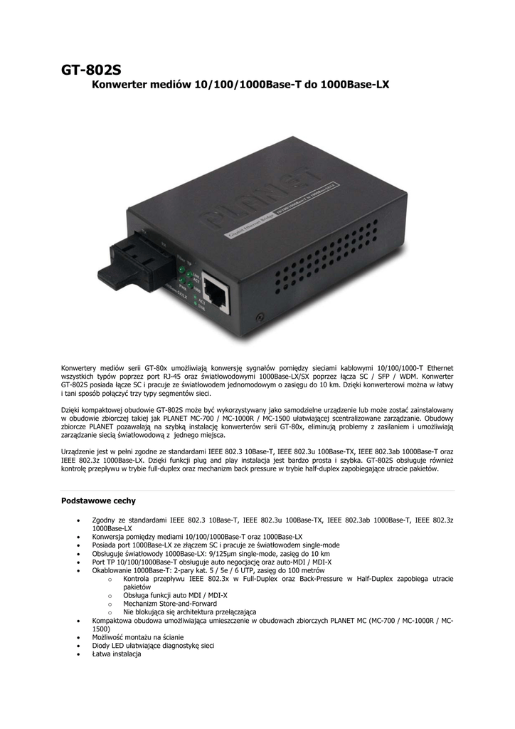 GT-802S Konwerter mediów 10/100/1000Base-T do 1000Base-LX Konwertery mediów serii GT-80x umożliwiają konwersję sygnałów pomiędzy sieciami kablowymi 10/100/1000-T Ethernet wszystkich typów poprzez port RJ-45 oraz światłowodowymi 1000Base-LX/SX poprzez łącza SC / SFP / WDM. Konwerter GT-802S posiada łącze SC i pracuje ze światłowodem jednomodowym o zasięgu do 10 km. Dzięki konwerterowi można w łatwy i tani sposób połączyć trzy typy segmentów sieci. Dzięki kompaktowej obudowie GT-802S może być wykorzystywany jako samodzielne urządzenie lub może zostać zainstalowany w obudowie zbiorczej takiej jak PLANET MC-700 / MC-1000R / MC-1500 ułatwiającej scentralizowane zarządzanie. Obudowy zbiorcze PLANET pozawalają na szybką instalację konwerterów serii GT-80x, eliminują problemy z zasilaniem i umożliwiają zarządzanie siecią światłowodową z jednego miejsca. Urządzenie jest w pełni zgodne ze standardami IEEE 802.3 10Base-T, IEEE 802.3u 100Base-TX, IEEE 802.3ab 1000Base-T oraz IEEE 802.3z 1000Base-LX. Dzięki funkcji plug and play instalacja jest bardzo prosta i szybka. GT-802S obsługuje również kontrolę przepływu w trybie full-duplex oraz mechanizm back pressure w trybie half-duplex zapobiegające utracie pakietów. Podstawowe cechy • • • • • • • • • • Zgodny ze standardami IEEE 802.3 10Base-T, IEEE 802.3u 100Base-TX, IEEE 802.3ab 1000Base-T, IEEE 802.3z 1000Base-LX Konwersja pomiędzy mediami 10/100/1000Base-T oraz 1000Base-LX Posiada port 1000Base-LX ze złączem SC i pracuje ze światłowodem single-mode Obsługuje światłowody 1000Base-LX: 9/125µm single-mode, zasięg do 10 km Port TP 10/100/1000Base-T obsługuje auto negocjację oraz auto-MDI / MDI-X Okablowanie 1000Base-T: 2-pary kat. 5 / 5e / 6 UTP, zasięg do 100 metrów o Kontrola przepływu IEEE 802.3x w Full-Duplex oraz Back-Pressure w Half-Duplex zapobiega utracie pakietów o Obsługa funkcji auto MDI / MDI-X o Mechanizm Store-and-Forward o Nie blokująca się architektura przełączająca Kompaktowa obudowa umożliwiająca umieszczenie w obudowach zbiorczych PLANET MC (MC-700 / MC-1000R / MC1500) Możliwość montażu na ścianie Diody LED ułatwiające diagnostykę sieci Łatwa instalacja Zastosowanie Sieci światłowodowe dla ISP, przedsiębiorstw i domu Dzięki wysokiej wydajności, szybkiej transmisji danych i łatwej instalacji, konwertery serii GT-80x mogą posłużyć firmom ISP do budowy sieci FTTH (Fiber to the Home) lub FTTC (Fiber to the Curb) oraz wszelkiego typu przedsiębiorstwom do budowy sieci FTTB (Fiber to the Building). Dane techniczne Specyfikacja sprzętowa Standardy IEEE 802.3, 10Base-T IEEE 802.3u, 100Base-TX IEEE 802.3ab, 1000Base-T IEEE 802.3z, 1000Base-LX Porty 1 x 10/100/1000Base-T 1 x 1000Base-LX Interfejs przewodowy Port RJ-45 (Auto-MDI / MDI-X) Interfejs światłowodowy SC Długość fali 1310nm Szybkość Okablowanie Skrętka 10/20Mbps dla Half / Full-Duplex 100/200Mbps dla Half / Full Duplex 2000Mbps dla Full-Duplex Światłowód 2000Mbps dla Full-Duplex Skrętka 10Base-T: 2-pary UTP kat. 3,4,5, do 100 m 100Base-TX: 2-pary UTP kat. 5, do 100 m 1000Base-T: 4-pary STP kat. 5 do 100m Światłowód 9 / 125µm single-mode, do 10 km Diody LED • PWR • TP LINK / ACT, 1000 • Fiber LINK / ACT Zużycie prądu 5.6 W / 19 BTU (maks.) Zasilanie DC 5V / 2A Wymiary (Szer. x Gł. x Wys.) 26 x 70 x 97 mm Środowisko pracy Temperatura: 0 do 50 stopni C Wilgotność: 5~90% bez kondensacji Środowisko składowania Temperatura: -40 to 70 stopni C Wilgotność: 5~90% bez kondensacji Certyfikaty FCC Class A, CE Class A Producent i dystrybutor zastrzegają sobie prawo do zmiany specyfikacji technicznej bez dodatkowej informacji. Wszelkie nazwy firmowe i znaki są chronione prawem i należą do ich właścicieli.