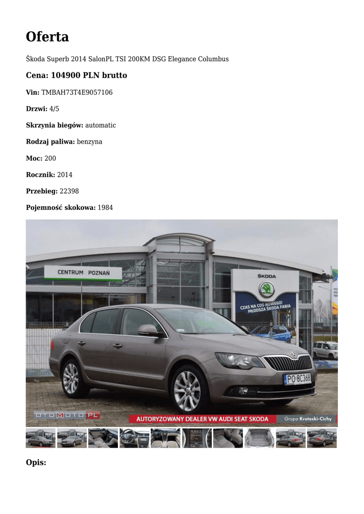 Oferta Škoda Superb 2014 SalonPL TSI 200KM DSG Elegance Columbus Cena: 104900 PLN brutto Vin: TMBAH73T4E9057106 Drzwi: 4/5 Skrzynia biegów: automatic Rodzaj paliwa: benzyna Moc: 200 Rocznik: 2014 Przebieg: 22398 Pojemność skokowa: 1984 Opis: Auto-Handel-Centrum Krotoski-Cichy Autoryzowany Dealer VW Audi Seat Skoda SAMOCHÓD NA GWARANCJI FABRYCZNEJ DO 05.2018 MOŻLIWOŚĆ SPRAWDZENIA POJAZDU W STACJI OBSŁUGI. MOŻLIWOŚĆ POZOSTAWIENIA SWOJEGO SAMOCHODU UŻYWANEGO W ROZLICZENIU -----------------------------------------------------------------------------------------------------------------------------------------------------Uwaga: Miejsce ekspozycji pojazdu - Grupa Krotoski - Cichy Salon Volkswagen ul. Głogowska/Kowalewicka 3C, 60-002 Poznań - Komorniki Osoba kontaktowa tel: Romualda Kroll 601 751 199 Maciej Oblizajek 697 700 055 Maciej Śmigielski 781 440 157 tel.: +48 61 832 72 06 MOŻLIWA JAZDA PRÓBNA PO WCZEŚNIEJSZYM UZGODNIENIU TERMINU -----------------------------------------------------------------------------------------------------------------------------------------------------Skoda Superb 2.0 TSI 200KM Pojazd kupiony w Polskim Salonie Cena katalogowa samochodu nowego: 143 800 zł! Pojazd na gwarancji fabrycznej producenta do 05.2018 roku Automatyczna, dwusprzęgłowa skrzynia biegów DSG Przebieg: 22 398 km Data 1 rejestracji 22-05-2014r. Wersja wyposażeniowa ELEGANCE Wyposażenie standardowe: Automatycznie ściemniające się lusterko wewnętrzne Bi-ksenonowe reflektory przednie z funkcją adaptacji świateł AFS, ze światłami do jazdy dziennej w technologii LED (ze spryskiwaczmi reflektorów, czujnikiem deszczu, Maxi-DOT, ze światłami przeciwmgłowymi z funkcją CORNER) Blokada przeciwuruchomieniowa (immobiliser) Boczne poduszki powietrzne z przodu Climatronic - dwustrefowa klimatyzacja automatyczna Czujnik deszczu Czujniki parkowania z tyłu i z przodu Dwa gniazda 12V: w konsoli środkowej i w komorze bagażnika ESP (z ABS, EBV, MSR, ASR, HBA, EDL, ACS, DSR) Elektrycznie sterowane szyby z przodu i z tyłu z systemem zabezpieczającym przed przytrzaśnięciem Elektrycznie sterowane, podgrzewane, składane, automatycznie ściemniające się lusterka boczne z funkcją pamięci i oświetleniem wokół drzwi Elektrycznie sterowany fotel kierowcy z pamięcią ustawień, elektrycznie sterowany fotel pasażera (bez schowka pod fotelem), oświetlenie przestrzeni wokół nóg z tyłu Filtr przeciwpyłkowy Fotel kierowcy i pasażera z przodu regulowane na odcinku lędźwiowym Gniazdo AUX IN w podłokietniku Jumbo Box Instalacja radiowa (8 głośników, 2 anteny) Kurtyny powietrzne Light Assistant (Coming home, Leaving home, Tunnel light, Day light) Oświetlenie przestrzeni wokół nóg z przodu Parasol w schowku tylnych drzwi Podgrzewane dysze spryskiwaczy przedniej szyby Podgrzewane fotele przednie i zewnętrzne miejsca tylnej kanapy Podłokietnik Jumbo Box z wyświetlaczem temperatury i zegarem Poduszka powietrzna dla kierowcy i pasażera, dezaktywacja czołowej poduszki pasażera oraz poduszka powietrzna chroniąca kolana kierowcy Przednie światła przeciwmgłowe z funkcją CORNER Przygotowanie pod telefon GSM II (Bluetooth) z wyświetlaczem Maxi-DOT Relingi dachowe w kolorze srebrnym Schowek na okulary Softtouch - elektromechaniczny system otwierania pokrywy bagażnika Spryskiwacze reflektorów przednich System Start-Stop z funkcją rekuperacji energii TPM - system kontroli ciśnienia w oponach Tempomat Trzy zagłówki tylne z regulacją wysokości Trzypunktowe pasy bezpieczeństwa z przodu (z pirotechnicznymi napinaczami i regulacją wysokości) Trzypunktowe pasy bezpieczeństwa z tyłu Uchwyt na kubek z przodu z roletą oraz uchwyt na kubek w tylnym podłokietniku Uchwyty ISOFIX na zewnętrznych miejscach tylnej kanapy Wyświetlacz Maxi-DOT Zagłówki przednie typu WOKS Zdalnie sterowany centralny zamek Zestaw naprawczy do kół Zestaw siatek w bagażniku Czteroramienna skórzana kierownica wielofunkcyjna (obsługuje radioodtwarzacz, telefon GSM) Fotele kierowcy i pasażera z przodu regulowane na wysokość Inkrustacja wnętrza w kolorze drewna CINAMORRA KESSY - bezkluczykowy system obsługi samochodu Oświetlenie wnętrza (2 lampki z przodu, 2 lampki do czytania z tyłu) Pakiet chromowany we wnętrzu (obwódki nawiewów powietrza, włącznika świateł, radioodtwarzacza, panelu systemu klimatyzacji, dźwigni zmiany biegów, schowka w tylnej części podłokietnika Jumbo Box) Siatka na konsoli centralnej po stronie pasażera Wnetrze ELEGANCE Chromowana listwa na pokrywie bagażnika Chromowane listwy boczne Chromowane listwy na zderzaku przednim Chromowane listwy wokół szyb bocznych Opony 225/45 R17 91W Ozdobna końcówka układu wydechowego Tylne światła w technologii LED Wyposażenie dodatkowe: Lakier Fiolet Ametyst metalik Pakiet pogwarancyjny 2 lata, do 120 000 km Pakiet FRESH: - Sound System (10 głośników, cyfrowy korektor), - Przygotowanie pod telefon GSM II z Bluetooth (bez uchwytu) dla nawigacji AMUNDSEN+, - Asystent parkowania, czujniki parkowania przód/tył, - Obręcze kół ze stopów lekkich TRIFID 7,5Jx17" - 4 szt., - Ogrzewana przednia szyba HHC - system wspomagania ruszania pod wzniesienia z systemem kontroli ciśnienia w oponach TPM KESSY - bezkluczykowy system obsługi samochodu z alarmem i funkcją SAFE Funkcja ostrzegania przed zmęczeniem Trójramienna skórzana kierownica wielofunkcyjna z funkcją zmiany przełożeń dla automatycznej skrzyni biegów DSG (obsługuje radioodtwarzacz, telefon GSM) System nawigacji satelitarnej Columbus (2 DIN, DVD, SD, MP3) z wyświetlaczem Maxi-DOT i mapą Europy Zachodniej Elektryczna regulacja fotela pasażera z tylnej kanapy Inkrustacja wnętrza PIANO BLACK Gniazdo multimedialne MDI (Mobile Device Interface) SUNSET - tylne szyby o wyższym stopniu przyciemnienia Rolety przeciwsłoneczne bocznych szyb z tyłu i szyby pokrywy bagażnika Dywaniki Podana cena brutto - wystawiamy fakturę VAT 23% Dla Firm m