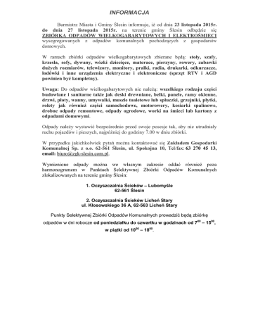 INFORMACJA Burmistrz Miasta i Gminy Ślesin informuje, iż od dnia 23 listopada 2015r. do dnia 27 listopada 2015r. na terenie gminy Ślesin odbędzie się ZBIÓRKA ODPADÓW WIELKOGABARYTOWYCH I ELEKTROŚMIECI wysegregowanych z odpadów komunalnych pochodzących z gospodarstw domowych. W ramach zbiórki odpadów wielkogabarytowych zbierane będą: stoły, szafy, krzesła, sofy, dywany, wózki dziecięce, materace, pierzyny, rowery, zabawki dużych rozmiarów, telewizory, monitory, pralki, radia, drukarki, odkurzacze, lodówki i inne urządzenia elektryczne i elektroniczne (sprzęt RTV i AGD powinien być kompletny). Uwaga: Do odpadów wielkogabarytowych nie należą: wszelkiego rodzaju części budowlane i sanitarne takie jak deski drewniane, belki, panele, ramy okienne, drzwi, płoty, wanny, umywalki, muszle toaletowe lub spłuczki, grzejniki, płytki, rolety jak również części samochodowe, motorowery, kosiarki spalinowe, drobne odpady remontowe, odpady ogrodowe, worki na śmieci lub kartony z odpadami domowymi. Odpady należy wystawić bezpośrednio przed swoje posesje tak, aby nie utrudniały ruchu pojazdów i pieszych, najpóźniej do godziny 7.00 w dniu zbiórki. W przypadku jakichkolwiek pytań można kontaktować się Zakładem Gospodarki Komunalnej Sp. z o.o. 62-561 Ślesin, ul. Spokojna 10, Tel/fax: 63 270 45 13, email: [email protected]. Wymienione odpady można we własnym zakresie oddać również poza harmonogramem w Punktach Selektywnej Zbiórki Odpadów Komunalnych zlokalizowanych na terenie gminy Ślesin: 1. Oczyszczalnia Ścieków – Lubomyśle 62-561 Ślesin 2. Oczyszczalnia Ścieków Licheń Stary ul. Kłosowskiego 36 A, 62-563 Licheń Stary Punkty Selektywnej Zbiórki Odpadów Komunalnych prowadzić będą zbiórkę odpadów w dni robocze od poniedziałku do czwartku w godzinach od 700 – 1500, w piątki od 1000 – 1800. HARMONOGRAM MOBILNEGO PUNKTU ODBIORU ODPADÓW KOMUNALNYCH WIELKOGABARYTOWYCH ORAZ ZUŻYTEGO SPRZĘTU ELEKTRYCZNEGO I ELEKTRONICZNEGO Miejscowość Data wywozu PONIEDZIAŁEK Osiedle Powstańców Wielkopolskich, Osiedle „Stare Miasto”, Osiedle „Północ”, Osiedle Krzyżka 23.XI.2015r. WTOREK Honoratka, Władysławów, Rębowo, Lubomyśle, Dąbrowa Duża, Dąbrowa Mała, Biele, Goranin, Goraninek, Lizawy, Mikorzyn, Różnowo, Biskupie Sarnowskie, Sarnowa, Florentynowo 24.XI.2015r. ŚRODA Biskupie, Kolonia Sarnowa, Ostrowąż, Giętkowo, Ostrowąż-Kolonia, Kijowiec, Kijowskie Nowiny, Kijowiec-Szyszynek, Ściany, Szyszynek, Marianowo, Szyszyn, Helenowo, Pole B, Teodorowo, Szyszyńskie Holendry, Żółwieniec, Konstantynowo, Konstantynówek, Ostrowy, Stanisławowo 25.XI.2015r. CZWARTEK Licheń Stary, Julia, Kępa, Niedźwiady Małe, Niedźwiady Duże, Półwiosek Stary, Półwiosek Nowy, Wąsoskie Holendry, Wąsosze, Wygoda, Smolarnia, Trajbudy 26.XI.2015r. PIĄTEK Głębockie Pierwsze, Głębockie Drugie, Witalisów, Półwiosek Lubstowski, Tokary, Różopole, Kolebki, Kolebki Frąsin, Kolebki Ługi, Ignacewo, Pogorzele, Smolniki, Smolniki Polskie, Wierzelin, Leśnictwo, Piotrkowice, Pogoń Gosławicka, Pogoń Lubstowska, Pogoń-Leśniczówka, Bylew, Bylew Parcele 27.XI.2015r.