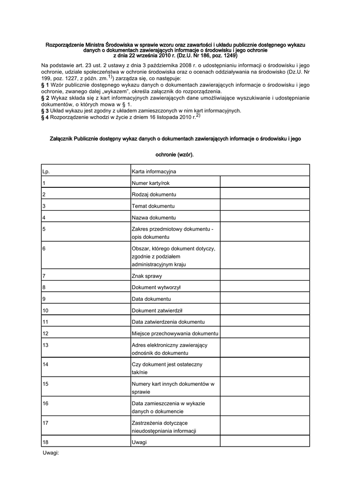Rozporządzenie Ministra Środowiska w sprawie wzoru oraz zawartości i układu publicznie dostępnego wykazu danych o dokumentach zawierających informacje o środowisku i jego ochronie z dnia 22 września 2010 r. (Dz.U. Nr 186, poz. 1249) Na podstawie art. 23 ust. 2 ustawy z dnia 3 października 2008 r. o udostępnianiu informacji o środowisku i jego ochronie, udziale społeczeństwa w ochronie środowiska oraz o ocenach oddziaływania na środowisko (Dz.U. Nr 199, poz. 1227, z późn. zm.1)) zarządza się, co następuje: § 1 Wzór publicznie dostępnego wykazu danych o dokumentach zawierających informacje o środowisku i jego ochronie, zwanego dalej „wykazem”, określa załącznik do rozporządzenia. § 2 Wykaz składa się z kart informacyjnych zawierających dane umożliwiające wyszukiwanie i udostępnianie dokumentów, o których mowa w § 1. § 3 Układ wykazu jest zgodny z układem zamieszczonych w nim kart informacyjnych. § 4 Rozporządzenie wchodzi w życie z dniem 16 listopada 2010 r.2) Załącznik Publicznie dostępny wykaz danych o dokumentach zawierających informacje o środowisku i jego ochronie (wzór). Lp. Karta informacyjna 1 Numer karty/rok 2 Rodzaj dokumentu 3 Temat dokumentu 4 Nazwa dokumentu 5 Zakres przedmiotowy dokumentu opis dokumentu 6 Obszar, którego dokument dotyczy, zgodnie z podziałem administracyjnym kraju 7 Znak sprawy 8 Dokument wytworzył 9 Data dokumentu 10 Dokument zatwierdził 11 Data zatwierdzenia dokumentu 12 Miejsce przechowywania dokumentu 13 Adres elektroniczny zawierający odnośnik do dokumentu 14 Czy dokument jest ostateczny tak/nie 15 Numery kart innych dokumentów w sprawie 16 Data zamieszczenia w wykazie danych o dokumencie 17 Zastrzeżenia dotyczące nieudostępniania informacji 18 Uwagi Uwagi: 1. Układ wykazu umożliwia wyszukiwanie informacji przez wpisanie dowolnego wyrazu lub ciągu wyrazów znajdujących się w wykazie kart informacyjnych, a także według następujących kryteriów: 1) numer karty informacyjnej; 2) rok wydania dokumentu; 3) rodzaj dokumentu; 4) nazwa dokumentu; 5) temat dokumentu; 6) obszar, którego dokument dotyczy, zgodnie z podziałem administracyjnym kraju. 2. W wykazie w karcie informacyjnej: 1) rodzaj dokumentu - należy wpisać nazwę wskazanego poniżej rodzaju dokumentu zawierającego wyszukiwaną informację o środowisku i jego ochronie: a) wnioski o wydanie decyzji, b) wnioski o udzielenie wskazań lokalizacyjnych, c) inne wnioski, d) decyzje, e) postanowienia, f) polityki, strategie, plany lub programy, g) projekty polityk, strategii, planów lub programów, h) projekty innych dokumentów, i) raporty o oddziaływaniu przedsięwzięcia na środowisko, j) inne raporty, k) przeglądy ekologiczne, l) prognozy oddziaływania na środowisko, m) wykazy zawierające informacje i dane o zakresie korzystania ze środowiska, n) rejestry, o) zgłoszenia, p) strategiczne oceny oddziaływania na środowisko, q) koncesje, pozwolenia, zezwolenia, r) analizy, opracowania ekofizjograficzne, wyniki badań i pomiarów, s) mapy akustyczne, t) świadectwa, u) sprawozdania, v) deklaracje środowiskowe, w) inne dokumenty; 2) temat dokumentu - należy wpisać temat dotyczący wyszukiwanej informacji, zgodnie z następującą listą tematów: a) ochrona powietrza, b) ochrona wód, c) ochrona powierzchni ziemi, d) ochrona przed hałasem, e) ochrona przed polami elektromagnetycznymi, f) ochrona kopalin, g) ochrona zwierząt oraz roślin, h) inne; 3) znak sprawy, dokument zatwierdził, data zatwierdzenia dokumentu, numery kart innych dokumentów w sprawie - należy wpisać wyrazy "nie dotyczy", jeżeli odpowiednio dokument nie posiada znaku sprawy, nie podlegał procedurze zatwierdzania lub w wykazie nie znajdują się inne karty dokumentów w tej samej sprawie; 4) data dokumentu - należy podać datę wydania dokumentu, datę wpływu dokumentu do organu prowadzącego wykaz lub datę aktualizacji dokumentu; 5) miejsce przechowywania dokumentu - należy wpisać nazwę i siedzibę podmiotu przechowującego dokument, a także jego dane kontaktowe (numer telefonu oraz adres poczty elektronicznej). Należy też zamieścić informację o zniszczeniu dokumentu, jeżeli dokument uległ zniszczeniu; 6) adres elektroniczny zawierający odnośnik do dokumentu - należy zamieścić odnośnik do adresu elektronicznego dokumentu, jeżeli dokument został udostępniony za pomocą powszechnie dostępnego systemu teleinformatycznego; 7) zastrzeżenia dotyczące nieudostępniania informacji - należy wskazać podstawę prawną wyłączającą możliwość udostępnienia informacji oraz zakres, w jakim informacja podlega wyłączeniu od udostępnienia. 1) Zmiany wymienionej ustawy zostały ogłoszone w Dz.U. z 2008 r. Nr 227, poz. 1505, z 2009 r. Nr 42, poz. 340, Nr 84, poz. 700 i Nr 157, poz. 1241 oraz z 2010 r. Nr 28, poz. 145, Nr 106, poz. 675, Nr 119, poz. 804, Nr 143, poz. 963 i Nr 182, poz. 1228 2) Niniejsze rozporządzenie było poprzedzone rozporządzeniem Ministra Środowiska z dnia 18 czerwca 2007 r. w sprawie wzoru publicznie dostępnego wykazu danych o dokumentach zawierających informacje o środowisku i jego ochronie (Dz.U. Nr 120, poz. 827), które na podstawie art. 173 ust. 1 ustawy z dnia 3 października 2008 r. o udostępnianiu informacji o środowisku i jego ochronie, udziale społeczeństwa w ochronie środowiska oraz o ocenach oddziaływania na środowisko traci moc z dniem 16 listopada 2010 r