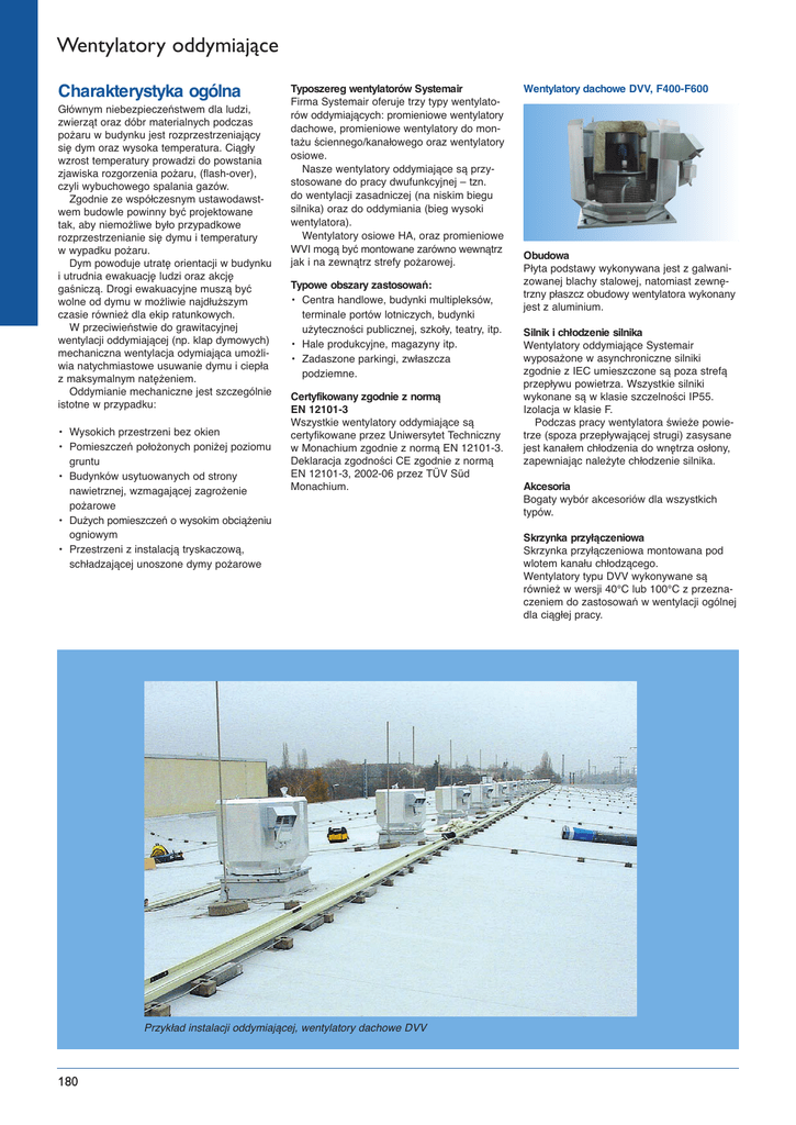 Wentylatory oddymiajàce Charakterystyka ogólna Głównym niebezpieczeństwem dla ludzi, zwierząt oraz dóbr materialnych podczas pożaru w budynku jest rozprzestrzeniający się dym oraz wysoka temperatura. Ciągły wzrost temperatury prowadzi do powstania zjawiska rozgorzenia pożaru, (flash-over), czyli wybuchowego spalania gazów. Zgodnie ze współczesnym ustawodawstwem budowle powinny być projektowane tak, aby niemożliwe było przypadkowe rozprzestrzenianie się dymu i temperatury w wypadku pożaru. Dym powoduje utratę orientacji w budynku i utrudnia ewakuację ludzi oraz akcję gaśniczą. Drogi ewakuacyjne muszą być wolne od dymu w możliwie najdłuższym czasie również dla ekip ratunkowych. W przeciwieństwie do grawitacyjnej wentylacji oddymiającej (np. klap dymowych) mechaniczna wentylacja odymiająca umożliwia natychmiastowe usuwanie dymu i ciepła z maksymalnym natężeniem. Oddymianie mechaniczne jest szczególnie istotne w przypadku: • Wysokich przestrzeni bez okien • Pomieszczeń położonych poniżej poziomu gruntu • Budynków usytuowanych od strony nawietrznej, wzmagającej zagrożenie pożarowe • Dużych pomieszczeń o wysokim obciążeniu ogniowym • Przestrzeni z instalacją tryskaczową, schładzającej unoszone dymy pożarowe Typoszereg wentylatorów Systemair Firma Systemair oferuje trzy typy wentylatorów oddymiających: promieniowe wentylatory dachowe, promieniowe wentylatory do montażu ściennego/kanałowego oraz wentylatory osiowe. Nasze wentylatory oddymiające są przystosowane do pracy dwufunkcyjnej – tzn. do wentylacji zasadniczej (na niskim biegu silnika) oraz do oddymiania (bieg wysoki wentylatora). Wentylatory osiowe HA, oraz promieniowe WVI mogą być montowane zarówno wewnątrz jak i na zewnątrz strefy pożarowej. Typowe obszary zastosowań: • Centra handlowe, budynki multipleksów, terminale portów lotniczych, budynki użyteczności publicznej, szkoły, teatry, itp. • Hale produkcyjne, magazyny itp. • Zadaszone parkingi, zwłaszcza podziemne. Certyfikowany zgodnie z normą EN 12101-3 Wszystkie wentylatory oddymiające są certyfikowane przez Uniwersytet Techniczny w Monachium zgodnie z normą EN 12101-3. Deklaracja zgodności CE zgodnie z normą EN 12101-3, 2002-06 przez TÜV Süd Monachium. Przykład instalacji oddymiającej, wentylatory dachowe DVV 180 Wentylatory dachowe DVV, F400-F600 Obudowa Płyta podstawy wykonywana jest z galwanizowanej blachy stalowej, natomiast zewnętrzny płaszcz obudowy wentylatora wykonany jest z aluminium. Silnik i chłodzenie silnika Wentylatory oddymiające Systemair wyposażone w asynchroniczne silniki zgodnie z IEC umieszczone są poza strefą przepływu powietrza. Wszystkie silniki wykonane są w klasie szczelności IP55. Izolacja w klasie F. Podczas pracy wentylatora świeże powietrze (spoza przepływającej strugi) zasysane jest kanałem chłodzenia do wnętrza osłony, zapewniając należyte chłodzenie silnika. Akcesoria Bogaty wybór akcesoriów dla wszystkich typów. Skrzynka przyłączeniowa Skrzynka przyłączeniowa montowana pod wlotem kanału chłodzącego. Wentylatory typu DVV wykonywane są również w wersji 40°C lub 100°C z przeznaczeniem do zastosowań w wentylacji ogólnej dla ciągłej pracy. Wentylatory oddymiajàce KBR/F WVA WVI Wentylatory do montażu ściennego WVA/WVI, F400-F600 Obudowa Wentylator o zwartej, wytrzymałej, spawanej konstrukcji. Obudowa z stali galwanizowanej, lakierowane proszkowo RAL 7032. Wentylatory WVI posiadają przyłącze kanału do chłodzenia silnika. WVA muszą być instalowane na zewnątrz strefy pożarowej, bezpośrednio przy ścianie zewnętrznej. Wentylatory WVI wyposażone są w osłonę termiczną silnika i mogą być montowane wewnątrz strefy pożarowej. Silnik i chłodzenie silnika Wentylatory oddymiające Systemair wyposażone w asynchroniczne silniki zgodnie z IEC. Wszystkie silniki wykonane są w klasie szczelności IP55. Izolacja w klasie F. W wykonaniu jedno lub dwubiegowym. Podczas pracy wentylatora świeże powietrze (spoza przepływającej strugi) zasysane jest kanałem do wnętrza osłony, zapewniając należyte chłodzenie silnika. Wirnik Wentylatory serii DVV wyposażone są w koła wirnikowe z łopatkami wygiętymi do tyłu. Koło wirnikowe w wersji 400°C wykonane jest z galwanizowanej blachy stalowej a w wersji 600°C – ze stali nierdzewnej. Koło wirnikowe wyważane jest dynamicznie zgodnie z ISO 1940-1 klasa Q6.3 Akcesoria Bogaty wybór akcesoriów – elementy adaptacyjne do podłączenia z systemem kanałów, kanały chłodzące wsporniki do montażu na ścianie, kanały wyrzutowe. Wentylatory kanałowe KBR/F Obudowa Obudowa wykonywana ze stali galwanizowanej. KBR/F muszą być instalowane na zewnątrz strefy pożarowej. Silnik Wentylatory, wyposażone w asynchroniczne silniki zgodnie z IEC. W przypadku stosowania wentylatora również dla ciągłej pracy możliwa jest (z małymi wyjątkami) regulacja prędkości obrotowej poprzez obniżanie napięcia zasilania przy użyciu transformatora. Wirnik Koło wirnikowe wykonane jest z galwanizowanej blachy stalowej. Przystosowane do pracy dwufunkcyjnej – tzn. do wentylacji ogólnej, szczególnie do wyciągu z okapów kuchennych do temperatury 150°C oraz do oddymiania 400°C/2h. HA Wentylatory osioweHA, F300-F600 Obudowa Obudowa wykonywana ze stali galwanizowanej. Skrzynka przyłączeniowa w wersji F600 w środku kanału chłodzącego, w wersji F300/F400 na zewnętrznej obudowie wentylatora, montowana na konsoli montażowej. Silnik Wentylatory oddymiające wyposażone są w asynchroniczne silniki zgodnie z IEC odporne na wysoką temperaturę, jedno lub dwubiegowe. Izolacja w klasie F lub G. W wersji F 600 – silnik w obudowie z kanałem chłodzącym. Wirnik Stalowe wirniki wykonane w technologii spawania. W wersji F300 dostępne również z nastawialnymi łopatkami dobieranymi fabrycznie do założonych warunków pracy. Koło wirnikowe wyważane jest statycz