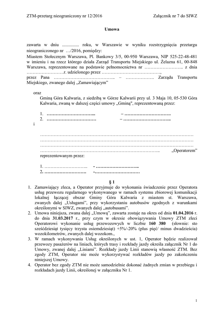 Załącznik nr 7 do SIWZ ZTM-przetarg nieograniczony nr 12/2016 Umowa zawarta w dniu ............... roku, w Warszawie w wyniku rozstrzygnięcia przetargu nieograniczonego nr …/2016, pomiędzy: Miastem Stołecznym Warszawa, Pl. Bankowy 3/5, 00-950 Warszawa, NIP 525-22-48-481 w imieniu i na rzecz którego działa Zarząd Transportu Miejskiego ul. Żelazna 61, 00-848 Warszawa, reprezentowane na podstawie pełnomocnictwa nr …………………….. z dnia …………………….r. udzielonego przez …………………………………, przez Pana ………………………………….. – ………………. Zarządu Transportu Miejskiego, zwanego dalej „Zamawiającym” oraz Gminą Góra Kalwaria, z siedzibą w Górze Kalwarii przy ul. 3 Maja 10, 05-530 Góra Kalwaria, zwaną w dalszej części umowy „Gminą", reprezentowaną przez: 1. …………………………... 2. …………………………… – …………………………. – ………………………….. i ………………………………………………………………………………………… ………………………………………………………………………………………… ………………………………………………………………………………………… …………………………………………………………………….. „Operatorem” reprezentowanym przez: 1. ……………………….. 2. ………………………. - ……………………….. -………………………… §1 1. Zamawiający zleca, a Operator przyjmuje do wykonania świadczenie przez Operatora usług przewozu regularnego wykonywanego w ramach systemu zbiorowej komunikacji lokalnej łączącej obszar Gminy Góra Kalwaria z miastem st. Warszawa, zwanych dalej „Usługami”, przy wykorzystaniu autobusów zgodnych z warunkami określonymi w SIWZ, zwanych dalej „autobusami”. 2. Umowa niniejsza, zwana dalej „Umową”, zawarta zostaje na okres od dnia 01.04.2016 r. do dnia 31.03.2017 r., przy czym w okresie obowiązywania Umowy ZTM zleci Operatorowi wykonanie usług przewozowych w liczbie 160 380 (słownie: sto sześćdziesiąt tysięcy trzysta osiemdziesiąt) +5%/-20% (plus pięć/ minus dwadzieścia) wozokilometrów, zwanych dalej wozokom., 3. W ramach wykonywania Usług określonych w ust. 1, Operator będzie realizował przewozy pasażerów na liniach, których trasy i rozkłady jazdy określa załącznik Nr 1 do Umowy, zwanej dalej „Liniami”. Rozkłady jazdy Linii stanowią własność ZTM. Bez zgody ZTM, Operator nie może wykorzystywać rozkładów jazdy po zakończeniu niniejszej Umowy. 4. Operator bez zgody ZTM nie może samodzielnie dokonać żadnych zmian w przebiegu i rozkładach jazdy Linii, określonej w załączniku Nr 1. 1 ZTM-przetarg nieograniczony nr 12/2016 Załącznik nr 7 do SIWZ §2 1. Operator oświadcza i zapewnia, że wszystkie autobusy przeznaczone przez niego do wykonywania usług będących przedmiotem niniejszej Umowy: a) spełniać będą wszystkie wymagania wynikające z postanowień SIWZ oraz przepisów obowiązującego prawa dotyczących wykonywania autobusowych usług przewozowych w zbiorowej komunikacji lokalnej, b) w przypadku zmiany przepisów określających wymagania dotyczące autobusów, pojazdy te dostosowane zostaną niezwłocznie do zmienionych wymogów. 2. W okresie realizacji Usług Operator zobowiązuje się do przestrzegania zasad określonych w załączniku nr 8 do Umowy. 3. Operator zobowiązuje się do honorowania w autobusach obsługujących Linie: a) następujących rodzajów ważnych biletów obowiązujących w 1 oraz 2 strefie biletowej ZTM emitowanych przez ZTM: - dobowych, - weekendowych, - weekendowych grupowych, - 30-dniowych, - 90-dniowych, - biletów imiennych dla dziecka z rodziny posiadającej troje dzieci, - seniora, b) biletów emitowanych lub honorowanych przez inne podmioty, które zawarły stosowne umowy w tej sprawie z m.st. Warszawa, c) uprawnień do ulgowych albo bezpłatnych przejazdów środkami lokalnego transportu zbiorowego w Warszawie, wynikających z ustaw i aktów prawa miejscowego uchwalonych przez Radę i inne właściwe organy m.st. Warszawy, wymienionych w załączniku Nr 3. Zmiany tych przepisów od chwili ich wejścia w życie będą miały automatyczne zastosowanie do przewozów wykonywanych na Liniach stanowiących przedmiot niniejszej Umowy. d) Na trasach linii funkcjonujących w dwóch strefach biletowych obowiązują przystanki graniczne określone odpowiednią uchwałą Rady m. st. Warszawy. 4. Operator będzie emitował i sprzedawał niżej wymienione rodzaje biletów w cenie określonej przez Gminę Góra Kalwaria zgodnie z obowiązującymi przepisami: bilet jednorazowy normalny w cenie nie wyższej niż - 3,60 zł, bilet jednorazowy ulgowy w cenie nie wyższej niż - 1,80 zł, bilet miesięczny na jedną linię normalny w cenie nie wyższej niż - 80,00 zł, bilet miesięczny na jedną linię ulgowy w cenie nie wyższej niż - 40,00 zł, z tym, że obowiązek nabycia ww. biletów nie dotyczy osób posiadających bilety lub uprawnienia do bezpłatnych przejazdów, o których mowa w ust. 3 powyżej. 5. Przewóz bagażu i zwierząt na Linii nie podlega opłacie. 6. Kontrola i windykacja należności z tytułu przejazdu autobusem na Liniach bez ważnego dokumentu przewozowego, dokonywana jest przez Operatora. 7. Operator zobowiązany jest do wyposażenia osób dokonujących kontroli biletów w odpowiednie urządzenia umożliwiające weryfikację ważności biletów wymienionych w § 2 ust. 3 pkt a. 8. Na pisemny wniosek, Operator w terminie 14 dni przekazuje Zamawiającemu informacje dotyczące liczby i rodzajów sprzedanych biletów określonych w § 2 ust 4. 2 ZTM-przetarg nieograniczony nr 12/2016 Załącznik nr 7 do SIWZ §3 1. Strony zgodnie potwierdzają, że czynności dotyczące utrzymania w czystości, odśnieżania oraz konserwacji nawierzchni (je