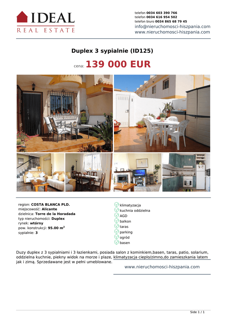 telefon 0034 603 390 766 telefon 0034 616 954 502 telefon biuro 0034 865 68 79 45 [email protected] www.nieruchomosci-hiszpania.com Duplex 3 sypialnie (ID125) cena: region: COSTA BLANCA PLD. miejscowość: Alicante dzielnica: Torre de la Horadada typ nieruchomości: Duplex rynek: wtórny pow. konstrukcji: 95.00 m2 sypialnie: 3 139 000 EUR klimatyzacja kuchnia oddzielna AGD balkon taras parking ogród basen Duzy duplex z 3 sypialniami i 3 łazienkami, posiada salon z kominkiem,basen, taras, patio, solarium, oddzielna kuchnie, piekny widok na morze i plaze, klimatyzacja cieplo/zimno,do zamieszkania latem jak i zimą. Sprzedawane jest w pełni umeblowane. www.nieruchomosci-hiszpania.com Side 1 / 1 Powered by TCPDF (www.tcpdf.org)