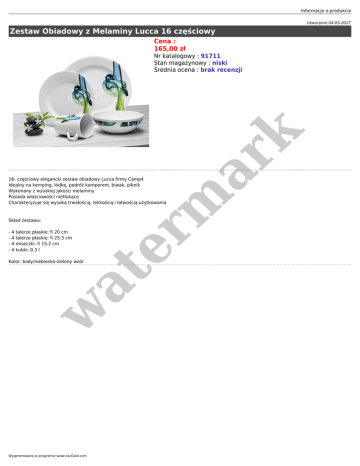 Informacje o produkcie Utworzono 04-03-2017 Zestaw Obiadowy z Melaminy Lucca 16 częściowy Cena : 165,00 zł er m ar k Nr katalogowy : 91711 Stan magazynowy : niski Średnia ocena : brak recenzji 16- częściowy elegancki zestaw obiadowy Lucca firmy Camp4 Idealny na kemping, łódkę, podróż kamperem, biwak, piknik Wykonany z wysokiej jakości melaminy Posiada właściowości nietłukące Charakteryzuje się wysoką trwałością, lekkością i łatwością użytkowania Skład zestawu: - 4 talerze płaskie: fi 20 cm - 4 talerze płaskie: fi 25.3 cm - 4 miseczki: fi 15.2 cm - 4 kubki: 0.3 l w at Kolor: biały/niebiesko-zielony wzór Wygenerowano w programie www.oscGold.com