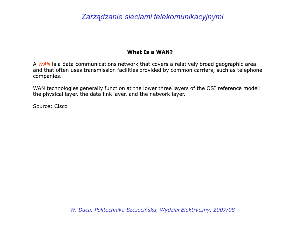 Zarządzanie sieciami telekomunikacyjnymi What Is a WAN? A WAN is a data communications network that covers a relatively broad geographic area and that often uses transmission facilities provided by common carriers, such as telephone companies. WAN technologies generally function at the lower three layers of the OSI reference model: the physical layer, the data link layer, and the network layer. Source: Cisco W. Daca, Politechnika Szczecińska, Wydział Elektryczny, 2007/08 Zarządzanie sieciami telekomunikacyjnymi What Is a WAN? Wide Area Network (WAN) is a computer network that covers a broad area (i.e., any network whose communications links cross metropolitan, regional, or national boundaries [1]). Or, less formally, a network that uses routers and public communications links [1]. Contrast with personal area networks (PANs), local area networks (LANs), campus area networks (CANs), or metropolitan area networks (MANs) which are usually limited to a room, building, campus or specific metropolitan area (e.g., a city) respectively. The largest and most wellknown example of a WAN is the Internet. Source: Wikipedia W. Daca, Politechnika Szczecińska, Wydział Elektryczny, 2007/08 Zarządzanie sieciami telekomunikacyjnymi Popular WAN protocols mapped to the OSI Reference Model: W. Daca, Politechnika Szczecińska, Wydział Elektryczny, 2007/08 Zarządzanie sieciami telekomunikacyjnymi Point-to-Point Links A point-to-point link provides a single, pre-established WAN communications path from the customer premises through a carrier network, such as a telephone company, to a remote network. Point-to-point lines are usually leased from a carrier and thus are often called leased lines. For a point-to-point line, the carrier allocates pairs of wire and facility hardware to your line only. These circuits are generally priced based on bandwidth required and distance between the two connected points. Point-to-point links are generally more expensive than shared services such as Frame Relay. W. Daca, Politechnika Szczecińska, Wydział Elektryczny, 2007/08 Zarządzanie sieciami telekomunikacyjnymi Circuit Switching Switched circuits allow data connections that can be initiated when needed and terminated when communication is complete. This works much like a normal telephone line works for voice communication. Integrated Services Digital Network (ISDN) is a good example of circuit switching. When a router has data for a remote site, the switched circuit is initiated with the circuit number of the remote network. In the case of ISDN circuits, the device actually places a call to the telephone number of the remote ISDN circuit. When the two networks are connected and authenticated, they can transfer data. When the data transmission is complete, the call can be terminated. W. Daca, Politechnika Szczecińska, Wydział Elektryczny, 2007/08 Zarządzanie sieciami telekomunikacyjnymi Packet Switching Packet switching is a WAN technology in which users share common carrier resources. Because this allows the carrier to make more efficient use of its infrastructure, the cost to the customer is generally much better than with point-to-point lines. In a packet switching setup, networks have connections into the carrier's network, and many customers share the carrier's network. The carrier can then create virtual circuits between customers' sites by which packets of data are delivered from one to the other through the network. The section of the carrier's network that is shared is often referred to as a cloud. Some examples of packet-switching networks include Asynchronous Transfer Mode (ATM), Frame Relay, Switched Multimegabit Data Services (SMDS), and X.25. W. Daca, Politechnika Szczecińska, Wydział Elektryczny, 2007/08 Zarządzanie sieciami telekomunikacyjnymi WAN Virtual Circuits A virtual circuit is a logical circuit created within a shared network between two network devices. Two types of virtual circuits exist: switched virtual circuits (SVCs) and permanent virtual circuits (PVCs). SVCs are virtual circuits that are dynamically established on demand and terminated when transmission is complete. Communication over an SVC consists of three phases: circuit establishment, data transfer, and circuit termination. The establishment phase involves creating the virtual circuit between the source and destination devices. Data transfer involves transmitting data between the devices over the virtual circuit, and the circuit termination phase involves tearing down the virtual circuit between the source and destination devices. SVCs are used in situations in which data transmission between devices is sporadic, largely because SVCs increase bandwidth used due to the circuit establishment and termination phases, but they decrease the cost associated with constant virtual circuit availability. PVC is a permanently established virtual circuit that consists of one mode: data transfer. PVCs are used in situations in which data transfer between devices is constant. PVCs decrease the bandwidth use associated with the establishment and termination of virtual circuits, but they increase costs due to constant virtual circuit availability. PVCs are generally configured by the service provider when an order is placed for service. W. Daca, Politechnika Szczecińska, Wydział Elektryczny, 2007/08 Zarządzanie sieciami telekomunikacyjnymi WAN Dialup Services Dialup services offer cost-effective methods for connectivity across WANs. Two popular dialup implementations are dial-on-demand routing (DDR) and dial backup. DDR is a technique whereby a router can dynamically initiate a call on a switched circuit when it needs to send data. In a DDR setup, the router is configured to initiate the call when certain criteria are met, such as a particular type of network traffic needing to be transmitted. When the connection is made, traffic passes over the line. The router configuration specifies an idle timer that tells the router to drop the conne