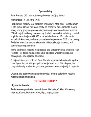 Opis rodziny Pani Renata (30 l.)samotnie wychowuje dwójkę dzieci: Małgorzatę ( 4 l.) i Jana ( 6 l.) Problemem rodziny jest problem finansowy. Mąż pani Renaty umarł 3 lata temu. Dzieci nie mają renty po zmarłym ojcu. Kobieta nie ma stałej pracy, jedynie pracuje dorywczo a jej wynagrodzenie wynosi 350 zł. Jej dodatkowy miesięczny dochód to zasiłek rodzinny, zasiłek z tytułu samotnej matki i 500 + na każde dziecko. Po odliczeniu wszelkich kosztów, rodzinie pozostaje niespełna ok. 520 zł na osobę. Rodzina mieszka bardzo skromnie. Nie posiadają łazienki, ani centralnego ogrzewania. Mimo trudności rodzina nie poddaje się, wzajemnie się wspiera. Pani Renata i jej dzieci najbardziej lubią spędzać wspólnie czas, np. bawiąc się, czy oglądać telewizję. Z najważniejszych potrzeb Pani Renata wymieniła kołdrę dla synka, oraz żywność, na którą często brakuje funduszy. Nie ukrywa, że przydałaby się kuchenka gazowa, ponieważ obecna jest już popsuta. Uwaga: dla zachowania anonimowości, imiona członków rodziny mogły zostać zmienione POTRZEBY RODZINY I Żywność trwała: Podstawowe produkty żywnościowe: Herbata, Cukier, Konserwy mięsne, Kawa, Makaron, Olej, Ryż, Mąka, Dżem II Środki czystości i artykuły higieniczne Potrzebne środki czystości: Proszek do prania, Płyn do mycia naczyń, Mydło/żel myjący, Pasta do zębów, Płyny czyszczące, Szampon, Szczoteczka do zębów Artykuły dziecięce: chusteczki nawilżające III ODZIEŻ I OBUWIE Odzież Rodzaj Lp Płeć (letnie/zimowe/ przejściowe) Kategoria (bluzka, Rozmiar Sylwetka Uwagi spodnie, kurtka itp.) 1 K letnie/zimowe bluzki, koszulki, spodnie, spodenki 110116 2 M letnie/zimowe bluzki, koszulki, spodnie, spodenki 128 3 K letnie koszulki, spodnie M-38 Obuwie Rodzaj (letnie / Lp Płeć zimowe / przejściowe) 1 K letnie Kategoria (klapki, tenisówki, kozaki itp.) Rozmiar Uwagi 27-30 2 M letnie 33-35 3 K letnie 38 V Wyposażenie mieszkania: Kołdra, Ręczniki, Pościel VI BRAKUJĄCE SPRZĘTY GOSPODARSTWA DOMOWEGO: kuchenka gazowa VIII Szczególne upominki: zabawki dla dzieci żywność trwała ponieważ często brakuje na nią funduszy Kuchenka gazowaponieważ ta jest popsuta Kołdra ponieważ przydałaby się dla synka