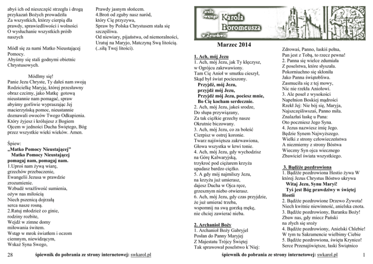 abyś ich od nieszczęść strzegła i drogą przykazań Bożych prowadziła Za wszystkich, którzy cierpią dla prawdy, sprawiedliwości i wolności O wysłuchanie wszystkich próśb naszych Módl się za nami Matko Nieustającej Pomocy. Abyśmy się stali godnymi obietnic Chrystusowych. Prawdy jasnym słońcem. 4.Broń od zguby nasz naród, który Cię przyzywa, Spraw by Polska Chrystusem stała się szczęśliwa. Od niewiary, pijaństwa, od niemoralności, Uratuj na Maryjo, Matczyną Swą litością. (..siłą Twej litości). Módlmy się! Panie Jezu Chryste, Ty dałeś nam swoją Rodzicielkę Maryję, której przesławny obraz czcimy, jako Matkę gotową nieustannie nam pomagać, spraw abyśmy gorliwie wypraszając Jej macierzyńską pomoc, nieustannie doznawali owoców Twego Odkupienia. Który żyjesz i królujesz z Bogiem Ojcem w jedności Ducha Świętego, Bóg przez wszystkie wieki wieków. Amen. Śpiew: „Matko Pomocy Nieustającej” Matko Pomocy Nieustającej pomagaj nam, pomagaj nam. 1.Uproś nam żywą wiarę, grzechów przebaczenie, Ewangelii Jezusa w prawdzie zrozumienie. Wzbudź wrażliwość sumienia, ożyw nas miłością Niech pszenicą dojrzałą serca nasze rosną. 2.Ratuj młodzież co ginie, rodziny rozbite, Wejdź w zimne domy miłowania świtem. Wstąp w mrok światłem i oczom ciemnym, niewidzącym, Wskaż Syna Swego, 28 śpiewnik do pobrania ze strony internetowej: swkarol.pl Marzec 2014 1. Ach, mój Jezu 1. Ach, mój Jezu, jak Ty klęczysz, w Ogrójcu zakrwawiony. Tam Cię Anioł w smutku cieszył, Skąd był świat pocieszony. Przyjdź, mój Jezu, przyjdź mój Jezu, Przyjdź mój Jezu, pociesz mnie, Bo Cię kocham serdecznie. 2. Ach, mój Jezu, jakeś srodze, Do słupa przywiązany, Za tak ciężkie grzechy nasze Okrutnie biczowany. 3. Ach, mój Jezu, co za boleść Cierpisz w ostrej koronie. Twarz najświętsza zakrwawiona, Głowa wszystka w krwi tonie. 4. Ach, mój Jezu, gdy wychodzisz na Górę Kalwaryjską, trzykroć pod ciężarem krzyża upadasz bardzo ciężko. 5. A gdy mój najmilszy Jezu, na krzyżu już umierasz, dajesz Ducha w Ojca ręce, grzesznym niebo otwierasz. 6. Ach, mój Jezu, gdy czas przyjdzie, że już umierać trzeba, wspomnij na swą gorzką mękę, nie chciej zawierać nieba. 2. Archanioł Boży 1. Archanioł Boży Gabryjel Posłan do Panny Maryjej Z Majestatu Trójcy Świętej Tak sprawował poselstwo k`Niej: Zdrowaś, Panno, łaskiś pełna, Pan jest z Tobą, to rzecz pewna! 2. Panna się wielce zdumiała Z poselstwa, które słyszała. Pokorniuchno się skłoniła Jako Panna świątobliwa. Zasmuciła się z tej mowy, Nic nie rzekła Aniołowi. 3. Ale poseł z wysokości Napełnion Boskiej mądrości Rzekł Jej: Nie bój się, Maryja, Najszczęśliwszaś, Panno miła. Znalazłaś łaskę u Pana: Oto poczniesz Jego Syna. 4. Jezus nazwiesz imię Jego. Będzie Synem Najwyższego. Wielki z strony człowieczeństwa A niezmierny z strony Bóstwa Wieczny Syn ojca wiecznego Zbawiciel świata wszystkiego. 3. Bądźże pozdrowiona 1. Bądźże pozdrowiona Hostio żywa W której Jezus Chrystus Bóstwo ukrywa Witaj Jezu, Synu Maryi! Tyś jest Bóg prawdziwy w świętej Hostii 2. Bądźże pozdrowione Drzewo Żywota! Niech kwitnie niewinność, anielska cnota. 3. Bądźże pozdrowiony, Baranku Boży! Zbaw nas, gdy miecz Pański na złych się sroży 4. Bądźże pozdrowiony, Anielski Chlebie! W tym tu Sakramencie wielbimy Ciebie 5. Bądźże pozdrowiona, święta Krynico! Serce Przenajświętsze, łaski Świątnico śpiewnik do pobrania ze strony internetowej: swkarol.pl 1 6. Bądźże pozdrowiony, Boski Kapłanie! Przyjm nasze ofiary, usłysz błaganie 7. Bądźże pozdrowiona, żywa Ofiaro! Broń nas przed doczesną i wieczną karą 8. Bądźże pozdrowiony, dobry Pasterzu! Tyś dał duszę swoją za nas na krzyżu 9. Bądźże pozdrowiony, wszechmocny Boże! Już Cię kocham szczerze, jak serce może 4. Blisko, blisko Blisko, blisko, blisko jesteś Panie mój, Blisko tak, że czuję tchnienie Twe. I przychodzisz do mnie już dotykasz mnie, Łaską przebaczenia karmisz moją duszę. 5. Bo góry mogą ustąpić Bo góry mogą ustąpić, bo góry mogą ustąpić i pagórki się zachwiać, Ale miłość moja, miłość moja nigdy nie odstąpi od ciebie, mówi Pan. 6. Bóg, mój Pan daje mi moc Bóg, mój Pan daje mi moc, On swą dłonią przygarnia mnie, Życiu memu nadaje sens, Z Nim w swym sercu kroczyć chcę. 7. Chrystus, Chrystus Chrystus, Chrystus, to nadzieja cała nasza Umierając zło zwyciężył, pokój nam ogłasza. on do Ojca nas prowadzi, miłość czyni życia prawem. Chrystus naszym jest pokojem, naszym pojednaniem! 1. On jest słowem nad wiekami, pierworodnym pośród stworzeń. Bóg przez Niego dał nam życie 2 i ukazał nam swą chwałę. 2. To On głową jest Kościoła I początkiem wszystkich rzeczy. Zechciał Bóg, by cała pełnia w Jego ciele zamieszkała. 3. Pokój przyszedł On budować między ludźmi dobrej woli. Z Bogiem znowu nas pojednał, gdy na krzyżu oddał życie. 4. On jednoczy we wspólnocie, przezwyciężył mur wrogości. Jak brat starszy nas prowadzi do radości swego Ojca. 8. Chwal, Syjonie, Zbawiciela 1. Chwal, Syjonie, Zbawiciela, chwal pieśniami wśród wesela Wodza i Pasterza rzesz. Ile zdołasz, sław Go śmiało, bo przewyższa wszystko chwałą, co wyśpiewać pieśnią chcesz. 2. Chwały przedmiot nad podziwy, chleb żywiący, pokarm żywy dzisiaj się przedkłada nam. Za wieczerzy świętym stołem Pan Go łamiąc z braćmi społem, Apostołom dał Go sam. 3. Z pełnej piersi niech brzmią pienia, wdzięcznym hołdem uwielbienia sławmy gromko Króla chwał. Uroczysty dzień się święci, co przekazać ma pamięci, jak się stół ten prawem stał. 4. W uczcie tej nowego Pana Pascha nowym prawem dana faze dawne kończy już. Przeszłość starą nowa era, cień rozprasza prawda szczera, pierzcha noc przed blaskiem zórz. 5. Co uczynił przy wieczerzy, Chrystus wskazał, że należy spełnia