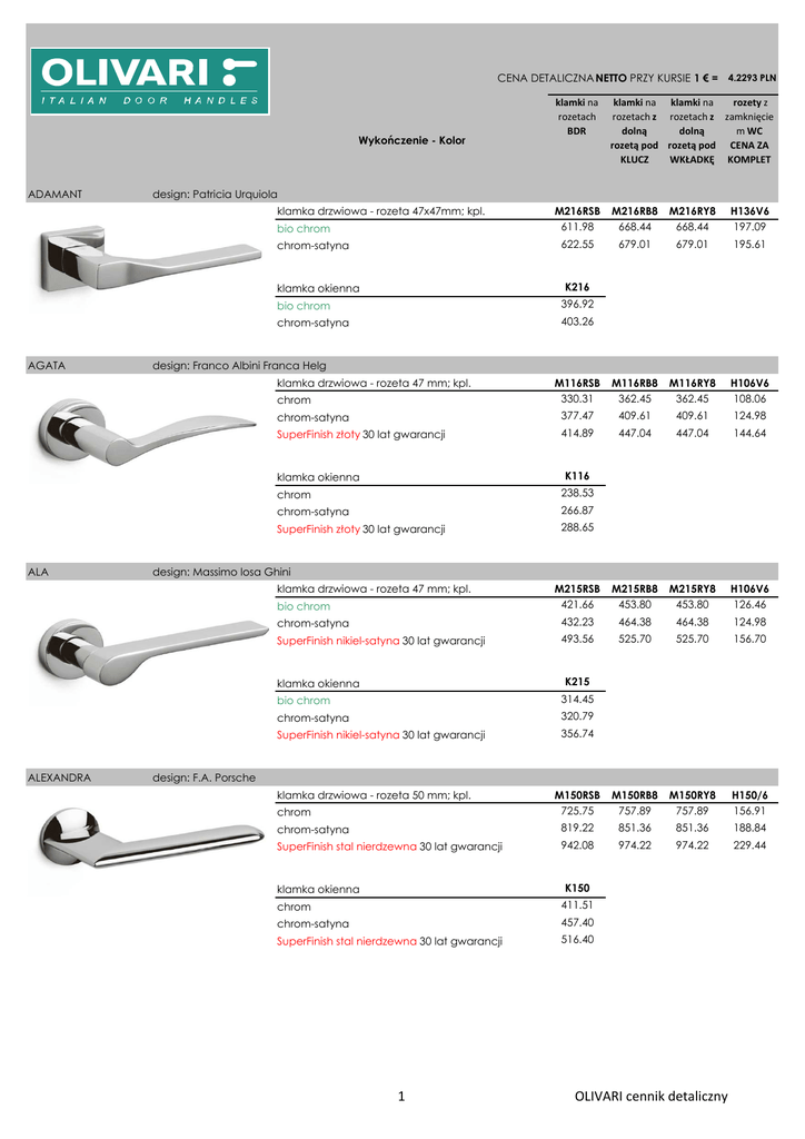 CENA DETALICZNA NETTO PRZY KURSIE 1 € = 4.2293 PLN klamki na rozetach BDR klamki na klamki na rozety z rozetach z rozetach z zamknięcie dolną dolną m WC rozetą pod rozetą pod CENA ZA KLUCZ WKŁADKĘ KOMPLET M216RSB 611.98 M216RB8 668.44 M216RY8 668.44 H136V6 197.09 622.55 679.01 679.01 195.61 M116RSB 330.31 M116RB8 362.45 M116RY8 362.45 H106V6 108.06 chrom-satyna 377.47 409.61 409.61 124.98 SuperFinish złoty 30 lat gwarancji 414.89 447.04 447.04 144.64 M215RSB 421.66 M215RB8 453.80 M215RY8 453.80 H106V6 126.46 chrom-satyna 432.23 464.38 464.38 124.98 SuperFinish nikiel-satyna 30 lat gwarancji 493.56 525.70 525.70 156.70 M150RSB 725.75 M150RB8 757.89 M150RY8 757.89 H150/6 156.91 chrom-satyna 819.22 851.36 851.36 188.84 SuperFinish stal nierdzewna 30 lat gwarancji 942.08 974.22 974.22 229.44 Wykończenie - Kolor ADAMANT design: Patricia Urquiola klamka drzwiowa - rozeta 47x47mm; kpl. bio chrom chrom-satyna K216 klamka okienna AGATA bio chrom 396.92 chrom-satyna 403.26 design: Franco Albini Franca Helg klamka drzwiowa - rozeta 47 mm; kpl. chrom K116 klamka okienna ALA chrom 238.53 chrom-satyna 266.87 SuperFinish złoty 30 lat gwarancji 288.65 design: Massimo losa Ghini klamka drzwiowa - rozeta 47 mm; kpl. bio chrom K215 klamka okienna ALEXANDRA bio chrom 314.45 chrom-satyna 320.79 SuperFinish nikiel-satyna 30 lat gwarancji 356.74 design: F.A. Porsche klamka drzwiowa - rozeta 50 mm; kpl. chrom K150 klamka okienna chrom 411.51 chrom-satyna 457.40 SuperFinish stal nierdzewna 30 lat gwarancji 516.40 1 OLIVARI cennik detaliczny CENA DETALICZNA NETTO PRZY KURSIE 1 € = 4.2293 PLN klamki na rozetach BDR Wykończenie - Kolor ARC "Basse" design: Rodolfo Dordoni klamka drzwiowa - rozeta 51x51mm; kpl. ASTER M225RSBB M225RB8B M225RY8B H117V6B chrom 621.07 677.53 677.53 156.48 chrom-satyna 668.23 724.69 724.69 173.40 M174RSB 330.10 M174RB8 362.24 M174RY8 362.24 H107R6 108.06 złoty/drewno-wiśnia 382.75 414.89 414.89 108.06 chrom/chrom-satyna 330.10 362.24 362.24 108.06 chrom-satyna/drewno wiśnia 428.85 460.99 460.99 124.98 SuperFinish złoty/złoty-satyna 30 lat gwarancji 425.89 458.03 458.03 144.64 SuperFinish złoty/drewno-wiśnia 30 lat gwarancji 466.70 498.85 498.85 144.64 M174RSB 295.84 M174RB8 327.98 M174RY8 327.98 H107R6 108.06 chrom-satyna/poliester 343.00 375.14 375.14 124.98 SuperFinish złoty/poliester 30 lat gwarancji 380.43 412.57 412.57 144.64 klamka okienna K225B chrom 406.44 chrom-satyna 434.77 design: Penta Associati klamka drzwiowa - rozeta 47 mm; kpl. złoty/złoty-satyna K174 klamka okienna ASTER klamki na klamki na rozety z rozetach z rozetach z zamknięcie dolną dolną m WC rozetą pod rozetą pod CENA ZA KLUCZ WKŁADKĘ KOMPLET złoty/złoty-satyna 259.26 złoty/drewno-wiśnia 286.11 chrom/chrom-satyna 259.26 chrom-satyna/drewno wiśnia 308.53 SuperFinish złoty/złoty-satyna 30 lat gwarancji 315.72 SuperFinish złoty/drewno-wiśnia 30 lat gwarancji 335.38 design: Penta Associati klamka drzwiowa - rozeta 47 mm; kpl. chrom/poliester klamka okienna K174 chrom/poliester 241.70 chrom-satyna/poliester 265.39 SuperFinish złoty/poliester 30 lat gwarancji 291.61 2 OLIVARI cennik detaliczny CENA DETALICZNA NETTO PRZY KURSIE 1 € = 4.2293 PLN klamki na rozetach BDR klamki na klamki na rozety z rozetach z rozetach z zamknięcie dolną dolną m WC rozetą pod rozetą pod CENA ZA KLUCZ WKŁADKĘ KOMPLET M185RSB 251.43 M185RB8 283.57 M185RY8 283.57 H106V6 108.06 złoty-satyna 291.40 323.54 323.54 124.98 chrom 251.43 283.57 283.57 108.06 chrom-satyna 298.59 330.73 330.73 124.98 SuperFinish złoty 30 lat gwarancji 336.02 368.16 368.16 144.64 SuperFinish nikiel-satyna 30 lat gwarancji 359.91 392.06 392.06 156.70 SuperFinish stal nierdzewna 30 lat gwarancji 359.91 392.06 392.06 156.70 SuperFinish antracyt-satyna 30 lat gwarancji 400.30 432.45 432.45 174.88 M164RSB 684.51 M164RB8 716.65 M164RY8 716.65 H107R6 108.06 chrom-satyna/szkło 724.48 756.62 756.62 124.98 SuperFinish złoty/szkło 30 lat gwarancji 769.10 801.24 801.24 144.64 Wykończenie - Kolor AURELIA design: Penta Associati klamka drzwiowa - rozeta 47 mm; kpl. złoty K185 klamka okienna AURORA złoty 197.72 złoty-satyna 221.40 chrom 197.72 chrom-satyna 226.06 SuperFinish złoty 30 lat gwarancji 247.84 SuperFinish nikiel-satyna 30 lat gwarancji 262.01 SuperFinish stal nierdzewna 30 lat gwarancji 262.01 SuperFinish antracyt-satyna 30 lat gwarancji 285.90 design: Alessandro Mendini klamka drzwiowa - rozeta 47 mm; kpl. chrom/szkło K164 klamka okienna BEIJING chrom/szkło 404.11 chrom-satyna/szkło 427.79 SuperFinish złoty/szkło 30 lat gwarancji 454.23 klamka drzwiowa - rozeta 47 mm; kpl. M208RSB 453.80 M208RB8 485.95 M208RY8 485.95 H106V6 126.46 chrom-satyna 464.38 496.52 496.52 124.98 SuperFinish stal nierdzewna 30 lat gwarancji 525.70 557.84 557.84 156.70 design: Steven Holl bio chrom K208 klamka okienna bio chrom 332.42 chrom-satyna 338.77 SuperFinish stal nierdzewna 30 lat gwarancji 374.72 3 OLIVARI cennik detaliczny CENA DETALICZNA NETTO PRZY KURSIE 1 € = 4.2293 PLN klamki na rozetach BDR klamki na klamki na rozety z rozetach z rozetach z zamknięcie dolną dolną m WC rozetą pod rozetą pod CENA ZA KLUCZ WKŁADKĘ KOMPLET Wykończenie - Kolor BETA "Basse" design: Joe Colombo klamka drzwiowa - rozeta 51 mm; kpl. BIOS M221RSBB M221RB8B M221RY8B H106V6B chrom 368.79 400.94 400.94 108.06 chrom-satyna 415.95 448.09 448.09 124.98 SuperFinish stal nierdzewna 30 lat gwarancji 477.28 509.42 509.42 156.70 SuperFinish antracyt-satyna 30 lat gwarancji 517.67 549.81 549.81 174.88 M204RSB 625.94 M204RB8 682.40 M204RY8 682.40 H136V6 197.09 chrom-satyna 636.51 692.97 692.97 195.61 SuperFinish stal nierdzewna 30 lat gwarancji 697.83 754.30 754.30 227.32 SuperFinish antracyt-satyna 30 lat gwarancji 738.22 794.69 794.69 245.51 M213RSB 560.38 M213RBB 616.84 M213RYB 616.84 H136V6 197.09 chrom-satyna 570.96 627.42 627.42 195.61 SuperFinish stal nierdzewna 30 lat gwarancji 632.28 688.74 688.74 227.32 klamka okienna K221B chrom 211.47 chrom