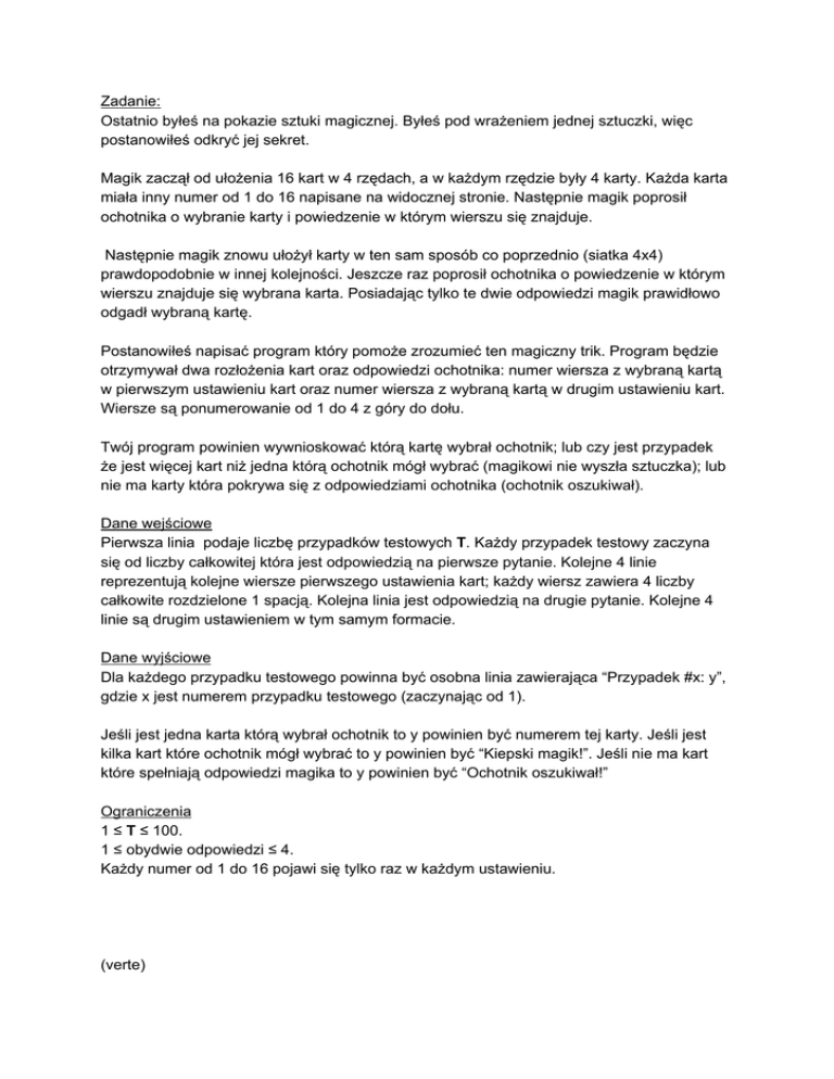 Zadanie: Ostatnio byłeś na pokazie sztuki magicznej. Byłeś pod wrażeniem jednej sztuczki, więc postanowiłeś odkryć jej sekret. Magik zaczął od ułożenia 16 kart w 4 rzędach, a w każdym rzędzie były 4 karty. Każda karta miała inny numer od 1 do 16 napisane na widocznej stronie. Następnie magik poprosił ochotnika o wybranie karty i powiedzenie w którym wierszu się znajduje. Następnie magik znowu ułożył karty w ten sam sposób co poprzednio (siatka 4x4) prawdopodobnie w innej kolejności. Jeszcze raz poprosił ochotnika o powiedzenie w którym wierszu znajduje się wybrana karta. Posiadając tylko te dwie odpowiedzi magik prawidłowo odgadł wybraną kartę. Postanowiłeś napisać program który pomoże zrozumieć ten magiczny trik. Program będzie otrzymywał dwa rozłożenia kart oraz odpowiedzi ochotnika: numer wiersza z wybraną kartą w pierwszym ustawieniu kart oraz numer wiersza z wybraną kartą w drugim ustawieniu kart. Wiersze są ponumerowanie od 1 do 4 z góry do dołu. Twój program powinien wywnioskować którą kartę wybrał ochotnik; lub czy jest przypadek że jest więcej kart niż jedna którą ochotnik mógł wybrać (magikowi nie wyszła sztuczka); lub nie ma karty która pokrywa się z odpowiedziami ochotnika (ochotnik oszukiwał). Dane wejściowe Pierwsza linia podaje liczbę przypadków testowych T . Każdy przypadek testowy zaczyna się od liczby całkowitej która jest odpowiedzią na pierwsze pytanie. Kolejne 4 linie reprezentują kolejne wiersze pierwszego ustawienia kart; każdy wiersz zawiera 4 liczby całkowite rozdzielone 1 spacją. Kolejna linia jest odpowiedzią na drugie pytanie. Kolejne 4 linie są drugim ustawieniem w tym samym formacie. Dane wyjściowe Dla każdego przypadku testowego powinna być osobna linia zawierająca “Przypadek #x: y”, gdzie x jest numerem przypadku testowego (zaczynając od 1). Jeśli jest jedna karta którą wybrał ochotnik to y powinien być numerem tej karty. Jeśli jest kilka kart które ochotnik mógł wybrać to y powinien być “Kiepski magik!”. Jeśli nie ma kart które spełniają odpowiedzi magika to y powinien być “Ochotnik oszukiwał!” Ograniczenia 1 ≤ T ≤ 100. 1 ≤ obydwie odpowiedzi ≤ 4. Każdy numer od 1 do 16 pojawi się tylko raz w każdym ustawieniu. (verte) Przykład Wejście Wyjście 3 2 1 2 3 4 5 6 7 8 9 10 11 12 13 14 15 16 3 1 2 5 4 3 11 6 15 9 10 7 12 13 14 8 16 2 1 2 3 4 5 6 7 8 9 10 11 12 13 14 15 16 2 1 2 3 4 5 6 7 8 9 10 11 12 13 14 15 16 2 1 2 3 4 5 6 7 8 9 10 11 12 13 14 15 16 3 1 2 3 4 5 6 7 8 9 10 11 12 13 14 15 16 Przypadek #1: 7 Przypadek #2: Kiepski magik! Przypadek #3: Ochotnik oszukiwał!