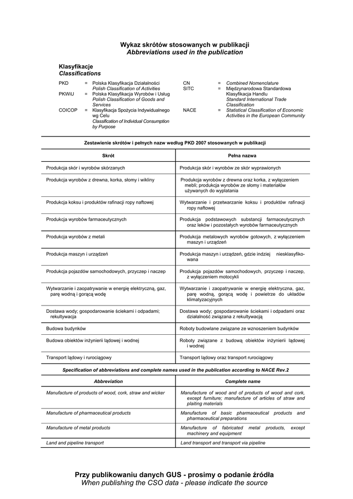 Zestawienie skrótów i pełnych nazw według PKD 2007 stosowanych w publikacji