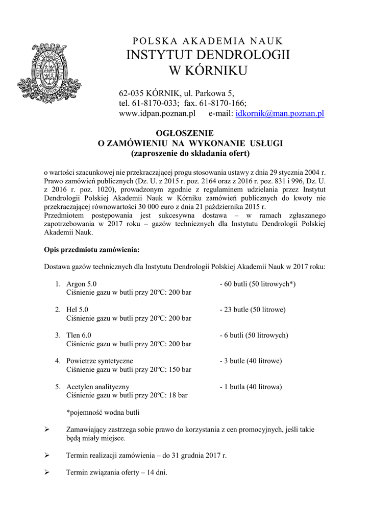POLSKA AKADEMIA NAUK INSTYTUT DENDROLOGII W KÓRNIKU 62-035 KÓRNIK, ul. Parkowa 5, tel. 61-8170-033; fax. 61-8170-166; www.idpan.poznan.pl e-mail: [email protected] OGŁOSZENIE O ZAMÓWIENIU NA WYKONANIE USŁUGI (zaproszenie do składania ofert) o wartości szacunkowej nie przekraczającej progu stosowania ustawy z dnia 29 stycznia 2004 r. Prawo zamówień publicznych (Dz. U. z 2015 r. poz. 2164 oraz z 2016 r. poz. 831 i 996, Dz. U. z 2016 r. poz. 1020), prowadzonym zgodnie z regulaminem udzielania przez Instytut Dendrologii Polskiej Akademii Nauk w Kórniku zamówień publicznych do kwoty nie przekraczającej równowartości 30 000 euro z dnia 21 października 2015 r. Przedmiotem postępowania jest sukcesywna dostawa – w ramach zgłaszanego zapotrzebowania w 2017 roku – gazów technicznych dla Instytutu Dendrologii Polskiej Akademii Nauk. Opis przedmiotu zamówienia: Dostawa gazów technicznych dla Instytutu Dendrologii Polskiej Akademii Nauk w 2017 roku: 1. Argon 5.0 Ciśnienie gazu w butli przy 20ºC: 200 bar - 60 butli (50 litrowych*) 2. Hel 5.0 Ciśnienie gazu w butli przy 20ºC: 200 bar - 23 butle (50 litrowe) 3. Tlen 6.0 Ciśnienie gazu w butli przy 20ºC: 200 bar - 6 butli (50 litrowych) 4. Powietrze syntetyczne Ciśnienie gazu w butli przy 20ºC: 150 bar - 3 butle (40 litrowe) 5. Acetylen analityczny Ciśnienie gazu w butli przy 20ºC: 18 bar - 1 butla (40 litrowa) *pojemność wodna butli Zamawiający zastrzega sobie prawo do korzystania z cen promocyjnych, jeśli takie będą miały miejsce. Termin realizacji zamówienia – do 31 grudnia 2017 r. Termin związania oferty – 14 dni. Oferty wg wzoru stanowiącego zał. nr 1. powinny zawierać proponowaną cenę na wszystkie elementy zamówienia ujęte w opisie. Przed podpisaniem umowy Wykonawca dostarczy oświadczenie, że nie podlega wykluczeniu na podstawie art. 22 i 24 przywołanej powyżej ustawy i wypis z odpowiedniego rejestru o działalności gospodarczej potwierdzony za zgodność z oryginałem. Cenę za wykonanie zamówienia Wykonawca określi w złotych z dokładnością do dwóch miejsc po przecinku na wszystkie elementy zamówienia. Zamawiający w celu ustalenia, czy oferta zawiera rażąco niską cenę w stosunku do przedmiotu zamówienia, może zwrócić się do wykonawcy o udzielenie w określonym terminie wyjaśnień dotyczących elementów oferty mających wpływ na wysokość ceny. Zastosowanie przez wykonawcę stawki podatku VAT od towarów i usług niezgodnego z przepisami ustawy o podatku od towarów i usług oraz podatku akcyzowego z 11.03.2004 r. (Dz. U. 04.54.535 z póź. zm.) spowoduje odrzucenie oferty. Cena powinna zawierać wszystkie koszty realizacji zamówienia razem z dostawą do siedziby Zamawiającego. Przedmiot zamówienia Cena jednostkowa gazu w zł służąca do porównania ofert (dla 1 butli) Cena rocznej dzierżawy 1 butli gazu w zł brutto Cena dostarczenia gazu do siedziby zamawiającego* Całkowity koszt dostarczenia butli (a+b+c) Termin dostawy (w godzinach) zł. brutto a zł brutto b zł brutto c zł brutto d e Argon 6.0 Hel 5.0 Tlen 6.0 Powietrze syntetyczne Acetylen analityczny Suma - *koszty transportu, opłata drogowa, ADR, inne koszty Maksymalny termin dostawy zaoferowany przez wykonawcę nie może być dłuższy niż 48 godziny. Oferta z dłuższym terminem zostanie odrzucona przez Zamawiającego. Jedynym kryterium wyboru oferty jest cena brutto. Za najkorzystniejszą ofertę uznana zostanie ważna oferta z najniższą ceną Z wykonawcą, którego oferta zostanie uznana za najkorzystniejszą zostanie podpisana umowa wg wzoru załącznika nr 2 do ogłoszenia (dotyczy zamówienia na kwotę powyżej 15000,00 zł. netto) lub zostanie wysłane pisemne zamówienie na dostawę (kwota poniżej 15000,00 zł. netto). Zamawiający zastrzega sobie prawo unieważnienia postępowania bez podania przyczyny. Od tej decyzji nie przysługują środki odwoławcze. Miejsce oraz termin składania i otwarcia ofert: oferty należy składać w zamkniętych kopertach z dopiskiem: „Oferta cenowa na dostawę gazów technicznych postępowanie nr 06/30000/2017 ” do 27 stycznia 2017 roku w sekretariacie nr pokoju 103 Instytutu do godz. 1500 lub przesłać pocztą elektroniczną na adres: [email protected] lub faksem. Wynik postępowania zostanie ogłoszony na stronie internetowej Zamawiającego: www.idpan.poznan.pl/bip. Osobą do kontaktu w sprawie zamówienia pod względem formalno-proceduralnym jest mgr Damian Maciejewski tel. 796 360 310; e-mail: [email protected] w godzinach od 730 do 1530. Załączniki: Nr 1 wzór oferty, Nr 2 wzór umowy Nr 3 wzór oświadczenia Dyrektor Instytutu prof. dr. hab. Jacek Oleksyn Kórnik, 24 stycznia 2017 r. Zał. nr 1 do ogłoszenia o zamówienie z 24.01.2017 r. Formularz oferty Nazwa oferenta: Adres: Telefon: E-mail: Przedstawiam swoją ofertę dotyczącą ogłoszenia o zamówieniu na dostawę gazów technicznych dla Instytutu Dendrologii Polskiej Akademii Nauk: Przedmiot zamówienia Cena jednostkowa gazu w zł służąca do porównania ofert Cena rocznej dzierżawy butli gazu w zł brutto Cena dostarczenia gazu do siedziby zamawiającego* Całkowity koszt dostarczenia butli (a+b+c) Termin dostawy (w godzinach) zł. brutto a zł brutto b zł brutto c zł brutto d e Argon 6.0 Hel 5.0 Tlen 6.0 Powietrze syntetyczne Acetylen analityczny - Suma Data: Podpis oferenta Zał. nr 2 do ogłoszenia o zamówienie z 24.01.2017 r. Wzór Umowa dostawy nr …../2017 zawarta w Kórniku dnia ………….2017 roku pomiędzy: Instytutem Dendrologii Polskiej Akademii Nauk mającym siedzibę przy ulicy Parkowej 5, 62-035 Kórnik, reprezentowanym przez: …………………………………………. zwanym w dalszej treści umowy ZAMAWIAJĄCYM a …………………………………………………..zwanym dalej w tekście DOSTAWCĄ reprezentowanym przez …………………………………………………. o następującej treści: Wobec wyboru DOSTAWCY przez ZAMAWIAJĄCE