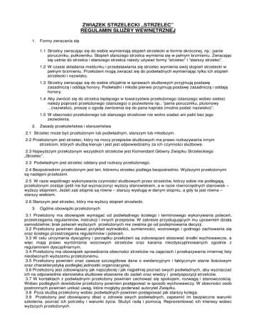 ZWIĄZEK STRZELECKI „STRZELEC” REGULAMIN SŁUŻBY WEWNĘTRZNEJ 1. Formy zwracania się 1.1 Strzelcy zwracając się do siebie wymieniają stopień strzelecki w formie skróconej, np.: panie poruczniku, pułkowniku. Stopień starszego strzelca wymienia się w pełnym brzmieniu. Zwracając się ustnie do strzelca i starszego strzelca należy używać formy “strzelec” i “starszy strzelec”. 1.2 W czasie składania meldunku i przedstawiania się strzelec wymienia swój stopień strzelecki w pełnym brzmieniu. Przełożeni mogą zwracać się do podwładnych wymieniając tylko ich stopień strzelecki i nazwisko. 1.3 Strzelcy zwracając się do siebie oficjalnie w sprawach służbowych przyjmują postawę zasadniczą i oddają honory. Podwładni i młodsi pierwsi przyjmują postawę zasadniczą i oddają honory. 1.4 Aby zwrócić się do strzelca będącego w towarzystwie przełożonego (starszego wobec siebie) należy poprosić przełożonego (starszego) o pozwolenie np.: “panie poruczniku, plutonowy ...(nazwisko), proszę o zgodę zwrócenia się do pana kaprala (można podać nazwisko)”. 1.5 W obecności przełożonego lub starszego strzelcowi nie wolno siadać ani palić bez jego zezwolenia. 2. Zasady przełożeństwa i starszeństwa 2.1 Strzelec może być przełożonym lub podwładnym, starszym lub młodszym. 2.2 Przełożonym jest strzelec, który na mocy przepisów służbowych ma prawo rozkazywania innym strzelcom, których służbą kieruje i jest jest odpowiedzialny za ich czynności służbowe. 2.3 Najwyższym przełożonym wszystkich strzelców jest Komendant Główny Związku Strzeleckiego „Strzelec”. 2.3 Podwładnym jest strzelec oddany pod rozkazy przełożonego. 2.4 Bezpośrednim przełożonym jest ten, któremu strzelec podlega bezpośrednio. Wyższymi przełożonymi są następni przełożeni. 2.5 W razie wspólnego wykonywania czynności służbowych przez strzelców, którzy sobie nie podlegają, przełożonym zostaje (jeśli nie był wyznaczony) wyższy stanowiskiem, a w razie równorzędnych stanowisk – wyższy stopniem. Jeżeli zaś stopnie są równe – starszy wysługą w danym stopniu, a gdy ta jest równa – starszy wiekiem. 2.6 Starszym jest strzelec, który ma wyższy stopień strzelecki. 3. Ogólne obowiązki przełożonych 3.1 Przełożony ma obowiązek wymagać od podwładnego ścisłego i terminowego wykonywania poleceń, przestrzegania regulaminów, instrukcji i innych przepisów. W zakresie przysługujących mu uprawnień działa samodzielnie; brak poleceń wyższych przełożonych nie zwalnia go od podejmowania decyzji. 3.2 Przełożony powinien dawać przykład wytrwałości, sumienności, wzorowego i godnego zachowania się oraz ścisłego przestrzegania regulaminów i poleceń. 3.3 W celu utrzymania dyscypliny i porządku przełożeni są zobowiązani stosować środki wychowawcze, a więc mają prawo wyróżniania wzorowych strzelców oraz karania niezdyscyplinowanych zgodnie z regulaminem dyscyplinarnym. 3.4 Przełożony ma obowiązek sprawdzania obecności strzelców na zajęciach i przekazywania imiennej listy nieobecnych wyższemu przełożonemu. 3.5 Przełożony powinien znać zawsze szczegółowe dane o ewidencyjnym i faktycznym stanie ilościowym oraz charakterystykę podległej jednostki organizacyjnej. 3.6 Przełożony jest zobowiązany jak najszybciej i jak najpełniej poznać swych podwładnych, aby wyznaczać ich na odpowiednie stanowiska służbowe stosownie do zadań oraz wiedzy i predyspozycji strzelców. 3.7 W kontaktach z podwładnymi przełożony powinien cechować się spokojem, rozwagą i stanowczością. Wobec podległych dowódców przełożony powinien postępować w sposób wychowawczy. W obecności osób postronnych powinien unikać uwag, które mogłyby poderwać autorytet Związku. 3.8 Poza służbą przełożony wobec podwładnych powinien postępować jak starszy kolega. 3.9 Przełożony jest obowiązany dbać o zdrowie swych podwładnych, zapewnić im bezpieczne warunki szkolenia, poznać ich potrzeby i warunki życia. Służyć radą i pomocą. Reprezentować ich interesy wobec wyższych przełożonych. 3.10 Każdy przełożony jest osobiście odpowiedzialny za sprawne kierowanie podwładnymi. W chwili mianowania ma obowiązek przygotowywać następcę. 3.11 Przełożony, który czasowo nie pełni swych obowiązków z powodu urlopu, choroby lub innych przyczyn, powinien rozkazem wyznaczyć pełniącego obowiązki i podać to do wiadomości wyższych przełożonych. 3.12 Przełożony ma obowiązek prowadzić odpowiednią dokumentację adekwatną do zajmowanego stanowiska 3.13 Przełożony ma obowiązek wystawić na wniosek podwładnego lub polecenie wyższego przełożonego opinię dotyczącą podwładnego 4. Wydawanie rozkazów (poleceń) 4.1 Rozkazy wydaje zazwyczaj bezpośredni przełożony swoim podwładnym. Rozkazy może także wydawać podwładnemu wyższy przełożony, który jest zobowiązany powiadomić o tym jego bezpośredniego przełożonego. 4.2 Starszy nie wydaje z zasady rozkazów młodszym jeśli nie są jego podwładnymi. Jest on jednak zobowiązany do wydawania rozkazów w razie: a) naruszenia przez młodszych postanowień regulaminów b) oczywistego zaniedbywania obowiązków c) niewłaściwego zachowania się lub zakłócania porządku publicznego d) zaistnienia potrzeby jednego kierownictwa w czasie służbowego spotkania się oddziałów (pododdziałów) nie będących w żadnym stosunku służbowym wobec siebie e) niebezpieczeństwa grożącego oddziałowi (pododdziałowi) lub strzelcowi podczas nieobecności przełożonego 4.3 Wydający rozkazy bierze na siebie za nie odpowiedzialność. 4.4 Wydający rozkaz jest zobowiązany uwzględnić stopień przygotowania podwładnego oraz warunki i okoliczności wykonania rozkazu 5. Wykonywanie rozkazów (poleceń) 5.1 Strzelec po otrzymaniu rozkazu odpowiada “rozkaz” i wykonuje go. Przełożony może zapytać, czy rozkaz jest zrozum