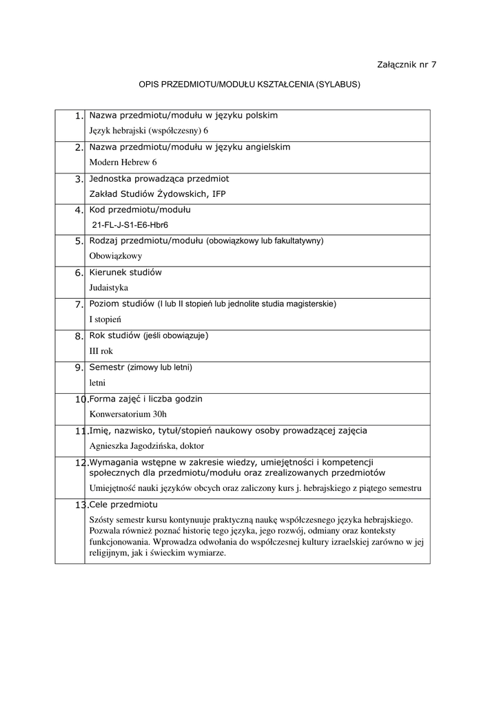 Załącznik nr 7 OPIS PRZEDMIOTU/MODUŁU KSZTAŁCENIA (SYLABUS) 1. Nazwa przedmiotu/modułu w języku polskim Język hebrajski (współczesny) 6 2. Nazwa przedmiotu/modułu w języku angielskim Modern Hebrew 6 3. Jednostka prowadząca przedmiot Zakład Studiów Żydowskich, IFP 4. Kod przedmiotu/modułu 21-FL-J-S1-E6-Hbr6 5. Rodzaj przedmiotu/modułu (obowiązkowy lub fakultatywny) Obowiązkowy 6. Kierunek studiów Judaistyka 7. Poziom studiów (I lub II stopień lub jednolite studia magisterskie) I stopień 8. Rok studiów (jeśli obowiązuje) III rok 9. Semestr (zimowy lub letni) letni 10.Forma zajęć i liczba godzin Konwersatorium 30h 11.Imię, nazwisko, tytuł/stopień naukowy osoby prowadzącej zajęcia Agnieszka Jagodzińska, doktor 12.Wymagania wstępne w zakresie wiedzy, umiejętności i kompetencji społecznych dla przedmiotu/modułu oraz zrealizowanych przedmiotów Umiejętność nauki języków obcych oraz zaliczony kurs j. hebrajskiego z piątego semestru 13.Cele przedmiotu Szósty semestr kursu kontynuuje praktyczną naukę współczesnego języka hebrajskiego. Pozwala również poznać historię tego języka, jego rozwój, odmiany oraz konteksty funkcjonowania. Wprowadza odwołania do współczesnej kultury izraelskiej zarówno w jej religijnym, jak i świeckim wymiarze. 14.Zakładane efekty kształcenia 1. Student ma podstawową wiedzę o miejscu i znaczeniu hebraistyki w systemie nauk humanistycznych oraz o jej specyfice przedmiotowej i metodologicznej. Rozumie w podstawowym zakresie jej powiązania z różnymi dyscyplinami naukowymi. 2. Student ma wiedzę o źródłach informacji (syntezy podręcznikowe, studia monograficzne, słowniki, gramatyki, źródła internetowe) dotyczących współczesnego języka hebrajskiego oraz historycznego, kulturowego i społecznego kontekstu jego funkcjonowania. 3. Student ma wiedzę o ogólnych mechanizmach rządzących używaniem współczesnego języka hebrajskiego; zna podstawowe narzędzia i metody opisu jego zjawisk językowych. 4. Student ma uporządkowaną wiedzę o systemach fonologicznym, gramatycznym i leksykalnym współczesnego języka hebrajskiego, a także o ich historycznej zmienności. Potrafi dokonać podstawowego zestawienia struktur i zjawisk języka polskiego oraz hebrajskiego, a także ma podstawową wiedzę o przechodzeniu od struktur jednego języka do struktur drugiego. 5. Student potrafi tworzyć teksty ustne należące do określonego gatunku współczesnego języka hebrajskiego (odpowiednio do poziomu zaawansowania jego nauki), właściwe dla określonej sytuacji komunikacyjnej; potrafi korzystać przy tym z różnych źródeł. 6. Student rozumie potrzebę uczenia się przez całe życie, zwłaszcza w zakresie rozwijania umiejętności językowych (w tym przypadku – współczesnego języka hebrajskiego). 7. Student potrafi pracować w zespole, przyjmując w nim różne role, dzieli się posiadaną wiedzą i umiejętnościami z zakresu współczesnego języka hebrajskiego (odpowiednio do poziomu zaawansowania). 8. Student umie odpowiednio określić priorytety służące realizacji zadań; potrafi gospodarować czasem i realizować określone zadania w wyznaczonych terminach. Symbole kierunkowych efektów kształcenia K_W01 K_W03 K_W07 K_W08 K_U10 K_K01 K_K02 K_K03 15.Treści programowe 1.Czasownik – ciąg dalszy czasu przyszłego oraz tryb rozkazującego w podstawowych binijanach; czasowniki modalne; strona bierna; zdania złożone; sufiksy dzierżawcze, rzeczowniki odczasownikowe, przyimki w formach zależnych – kontynuacja. 2. Leksyka związana z tematami takimi, jak: życie codzienne, czas, człowiek i jego społeczeństwo, plany na przyszłość, podróże, twórcy literatury oraz kultury nowohebrajskiej i żydowskiej, motywy biblijne, prasa, diaspora, historia Żydów, Zagłada 3. Konteksty funkcjonowania współczesnego hebrajskiego: piosenka, film, inne 16.Zalecana literatura (podręczniki). Shlomit Chayat, Sara Israeli, Hilla Kobliner, Iwrit min hatchala, Jerozolima 2001, część 2. Mazal Cohen, Agada szel safa, Jerozolima 1991. Page H. Kelly, Biblical Hebrew. An Introductory Grammar, 1992 Michigan. Słownik: Oxford EnglishHebrew HebrewEnglish Dictionary, ed. Ya’acov Levy, Jerozolima 1999 (lub inne dostępne) Ponadto: nagrania muzyki izraelskiej fragmenty utworów pisarzy nowohebrajskich (preparowane i nie) filmy materiały własne 17.Forma zaliczenia poszczególnych komponentów przedmiotu/modułu, sposób sprawdzenia osiągnięcia zamierzonych efektów kształcenia: Warunki zaliczenia konwersatorium zaliczenie wszystkich zadanych prac domowych zaliczenie wszystkich sprawdzianów i kolokwiów frekwencja i aktywność na zajęciach przygotowanie referatu na zadany temat braki wynikające z opuszczonych zajęć należy jak najszybciej nadrobić na konsultacjach; osoby, które opuszczą 8 lub więcej godzin zajęciowych (4 x 1,5h) nie uzyskają zaliczenia semestru 18.Język wykładowy polski, hebrajski 19.Obciążenie pracą studenta Forma aktywności studenta Godziny zajęć (wg planu studiów) z nauczycielem: konwersatorium Średnia liczba godzin na zrealizowanie aktywności 30h Praca własna studenta np.: - przygotowanie do zajęć (w tym do sprawdzianów i kolokwiów) oraz prace domowe (w tym referat) - przygotowanie do egzaminu 60h Suma godzin 120h Liczba punktów ECTS 4 30h