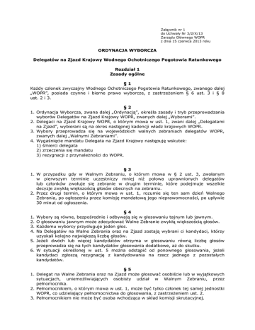 Załącznik nr 1 do Uchwały Nr 3/2/X/13 Zarządu Głównego WOPR z dnia 15 czerwca 2013 roku ORDYNACJA WYBORCZA Delegatów na Zjazd Krajowy Wodnego Ochotniczego Pogotowia Ratunkowego Rozdział 1 Zasady ogólne §1 Każdy członek zwyczajny Wodnego Ochotniczego Pogotowia Ratunkowego, zwanego dalej „WOPR”, posiada czynne i bierne prawo wyborcze, z zastrzeżeniem § 6 ust. 3 i § 8 ust. 2 i 3. §2 1. Ordynacja Wyborcza, zwana dalej „Ordynacją”, określa zasady i tryb przeprowadzania wyborów Delegatów na Zjazd Krajowy WOPR, zwanych dalej „Wyborami”. 2. Delegaci na Zjazd Krajowy WOPR, o którym mowa w ust. 1, zwani dalej „Delegatami na Zjazd”, wybierani są na okres następnej kadencji władz krajowych WOPR. 3. Wybory przeprowadza się na wojewódzkich walnych zebraniach delegatów WOPR, zwanych dalej „Walnymi Zebraniami”. 4. Wygaśnięcie mandatu Delegata na Zjazd Krajowy następuję wskutek: 1) śmierci delegata 2) zrzeczenia się mandatu 3) rezygnacji z przynależności do WOPR. §3 1. W przypadku gdy w Walnym Zebraniu, o którym mowa w § 2 ust. 3, zwołanym w pierwszym terminie uczestniczy mniej niż połowa uprawnionych delegatów lub członków zwołuje się zebranie w drugim terminie, które podejmuje wszelkie decyzje zwykłą większością głosów obecnych na zebraniu. 2. Przez drugi termin, o którym mowa w ust. 1, rozumie się ten sam dzień Walnego Zebrania, po ogłoszeniu przez komisję mandatową jego nieprawomocności, po upływie 30 minut od ogłoszenia. §4 Wybory są równe, bezpośrednie i odbywają się w głosowaniu tajnym lub jawnym. O głosowaniu jawnym może zdecydować Walne Zebranie zwykłą większością głosów. Każdemu wyborcy przysługuje jeden głos. Na Delegatów na Walne Zebrania oraz na Zjazd zostają wybrani ci kandydaci, którzy uzyskali kolejno największą liczbę głosów. 5. Jeżeli dwóch lub więcej kandydatów otrzyma w głosowaniu równą liczbę głosów przeprowadza się na tych kandydatów głosowania dodatkowe, aż do skutku. 6. W sytuacji określonej w ust. 5 można odstąpić od ponownego głosowania, jeżeli kandydaci zgłoszą rezygnację z kandydowania na rzecz jednego z pozostałych kandydatów. 1. 2. 3. 4. §5 1. Delegat na Walne Zebrania oraz na Zjazd może głosować osobiście lub w wyjątkowych sytuacjach, uniemożliwiających osobisty udział w Walnym Zebraniu, przez pełnomocnika. 2. Pełnomocnikiem, o którym mowa w ust. 1, może być tylko członek tej samej jednostki WOPR, co udzielający pełnomocnictwa do głosowania, z zastrzeżeniem ust. 2. 3. Pełnomocnikiem nie może być osoba wchodząca w skład komisji skrutacyjnej. §6 1. Zgłoszeni kandydaci na Delegatów na Walne Zebrania oraz na Zjazd muszą wyrazić zgodę na umieszczenie ich nazwisk i imion na kartach do głosowania. 2. Głosuje się imiennie na kandydata. 3. Liczba kandydatów na Delegatów jest nieograniczona. Rozdział 2 Prawa wyborcze §7 1. Prawo wybierania (czynne prawo wyborcze) Delegatów na Walne Zebrania, zwanych dalej „Delegatami” ma każdy członek zwyczajny WOPR. 2. Delegatem na Zjazd może być członek WOPR wybrany na Walnym Zebraniu Delegatów jednostki WOPR, który otrzymuje od swojej organizacji mandat i zachowuje go przez okres kadencji władz WOPR. 3. Nie mają prawa wybierania osoby: 1) pozbawione praw publicznych prawomocnym orzeczeniem sądowym; 2) pozbawione praw wyborczych orzeczeniem Trybunału Stanu; 3) ubezwłasnowolnione prawomocnym orzeczeniem sądowym. 4. Prawo zgłaszania kandydatów na Delegatów, o których mowa w ust. 1, przysługuje każdemu członkowi WOPR danej jednostki WOPR. §8 1. Prawo wybierania Delegatów i Delegatów na Zjazd ma również członek WOPR – obywatel Unii Europejskiej niebędący obywatelem polskim, z zastrzeżeniem § 7 ust. 3. 2. Prawa wybierania Delegatów nie ma obywatel Unii Europejskiej niebędący obywatelem polskim pozbawiony prawa wybierania w państwie członkowskim Unii Europejskiej, którego jest obywatelem. 3. Przy ustalaniu faktu stałego zamieszkania dla potrzeb Ordynacji stosuje się przepisy Kodeksu cywilnego. §9 1. Prawo wybieralności (bierne prawo wyborcze) przysługuje każdemu członkowi zwyczajnemu WOPR. 2. Nie mają prawa wybieralności osoby: 1) karane za przestępstwo umyślne ścigane z oskarżenia publicznego; 2) wobec których wydano prawomocny wyrok warunkowo umarzający postępowanie karne w sprawie popełnienia przestępstwa umyślnego ściganego z oskarżenia publicznego. 3. Prawa wybieralności nie ma obywatel Unii Europejskiej, niebędący obywatelem polskim, pozbawiony prawa wybieralności w państwie członkowskim Unii Europejskiej, którego jest obywatelem. Rozdział 3 Organy wyborcze § 10 1. Walne Zebrania, o których mowa w § 2 ust. 3, zorganizują zarządy właściwych jednostek WOPR, określając ich szczegółowe zasady w formie regulaminu Walnego Zebrania i kierując się statutem oraz wskazaniami Ordynacji. 2. Zarządy jednostek WOPR stworzą warunki do udziału wszystkich uprawnionych członków WOPR w Walnych Zebraniach wybierających Delegatów. 3. W przypadkach niemożności zorganizowania, zgodnie z ust. 1 i 2, przez zarządy jednostek WOPR Walnych Zebrań zostaną powołane, w porozumieniu z Biurem Zarządu Głównego WOPR, komitety wyborcze. 4. Komitety wyborcze, wymienione w ust. 3, właściwe dla poszczególnych województw, będą realizowały zadania przypisane w Ordynacji zarządom właściwych jednostek WOPR. 5. Do zadań zarządu, o których mowa w ust. 1, należy w szczególności: 1) sprawowanie ogólnego nadzoru nad przestrzeganiem ustalonego prawa wyborczego; 2) ustalanie wzorów druków wyborczych, a także wzorów pieczęci; 3) wykonywanie innych niezbędnych czynności organizacyjnych. 6. Regulamin zebrania wyborczego, o którym mowa w ust. 1, określa szczegółowe zasady organizacji i tryb przeprowadzenia wyboru delegatów na Zjazd Krajowy WOPR. 7. Wykonując zadania, o których mowa w ust. 1 i 2, zarzą