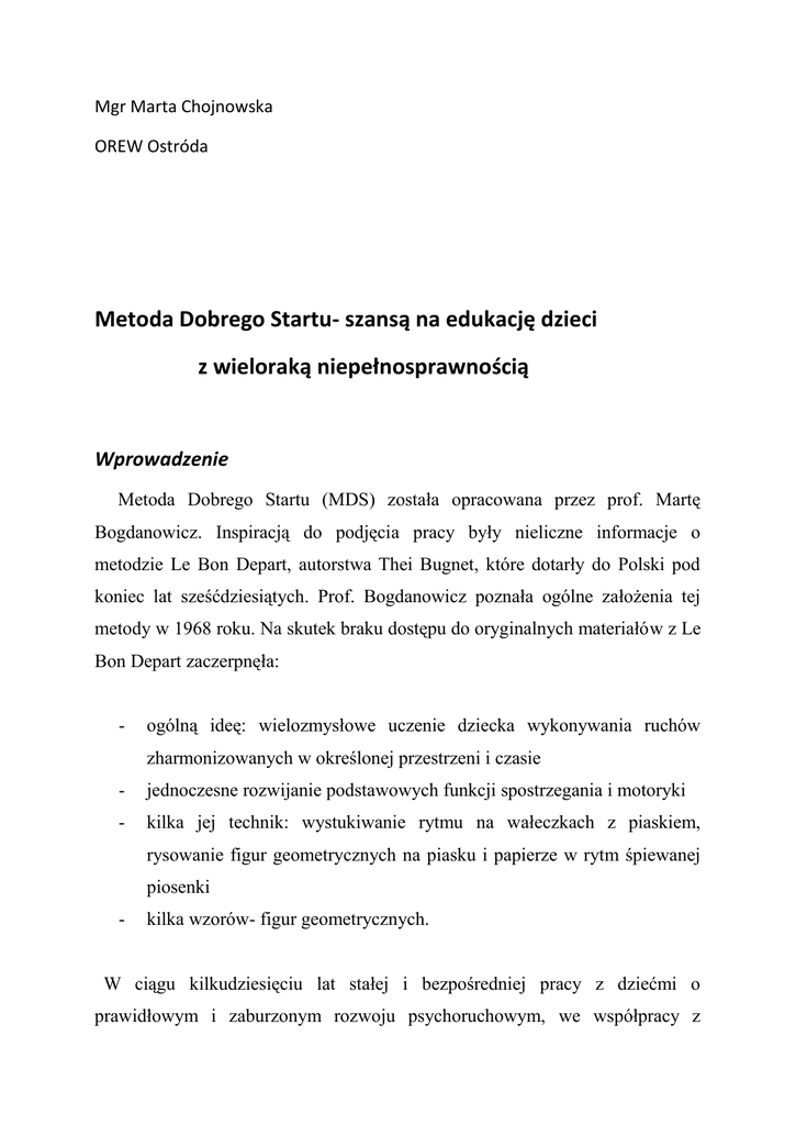 Mgr Marta Chojnowska OREW Ostróda Metoda Dobrego Startu- szansą na edukację dzieci z wieloraką niepełnosprawnością Wprowadzenie Metoda Dobrego Startu (MDS) została opracowana przez prof. Martę Bogdanowicz. Inspiracją do podjęcia pracy były nieliczne informacje o metodzie Le Bon Depart, autorstwa Thei Bugnet, które dotarły do Polski pod koniec lat sześćdziesiątych. Prof. Bogdanowicz poznała ogólne założenia tej metody w 1968 roku. Na skutek braku dostępu do oryginalnych materiałów z Le Bon Depart zaczerpnęła: - ogólną ideę: wielozmysłowe uczenie dziecka wykonywania ruchów zharmonizowanych w określonej przestrzeni i czasie - jednoczesne rozwijanie podstawowych funkcji spostrzegania i motoryki - kilka jej technik: wystukiwanie rytmu na wałeczkach z piaskiem, rysowanie figur geometrycznych na piasku i papierze w rytm śpiewanej piosenki - kilka wzorów- figur geometrycznych. W ciągu kilkudziesięciu lat stałej i bezpośredniej pracy z dziećmi o prawidłowym i zaburzonym rozwoju psychoruchowym, we współpracy z muzykami, nauczycielami, rodzicami- Marta Bogdanowicz opracowała własną oryginalną metodę pracy z dziećmi. Metoda Dobrego Startu zawiera: - strukturę zajęć (zajęcia wprowadzające, właściwe, końcowe) - rodzaje ćwiczeń , ich nazwy i przebieg (ćwiczenia ruchowe, ruchowosłuchowe, ruchowo- słuchowo- wzrokowe) - techniki prowadzenia ćwiczeń i porządek ich prowadzenia - program cyklu zajęć - zestaw wzorów, zastąpienie wzorów literami - zestaw piosenek autorstwa Danuty Szlagowskiej, Marii Tomaszewskiej, Małgorzaty Barańskiej i Andrzeja Filara Istnieją trzy warianty Metody Dobrego Startu. Każdy dostosowany do adekwatnego poziomu rozwojowego dzieci: 1. Piosenki lub wierszyki i łatwe wzory- przeznaczone są dla dzieci najmłodszych oraz starszych, których rozwój przebiega z opóźnieniem. 2. Piosenki lub wierszyki i wzory literopodobne- dostosowane do potrzeb 6 i 7- latków o prawidłowym rozwoju, dzieci, u których występuje ryzyko dysleksji oraz dzieci starszych o opóźnionym rozwoju. 3. Piosenki lub wierszyki i litery oraz znaki matematyczne- przygotowane są z myślą o dzieciach uczęszczających do klas O i I, uczniach starszych z dysleksją. Opisane wyżej warianty Metody Dobrego Startu nawzajem się uzupełniająstanowią kolejne etapy pracy stymulacyjno- terapeutycznej oraz edukacyjnej. Początkowo na materiale nieliterowym , następnie na materiale obejmującym litery i cyfry. Założeniem Metody Dobrego Startu jest jednoczesne rozwijanie funkcji językowych, funkcji spostrzeżeniowych: wzrokowych, słuchowych, dotykowych, kinestetycznych tymi (czucie funkcjami ruchu) czyli i motorycznych integracji oraz współdziałania między percepcyjno- motorycznej1 . Istotnym celem metody jest też usprawnianie w zakresie lateralizacji, orientacji w prawej i lewej stronie ciała. Metoda Dobrego Startu usprawnia cały rozwój psychoruchowy dziecka. Prowadzi do wyższego poziomu rozwoju i współdziałania funkcji intelektualnych (mowy, myślenia) i instrumentalnych (spostrzeżeniowo- ruchowych). Dzięki temu dochodzi do prawidłowego wykonywania czynności ruchowych, we właściwym czasie i przestrzeni, w harmonii z czynnościami poznawczymi, w tym językowymi. Doskonalenie integracji percepcyjno- motorycznej i kompetencji ułatwia naukę pisania i czytania wszystkim dzieciom...W przypadku dzieci opóźnionych w rozwoju , udział w ćwiczeniach służy rehabilitacji zaburzeń rozwoju psychomotorycznego i pomaga zmniejszyć trudności w opanowywaniu skomplikowanych umiejętności szkolnych.2 Prowadzone przez prof. Bogdanowicz badania wskazują że MDS korzystnie wpływa także na sferę pozaintelektualną dzieci. Stosowanie metody korzystnie wpływa na procesy emocjonalne i zachowania społeczne oraz rozwój mowy dzieci, szczególnie o głębiej zaburzonym rozwoju. Metoda ta ma nie tylko aspekt profilaktyczno- terapeutyczny, ale również aspekt diagnostyczny. Na podstawie obserwacji zachowania dziecka, trudności podczas wykonywania ćwiczeń oraz analizy błędów można wnioskować o rodzaju i głębokości zaburzeń , można również dostrzec postępy czynione przez dziecko.3 Zajęcia prowadzone Metodą Dobrego Startu posiadają określoną strukturę, 1 M.Bogdanowicz, Indywidualne i integracyjne zajęcia rehabilitacyjne z wykorzystaniem różnych modyfikacji Metody Dobrego Startu. (w) W.Dykcik, B.Szychowiak,(red.) Nowatorskie i alternatywne metody w teorii i praktyce pedagogiki specjalnej. Wydawnictwo Naukowe UAM, Poznań 2001, s.127. 2 tamże, s.128 3 M.Bogdanowicz, M.Barańska, E.Jakacka, Metoda Dobrego Startu . Piosenki do rysowania. Harmonia, Gdańsk , 2007, s. 3 choć metoda jest przyjazna twórczym modyfikacjom. W zależności od specyficznych potrzeb edukacyjnych dzieci, poziomu ich funkcjonowania lub głębokości zaburzeń- może być dowolnie dostosowywana. Zajęcia MDS mogą być prowadzone w grupie lub indywidualnie. Metoda Dobrego Startu jest efektywną metodą stosowaną w terapii dzieci z uogólnionymi i głębszymi zaburzeniami. Badania nad skutecznością tej metody w pracy z dziećmi z niepełnosprawnością intelektualna oraz autyzmem i porażeniem mózgowym wskazują na jej istotną rolę w całościowym procesie terapii. Z racji wykonywanej pracy na co dzień stosuję Metodę Dobrego Startu. Uczestniczę w terapii pedagogicznej na terenie Ośrodka RehabilitacyjnoEdukacyjno- Wychowawczego w Ostródzie. Doświadczenia i poczynione obserwacje zainspirowały mnie do zbadania skuteczności stosowania Metody Dobrego Startu jako formy terapii pedagogicznej stosowanej wobec dzieci niepełnosprawnych intelektualne w stopniu umiarkowanym i znacznym. Z bogatej problematyki dotyczącej terapii dzieci z zaburzeniami rozwoju wybrałam jako cel badań poznanie skuteczności Metody Dobrego Startu jako formy terapii pedagogicznej dzieci w wieku przedszkolnym niepełnosprawnych intelektualnie w stopniu umiarkowanym i 