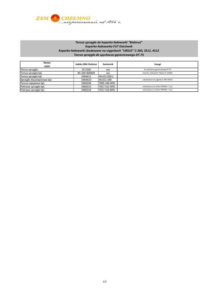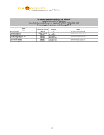 Tarcza sprzęgła do koparko-ładowarki "Białoruś" Koparko-ładowarka FUT Ostrówek Koparko-ładowarki zbudowane na ciągnikach "URSUS" C-360, 3512, 4512 Tarcza sprzęgła do spychacza gąsienicowego DT-75 Nazwa części Tarcza sprzęgła . Tarcza sprzęgła kpl. Tarcza sprzęgła kpl. Sprzęgło dwustopniowe kpl. Tarcza napędowa kpl. Pokrywa sprzęgła kpl. Pokrywa sprzęgła kpl. Indeks ZSM Chełmno 14-21S6 45-160-4040CB 2464611 2464610 2466246 2466315 2466316 Zamiennik xxx xxx 46.611.010.1 46.611.100 7005 246 M91 7017 315 M91 7017 316 M91 1/1 Uwagi do spychacza gąsienicowego DT-75 koparko- ładowarka "Białoruś" (JUMZ) zabudowane na ciągniku C-360 URSUS zabudowana na silniku PERKINS - 3 cyl. zabudowana na silniku PERKINS - 4 cyl.