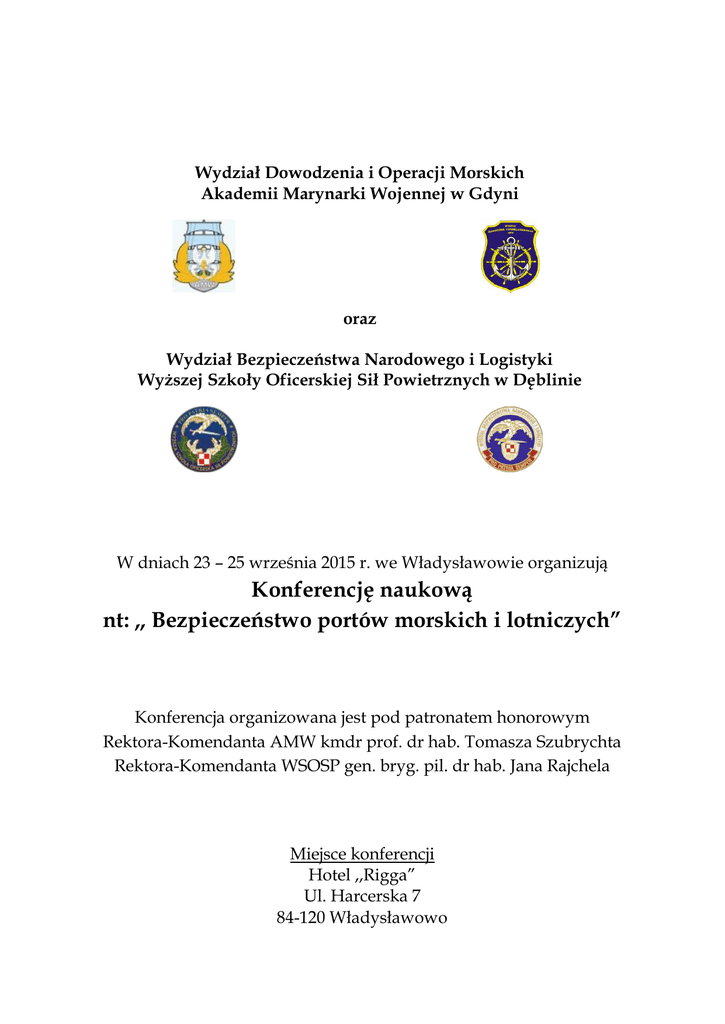 Wydział Dowodzenia i Operacji Morskich Akademii Marynarki Wojennej w Gdyni oraz Wydział Bezpieczeństwa Narodowego i Logistyki Wyższej Szkoły Oficerskiej Sił Powietrznych w Dęblinie W dniach 23 – 25 września 2015 r. we Władysławowie organizują Konferencję naukową nt: ,, Bezpieczeństwo portów morskich i lotniczych” Konferencja organizowana jest pod patronatem honorowym Rektora-Komendanta AMW kmdr prof. dr hab. Tomasza Szubrychta Rektora-Komendanta WSOSP gen. bryg. pil. dr hab. Jana Rajchela Miejsce konferencji Hotel ,,Rigga” Ul. Harcerska 7 84-120 Władysławowo PROBLEMATYKA KONFERENCJI Celem konferencji jest wymiana doświadczeń, prezentacja wyników badań oraz najnowszych osiągnięć przemysłu związanych z zapewnieniem bezpieczeństwa portów morskich i lotniczych. Główne obszary problemowe konferencji to: 1. Stan bezpieczeństwa portów morskich i lotniczych. 2. Ratownictwo lotnicze i lotniskowe, ratownictwo morskie. 3. Służby lotniskowe i ochrona lotnisk. Ochrona portów morskich. 4. Bezpieczeństwo w ruchu lotniczym i w żegludze. 5. Wykorzystanie systemów monitoringu. 6. Organizacja szkolenia z zakresu procedur bezpieczeństwa. KALENDARIUM KONFERENCJI do 01.06.2015 – zgłoszenie udziału w konferencji do 01.06.2015 – przesłanie streszczenia referatu do 30.06.2015 – wniesienie opłaty konferencyjnej do 01.07.2015 – akceptacja tematyki referatów do 01.09.2015 – program konferencji, przesłanie pełnego tekstu referatu KOMITET ORGANIZACYJNY mgr inż. Andrzej Ilkow mgr Mateusz Łaski dr Paweł Zienkiewicz Adres do korespondencji oraz kontakt: Komitet Organizacyjny Konferencji Naukowej ,,Bezpieczeństwo portów morskich i lotniczych”, Wydział Dowodzenia i Operacji Morskich, Akademia Marynarki Wojennej, ul. Śmidowicza 69 81-103 Gdynia. Dr Paweł Zienkiewicz: tel. 887 663 490, mail: [email protected]; mgr Andrzej Ilkow: tel. 501 009 314 , mail: [email protected]; mgr Mateusz Łaski: tel. 797287934, mail: [email protected] OPŁATA KONFERENCYJNA Opłata konferencyjna wynosi 650 zł. W ramach opłaty konferencyjnej organizator zapewnia: publikację jednego artykułu w publikacji pokonferencyjnej, materiały konferencyjne, dwa noclegi, wyżywienie podczas konferencji, serwis konferencyjny, udział w imprezach towarzyszących.