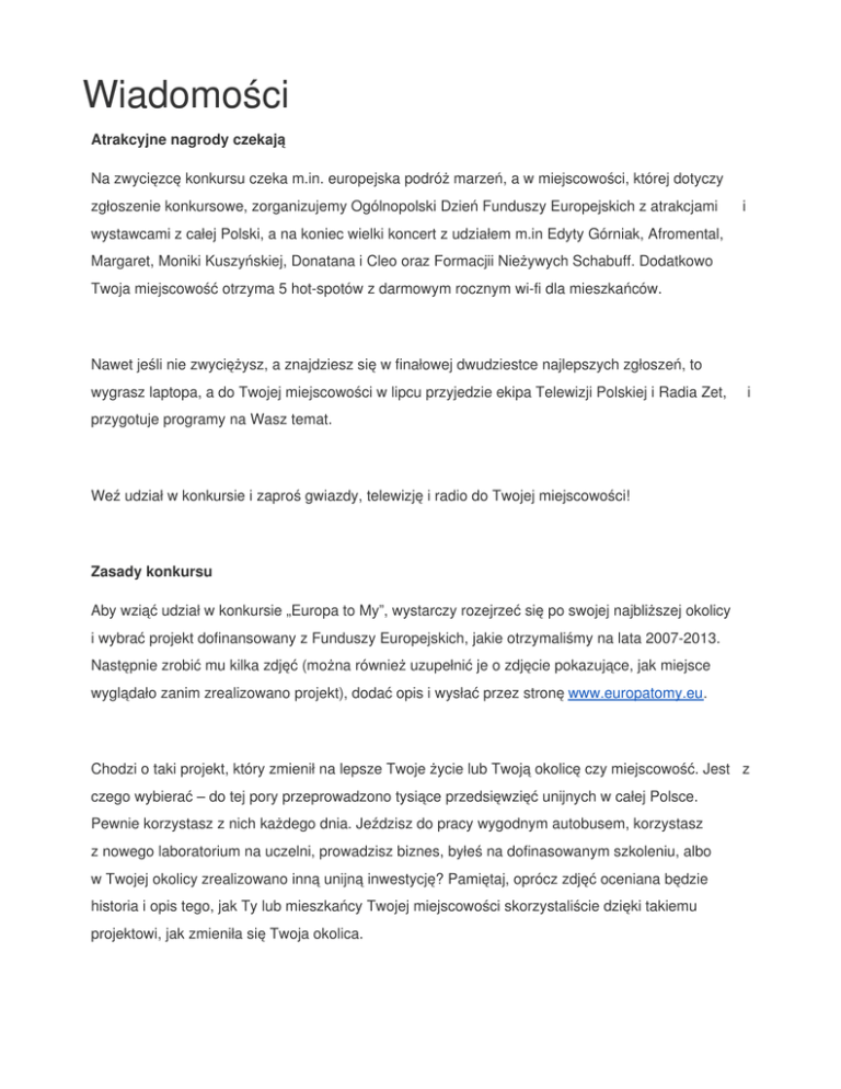 Wiadomości Atrakcyjne nagrody czekają Na zwycięzcę konkursu czeka m.in. europejska podróż marzeń, a w miejscowości, której dotyczy zgłoszenie konkursowe, zorganizujemy Ogólnopolski Dzień Funduszy Europejskich z atrakcjami i wystawcami z całej Polski, a na koniec wielki koncert z udziałem m.in Edyty Górniak, Afromental, Margaret, Moniki Kuszyńskiej, Donatana i Cleo oraz Formacjii Nieżywych Schabuff. Dodatkowo Twoja miejscowość otrzyma 5 hot-spotów z darmowym rocznym wi-fi dla mieszkańców. Nawet jeśli nie zwyciężysz, a znajdziesz się w finałowej dwudziestce najlepszych zgłoszeń, to wygrasz laptopa, a do Twojej miejscowości w lipcu przyjedzie ekipa Telewizji Polskiej i Radia Zet, i przygotuje programy na Wasz temat. Weź udział w konkursie i zaproś gwiazdy, telewizję i radio do Twojej miejscowości! Zasady konkursu Aby wziąć udział w konkursie „Europa to My”, wystarczy rozejrzeć się po swojej najbliższej okolicy i wybrać projekt dofinansowany z Funduszy Europejskich, jakie otrzymaliśmy na lata 2007-2013. Następnie zrobić mu kilka zdjęć (można również uzupełnić je o zdjęcie pokazujące, jak miejsce wyglądało zanim zrealizowano projekt), dodać opis i wysłać przez stronę www.europatomy.eu. Chodzi o taki projekt, który zmienił na lepsze Twoje życie lub Twoją okolicę czy miejscowość. Jest z czego wybierać – do tej pory przeprowadzono tysiące przedsięwzięć unijnych w całej Polsce. Pewnie korzystasz z nich każdego dnia. Jeździsz do pracy wygodnym autobusem, korzystasz z nowego laboratorium na uczelni, prowadzisz biznes, byłeś na dofinasowanym szkoleniu, albo w Twojej okolicy zrealizowano inną unijną inwestycję? Pamiętaj, oprócz zdjęć oceniana będzie historia i opis tego, jak Ty lub mieszkańcy Twojej miejscowości skorzystaliście dzięki takiemu projektowi, jak zmieniła się Twoja okolica. Jak i kiedy przesłać zgłoszenie Zgłoszenia zbieramy w dwóch etapach. Na pierwsze zgłoszenia czekamy do 22 czerwca. Spośród nich Kapituła konkursu wybierze pierwszych 10 finalistów. Drugi etap nadsyłania zgłoszeń zakończy się 3 lipca. W tym drugim etapie wybierzemy kolejne 10 najlepszych prac. Cała finałowa dwudziestka będzie brała udział w głosowaniu internautów od 6 do 24 lipca. Wyniki zostaną ogłoszone 27 lipca. Zgłoszenia należy wysyłać drogą elektroniczną za pomocą formularza zamieszczonego na stronie internetowej akcji w zakładce „Weź udział w konkursie”. Prześlij nam swoje zgłoszenie i pokaż, co zmieniło się w Twojej okolicy w ostatnich latach! Szczegóły na www.europatomy.eu i na Facebooku EuropaToMy. Organizatorem akcji jest Ministerstwo Infrastruktury i Rozwoju, Radio Zet oraz Program Pierwszy Telewizji Polskiej. https://www.funduszeeuropejskie.gov.pl/strony/wiadomosci/pokaz-jak-zmienila-sie-twoja-okolica-iwygraj-w-konkursie/ http://www.europatomy.eu/materialy-promocyjne https://www.youtube.com/watch?v=7knZ6-uxGLE https://www.facebook.com/EuropaToMy