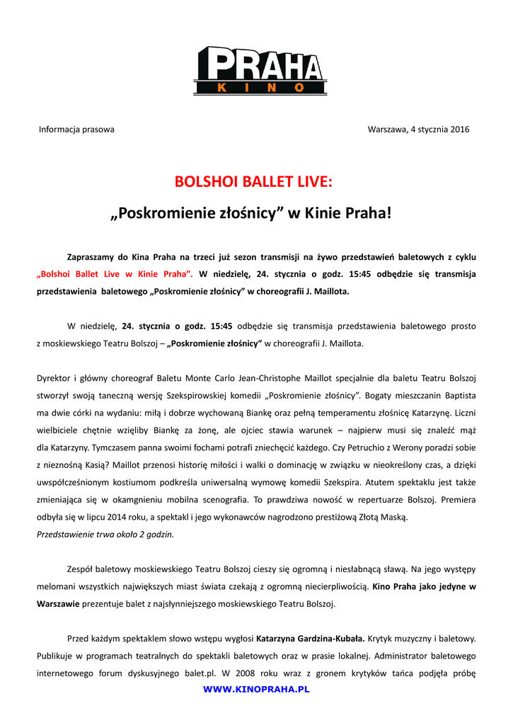 Informacja prasowa Warszawa, 4 stycznia 2016 BOLSHOI BALLET LIVE: „Poskromienie złośnicy” w Kinie Praha! Zapraszamy do Kina Praha na trzeci już sezon transmisji na żywo przedstawień baletowych z cyklu „Bolshoi Ballet Live w Kinie Praha”. W niedzielę, 24. stycznia o godz. 15:45 odbędzie się transmisja przedstawienia baletowego „Poskromienie złośnicy” w choreografii J. Maillota. W niedzielę, 24. stycznia o godz. 15:45 odbędzie się transmisja przedstawienia baletowego prosto z moskiewskiego Teatru Bolszoj – „Poskromienie złośnicy” w choreografii J. Maillota. Dyrektor i główny choreograf Baletu Monte Carlo Jean-Christophe Maillot specjalnie dla baletu Teatru Bolszoj stworzył swoją taneczną wersję Szekspirowskiej komedii „Poskromienie złośnicy”. Bogaty mieszczanin Baptista ma dwie córki na wydaniu: miłą i dobrze wychowaną Biankę oraz pełną temperamentu złośnicę Katarzynę. Liczni wielbiciele chętnie wzięliby Biankę za żonę, ale ojciec stawia warunek – najpierw musi się znaleźć mąż dla Katarzyny. Tymczasem panna swoimi fochami potrafi zniechęcić każdego. Czy Petruchio z Werony poradzi sobie z nieznośną Kasią? Maillot przenosi historię miłości i walki o dominację w związku w nieokreślony czas, a dzięki uwspółcześnionym kostiumom podkreśla uniwersalną wymowę komedii Szekspira. Atutem spektaklu jest także zmieniająca się w okamgnieniu mobilna scenografia. To prawdziwa nowość w repertuarze Bolszoj. Premiera odbyła się w lipcu 2014 roku, a spektakl i jego wykonawców nagrodzono prestiżową Złotą Maską. Przedstawienie trwa około 2 godzin. Zespół baletowy moskiewskiego Teatru Bolszoj cieszy się ogromną i niesłabnącą sławą. Na jego występy melomani wszystkich największych miast świata czekają z ogromną niecierpliwością. Kino Praha jako jedyne w Warszawie prezentuje balet z najsłynniejszego moskiewskiego Teatru Bolszoj. Przed każdym spektaklem słowo wstępu wygłosi Katarzyna Gardzina-Kubała. Krytyk muzyczny i baletowy. Publikuje w programach teatralnych do spektakli baletowych oraz w prasie lokalnej. Administrator baletowego internetowego forum dyskusyjnego balet.pl. W 2008 roku wraz z gronem krytyków tańca podjęła próbę WWW.KINOPRAHA.PL reaktywacji kwartalnika „Taniec”. Współautorka serii książek dla dzieci Bajki baletowe i autorka baletowego bloga Na czubkach palców. W latach 2008-2010 pracowała na stanowisku sekretarza literackiego Teatru Wielkiego – Opery Narodowej. Od 2010 jest stałym współpracownikiem Instytutu Muzyki i Tańca. * * * Teatr Bolszoj. Historia moskiewskiego baletu sięga czasów carskiej Rosji (1776). W XX wieku zespół wypracował swój własny, niepowtarzalny, wręcz sportowy styl. Wirtuozeria solistów stoi na najwyższym poziomie. Balet Teatru Bolszoj przygotowuje przedstawienia, które wciąż są niedoścignionym wzorem dla innych zespołów baletowych, nawet tych zaliczających się do najwybitniejszych na świecie. Zapraszamy na „BOLSHOI BALLET LIVE 2015/2016” w Kinie Praha! Cena biletu na transmisje – 50 zł Cena biletu ulgowego – 45 zł Karnet (7 transmisji) – 40 zł Na przedstawienia baletowe kino nie prowadzi rezerwacji biletów. PROGRAM: „BOLSHOI BALLET LIVE 2015/2016” w Kinie Praha: POSKROMIENIE ZŁOŚNICY 24.01.2016 | niedziela | 15:45 | transmisja LIVE muzyka: D. Szostakowicz | choreografia: J. Maillot SPARTAKUS 13.03.2016 | niedziela | 15:45 | retransmisja muzyka: A. Chaczaturian | choreografia: J. Grigorowicz DON KICHOT 10.04.2016 | niedziela | 16:45 | transmisja LIVE muzyka: L. Minkus | choreografia: A. Fadejeczew INFORMACJA: Kasa Kina Praha ul. Jagiellońska 26 03-719 Warszawa tel. 22 343 03 10 WWW.KINOPRAHA.PL KONTAKT DLA MEDIÓW: Katarzyna Polubiec-Mrowińska, email: [email protected] , tel.: (+48) 728 875 350 WWW.KINOPRAHA.PL