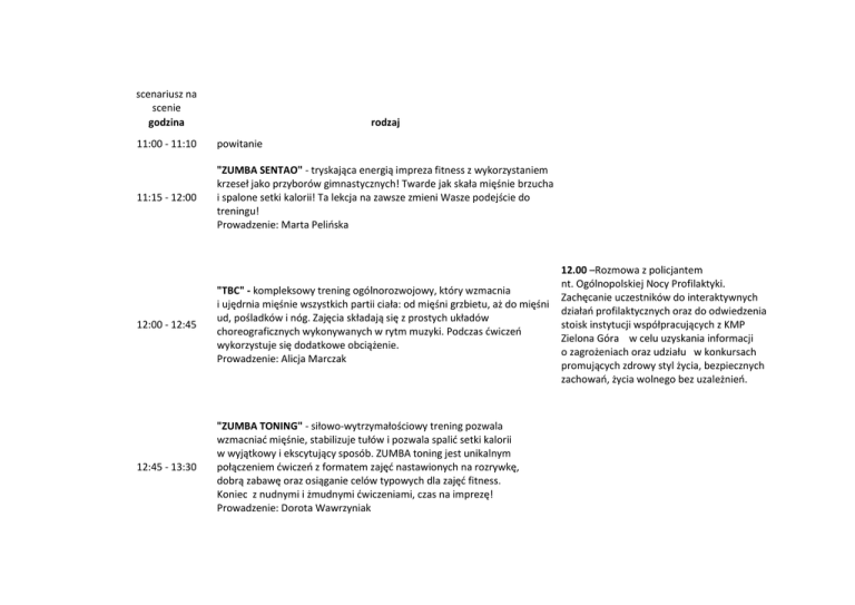 scenariusz na scenie godzina rodzaj 11:00 - 11:10 powitanie 11:15 - 12:00 "ZUMBA SENTAO" - tryskająca energią impreza fitness z wykorzystaniem krzeseł jako przyborów gimnastycznych! Twarde jak skała mięśnie brzucha i spalone setki kalorii! Ta lekcja na zawsze zmieni Wasze podejście do treningu! Prowadzenie: Marta Pelińska 12:00 - 12:45 "TBC" - kompleksowy trening ogólnorozwojowy, który wzmacnia i ujędrnia mięśnie wszystkich partii ciała: od mięśni grzbietu, aż do mięśni ud, pośladków i nóg. Zajęcia składają się z prostych układów choreograficznych wykonywanych w rytm muzyki. Podczas ćwiczeń wykorzystuje się dodatkowe obciążenie. Prowadzenie: Alicja Marczak 12:45 - 13:30 "ZUMBA TONING" - siłowo-wytrzymałościowy trening pozwala wzmacniać mięśnie, stabilizuje tułów i pozwala spalić setki kalorii w wyjątkowy i ekscytujący sposób. ZUMBA toning jest unikalnym połączeniem ćwiczeń z formatem zajęć nastawionych na rozrywkę, dobrą zabawę oraz osiąganie celów typowych dla zajęć fitness. Koniec z nudnymi i żmudnymi ćwiczeniami, czas na imprezę! Prowadzenie: Dorota Wawrzyniak 12.00 –Rozmowa z policjantem nt. Ogólnopolskiej Nocy Profilaktyki. Zachęcanie uczestników do interaktywnych działań profilaktycznych oraz do odwiedzenia stoisk instytucji współpracujących z KMP Zielona Góra w celu uzyskania informacji o zagrożeniach oraz udziału w konkursach promujących zdrowy styl życia, bezpiecznych zachowań, życia wolnego bez uzależnień. 13:00 - pokaz policyjnych przewodników z psem 13:30 - 14:30 występy muzyczne DOM HARCERZA 14:30 - 15:00 ogłoszenie wyników konkursów plastycznych oraz wręczenie nagród m.in. z konkursu pn.: ”Na rowerze tylko w kasku” oraz „Bezpieczne wakacje”. 15:00 - 15:50 "HI-LO" - jeden z najpopularniejszych typów zajęć aerobikowych. To intensywny, dynamiczny trening oparty na układach choreograficznych, wykorzystujących różne style taneczne (latino, showdance, afro), a nawet elementy sztuk walki. Zajęcia tego rodzaju uczą kontrolowania i koordynowania pracy mięśni i ruchów w przestrzeni, ale przede wszystkim dostarczają radości płynącej z ruchu i zmęczenia. Hi-Lo pozwala szybko spalić tkankę tłuszczową, wzmocnić układ sercowonaczyniowy, poprawić kondycję i koordynację ruchową. Prowadzenie: Magdalena Zdanowicz 15:50-16:00 "Profilaktyka a Ty" odczytanie odezwy społeczności przez organizatora lub Panią Prezydent Zielonej Góry – Wioletę Haręźlak oraz podziękowanie organizatorom i gospodarzom za wspólny zryw „Wolnych Serc” i zaproszenie do dalszego udziału w programie. 16:05 - 16:45 "PILATES" - ćwiczenia mające na celu zwiększenie świadomości własnego ciała. Pracujemy nad wzmocnieniem mięśni głębokich brzucha, tułowia i miednicy, co ma wpływ na wyrobienie nawyku utrzymania prawidłowej 16.05 – wypuszczenie balonu modelarskiego sylwetki. Regularna praktyka Pilates daje niezwykle szybkie i trwałe wypełnionego helem z wypisanymi hasłami efekty. Ciało jest smuklejsze, mięśnie wzmocnione i uelastycznione, profilaktycznymi. co przyczynia się także do zmniejszenia ryzyka występowania kontuzji, poziom stresu ulega znacznemu obniżeniu. Prowadzenie: Alicja Marczak 15.30– 15.55 Młodzież oraz harcerze przemieszczać się będą po terenie festynu trzymając nad głowami wcześniej samodzielnie przygotowane hasła zgodnie z ideą „PaT” oraz rozdawać naklejki „Ogólnopolska Noc Profilaktyki – moda na życie bez uzależnień”. 16:45 - 17:30 "ZUMBA FITNESS" - mieszanka rytmów latynoamerykańskich i hitów z pierwszych miejsc list przebojów! Zumba to nie trening. Zumba to nie lekcja tańca. Zumba to impreza! Taniec, pot, radość, bicie serca, wspólnota! Serdecznie zapraszamy wszystkich bez względu na wiek, płeć, stopień wytrenowania i umiejętności tanecznych! Prowadzenie: Dorota Wawrzyniak 17:30 - 17:50 przedstawienie uczniów Gimnazjum nr 1 w Zielonej Górze – zwycięzcy konkursu Teatrów Profilaktycznych w ramach programu „Gimnazjada” – Słoneczniej spektaklu na temat uzależnień. 17:50 - 18:00 Podsumowanie i zakończenie