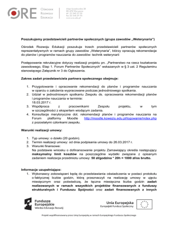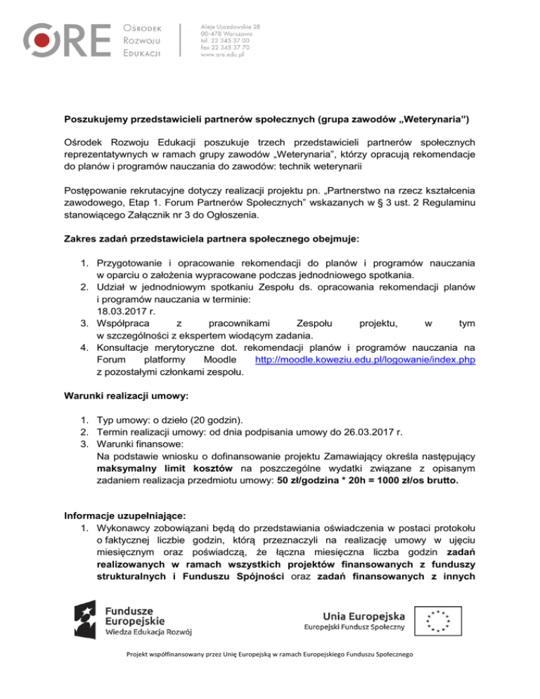 Poszukujemy przedstawicieli partnerów społecznych (grupa zawodów „Weterynaria”) Ośrodek Rozwoju Edukacji poszukuje trzech przedstawicieli partnerów społecznych reprezentatywnych w ramach grupy zawodów „Weterynaria”, którzy opracują rekomendacje do planów i programów nauczania do zawodów: technik weterynarii Postępowanie rekrutacyjne dotyczy realizacji projektu pn. „Partnerstwo na rzecz kształcenia zawodowego, Etap 1. Forum Partnerów Społecznych” wskazanych w § 3 ust. 2 Regulaminu stanowiącego Załącznik nr 3 do Ogłoszenia. Zakres zadań przedstawiciela partnera społecznego obejmuje: 1. Przygotowanie i opracowanie rekomendacji do planów i programów nauczania w oparciu o założenia wypracowane podczas jednodniowego spotkania. 2. Udział w jednodniowym spotkaniu Zespołu ds. opracowania rekomendacji planów i programów nauczania w terminie: 18.03.2017 r. 3. Współpraca z pracownikami Zespołu projektu, w tym w szczególności z ekspertem wiodącym zadania. 4. Konsultacje merytoryczne dot. rekomendacji planów i programów nauczania na Forum platformy Moodle http://moodle.koweziu.edu.pl/logowanie/index.php z pozostałymi członkami zespołu. Warunki realizacji umowy: 1. Typ umowy: o dzieło (20 godzin). 2. Termin realizacji umowy: od dnia podpisania umowy do 26.03.2017 r. 3. Warunki finansowe: Na podstawie wniosku o dofinansowanie projektu Zamawiający określa następujący maksymalny limit kosztów na poszczególne wydatki związane z opisanym zadaniem realizacja przedmiotu umowy: 50 zł/godzina * 20h = 1000 zł/os brutto. Informacje uzupełniające: 1. Wykonawcy zobowiązani będą do przedstawiania oświadczenia w postaci protokołu o faktycznej liczbie godzin, którą przeznaczyli na realizację umowy w ujęciu miesięcznym oraz poświadczą, że łączna miesięczna liczba godzin zadań realizowanych w ramach wszystkich projektów finansowanych z funduszy strukturalnych i Funduszu Spójności oraz zadań finansowanych z innych Projekt współfinansowany przez Unię Europejską w ramach Europejskiego Funduszu Społecznego źródeł, obejmujących okres realizacji umowy zawartej z ORE nie przekracza łącznie 276 godzin miesięcznie. Jednocześnie wykonawca będzie zobowiązany do złożenia oświadczenia, że obciążenie zawodowe nie wyklucza możliwości prawidłowej i efektywnej realizacji wszystkich zadań powierzonych mu w ramach projektu. 2. W ramach spotkań określonych w pkt. 3 Zakresu zadań przedstawiciela partnera społecznego, Zamawiający zapewnia i finansuje nocleg przed spotkaniem oraz wyżywienie w trakcie spotkania. Uczestnikom spotkania zwracane są koszty podróży (do 200 zł - zgodnie z cennikiem biletów II klasy). 3. Spotkanie Zespołu ds. opracowania rekomendacji planów i programów nauczania odbywać się będzie w weekend. Zamawiający zastrzega sobie możliwość zmiany terminów spotkań (zgodnie z harmonogramem realizacji zadań). 4. Osoby będące Partnerami Społecznymi w projekcie nie mogą brać udziału w niniejszej rekrutacji. Zamawiający zastrzega sobie możliwość niewyłonienia Wykonawców bez podania przyczyny. Wymagania stawiane Wykonawcy Wymagania obowiązkowe (oceniane: spełnia/nie spełnia): 1. Min. 3-letnie doświadczenie zawodowe w wybranym/ych zawodzie/zawodach w ramach grupy zawodów „Weterynaria”. 2. Wykształcenie adekwatne do wybranego/ych zawodu/zawodów zadeklarowanego/ych w ramach grupy zawodów „Weterynaria”. 3. Rekomendacja co najmniej jednego partnera społecznego, reprezentatywnego dla wybranego/ych zawodu/zawodów w ramach grupy zawodowej „Weterynaria”. 4. Średnie miesięczne zaangażowanie w realizację zadań we wszystkich projektach finansowanych z funduszy strukturalnych i Funduszu Spójności oraz z zadań finansowanych z innych źródeł (w tym umowa o pracę, umowy zlecenie, umowy o dzieło, działalność gospodarcza) nieprzekraczające 250 godzin. Kryteria oceny wyboru najkorzystniejszej oferty: 1. Oferent może zdobyć maksymalnie 50 punktów. Projekt współfinansowany przez Unię Europejską w ramach Europejskiego Funduszu Społecznego 2. W ramach oceny kompetencje i doświadczenia oferent może uzyskać maksymalnie 40 punktów – kryteria wraz z punktacją zostały podane w formularzu zgłoszeniowym (Załącznik nr 1). Punktacja w zakresie kompetencji i doświadczenia stanowi sumę punktów uzyskanych przez kandydata w części 3 formularza zgłoszeniowego. 3. Zaproponowana cena, za którą można uzyskać maks. 10 pkt: - 10 pkt otrzyma oferta z najniższą ceną, wobec której pozostałe oferty będą porównywane; - cena winna być wyrażona w złotych polskich, zaokrąglona do dwóch miejsc po przecinku zgodnie z zasadami rachunkowymi; - wykonawca może podać tylko jedną cenę – bez proponowania rozwiązań wariantowych. 4. Przyjęty algorytm obliczania ceny: Cena – wzór obliczenia punktów: 𝑃= 𝐶𝑛 ∗ 10 𝑝𝑘𝑡 𝐶𝑏 P – liczba punktów przyznanych badanej ofercie w zakresie ceny Cn – najniższa cena spośród badanych ofert Cb – cena oferty badanej P= Cn Za najkorzystniejszą Zamawiający uzna tę ofertę, która po zsumowaniu obu kryteriów uzyska największą liczbę punktów. W pierwszej kolejności dokonana zostanie ocena formalna. Oferty niespełniające wymogów obowiązkowych nie będą poddawane dalszej ocenie. Minimum punktowe konieczne do uzyskania w kryterium doświadczenie i kompetencje oferenta wynosi 7 punktów. Oferty, które nie spełnią minimum nie będą podlegały dalszej ocenie w kryterium „Zaproponowana cena”. Ponadto w kryteriach wskazane zostały obszary, w których oferent powinien uzyskać minimalną liczbę punktów, nieuzyskanie minimum w co najmniej jednym z ww. obszarów powoduje, że oferta taka nie będzie podlegała dalszej ocenie. Projekt współfinansowany przez Unię Europejską w ramach Europejskiego Funduszu Społecznego Warunki zmiany umowy Zamawiający zastrzega możliwość zmiany t