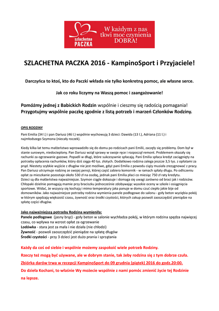SZLACHETNA PACZKA 2016 - KampinoSport i Przyjaciele! Darczyńca to ktoś, kto do Paczki wkłada nie tylko konkretną pomoc, ale własne serce. Jak co roku liczymy na Waszą pomoc i zaangażowanie! Pomóżmy jednej z Babickich Rodzin wspólnie i cieszmy się radością pomagania! Przygotujmy wspólnie paczkę zgodnie z listą potrzeb i marzeń Członków Rodziny. OPIS RODZINY Pani Emilia (34 l.) i pan Dariusz (46 l.) wspólnie wychowują 3 dzieci: Dawida (13 l.), Adriana (11 l.) i najmłodszego Szymona (niecały roczek). Kiedy kilka lat temu małżeństwo wprowadziło się do domu po rodzicach pani Emilii, zaczęły się problemy. Dom był w stanie surowym, niedocieplony. Pan Dariusz wziął sprawy w swoje ręce i rozpoczął remont. Problemem okazały się rachunki za ogrzewanie gazowe. Popadli w długi, które sukcesywnie spłacają. Pani Emilia spłaca kredyt zaciągnięty na potrzeby opłacenia rachunków, który dziś sięga 40 tys. złotych. Dodatkowo rodzina zalega jeszcze 3,5 tys. z opłatami za prąd. Niestety szybkie wyjście z długów nie jest możliwe, gdyż pani Emilia z powodu ciąży musiała zrezygnować z pracy. Pan Dariusz utrzymuje rodzinę ze swojej pensji, której część zabiera komornik - w ramach spłaty długu. Po odliczeniu opłat za mieszkanie pozostaje około 530 zł na osobę, jednak pani Emilia płaci co miesiąc 750 zł raty kredytu. Dzieci są dla małżeństwa najważniejsze. Szymon ciągle dokazuje i domaga się uwagi zarówno od braci jak i rodziców. Chłopaki dzielnie pomagają mamie przy braciszku jednocześnie zdobywając wysokie oceny w szkole i osiągnięcia sportowe. Widać, że wszyscy się kochają i mimo temperatury jaka panuje w domu czuć ciepło jakie bije od domowników. Jako najważniejsze potrzeby rodzina wymienia panele podłogowe do salonu - goły beton wyziębia pokój w którym spędzają większość czasu, żywność oraz środki czystości, których zakup pozwoli zaoszczędzić pieniądze na spłatę części długów. Jako najważniejszą potrzeby Rodzina wymieniła: Panele podłogowe (jasny brąz) - goły beton w salonie wychładza pokój, w którym rodzina spędza najwięcej czasu, co wpływa na wzrost opłat za ogrzewanie Lodówka - stara jest za mała i nie działa (nie chłodzi) Żywność - pozwoli zaoszczędzić pieniądze na spłatę długów Środki czystości - przy 3 dzieci jest dużo prania i sprzątania Każdy da coś od siebie i wspólnie możemy zaspokoić wiele potrzeb Rodziny. Rzeczy też mogą być używane, ale w dobrym stanie, tak żeby rodzina się z tym dobrze czuła. Zbiórka darów trwa w recepcji KampinoSport do 09 grudnia (piątek) 2016 do godz.20:00. Do dzieła Kochani, to właśnie Wy możecie wspólnie z nami pomóc zmienić życie tej Rodzinie na lepsze. POTRZEBY RODZINY ŻYWNOŚĆ TRWAŁA: Podstawowe produkty żywnościowe: Herbata, Kawa, Ryż, Kasza, Makaron, Mąka, Cukier, Olej, Dżem, Konserwy mięsne, Konserwy rybne, Warzywa w puszkach, płatki na mleko, kakao, słodycze dla dzieci, mleko UHT Produkty dla niemowląt: Soczki, kaszki ŚRODKI CZYSTOŚCI I ARTYKUŁY HIGIENICZNE: Potrzebne środki czystości: Proszek do prania, Płyn do mycia naczyń, Mydło/żel myjący, Płyny czyszczące, Szczoteczka do zębów, Pasta do zębów, Szampon Artykuły dziecięce: Pieluchy rozmiar 4, chusteczki nawilżane, oliwka, krem przeciw odparzeniom MATERIAŁY SZKOLNE: Zeszyty, Papier kolorowy, Bloki, Klej, Przybory do pisania, Plastelina Inne: Zeszyty A4 ODZIEŻ I OBUWIE: Lp Płeć Rodzaj (letnie/zimowe/ przejściowe) Kategoria (bluzka, spodnie, kurtka itp.) Rozmiar 1 M Zimowa Kurtka XL 2 3 4 M K M Przejściowe Zimowa Śpioszki Spodnie Kurtka 86 36 XXL Sylwetka dobrze zbudowany Uwagi Zielona Dżinsy Czarna Obuwie Lp Płeć 1 M Rodzaj (letnie / zimowe / przejściowe) Zimowe Kategoria (klapki, tenisówki, kozaki Rozmiar Uwagi itp.) Buty 43 Ciemne Wyposażenie: Lodówka; Panele podłogowe (jasny brąz) 50 m2 z podkładem i listwy (30m) Kołdra, Poduszka + Pościel (160x200) Szczególne upominki: Dawid - zestaw survivalowy, Szymon - zabawka interaktywna Adrian - piłka z ostatnich mistrzostw Emilia - perfumy Dariusz - kosmetyki