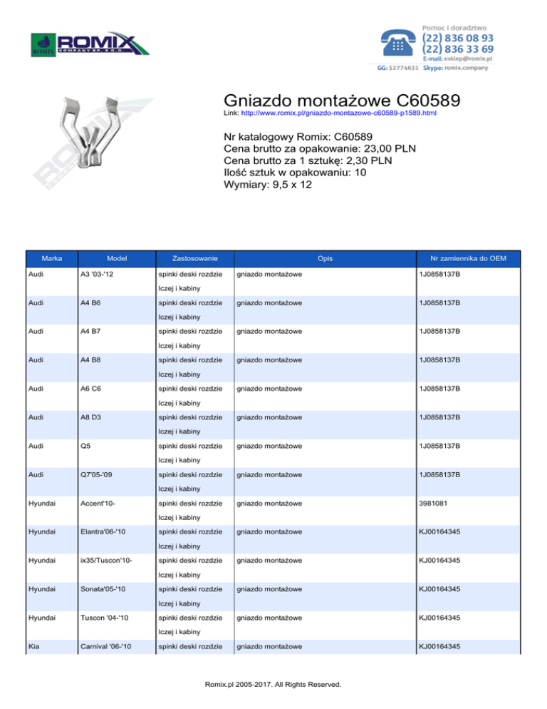 Gniazdo montażowe C60589 Link: http://www.romix.pl/gniazdo-montazowe-c60589-p1589.html Nr katalogowy Romix: C60589 Cena brutto za opakowanie: 23,00 PLN Cena brutto za 1 sztukę: 2,30 PLN Ilość sztuk w opakowaniu: 10 Wymiary: 9,5 x 12 Marka Audi Model A3 '03-'12 Zastosowanie spinki deski rozdzie Opis Nr zamiennika do OEM gniazdo montażowe 1J0858137B gniazdo montażowe 1J0858137B gniazdo montażowe 1J0858137B gniazdo montażowe 1J0858137B gniazdo montażowe 1J0858137B gniazdo montażowe 1J0858137B gniazdo montażowe 1J0858137B gniazdo montażowe 1J0858137B gniazdo montażowe 3981081 gniazdo montażowe KJ00164345 gniazdo montażowe KJ00164345 gniazdo montażowe KJ00164345 gniazdo montażowe KJ00164345 gniazdo montażowe KJ00164345 lczej i kabiny Audi A4 B6 spinki deski rozdzie lczej i kabiny Audi A4 B7 spinki deski rozdzie lczej i kabiny Audi A4 B8 spinki deski rozdzie lczej i kabiny Audi A6 C6 spinki deski rozdzie lczej i kabiny Audi A8 D3 spinki deski rozdzie lczej i kabiny Audi Q5 spinki deski rozdzie lczej i kabiny Audi Q7'05-'09 spinki deski rozdzie lczej i kabiny Hyundai Accent'10- spinki deski rozdzie lczej i kabiny Hyundai Elantra'06-'10 spinki deski rozdzie lczej i kabiny Hyundai ix35/Tuscon'10- spinki deski rozdzie lczej i kabiny Hyundai Sonata'05-'10 spinki deski rozdzie lczej i kabiny Hyundai Tuscon '04-'10 spinki deski rozdzie lczej i kabiny Kia Carnival '06-'10 spinki deski rozdzie Romix.pl 2005-2017. All Rights Reserved. lczej i kabiny Kia Carnival'99-'06 spinki deski rozdzie gniazdo montażowe KJ00164345 gniazdo montażowe KJ00164345 gniazdo montażowe KJ00164345 gniazdo montażowe KJ00164345 gniazdo montażowe KJ00164345 gniazdo montażowe KJ00164345 gniazdo montażowe 1J0858137B gniazdo montażowe 1J0858137B gniazdo montażowe 1J0858137B gniazdo montażowe 1J0858137B gniazdo montażowe 1J0858137B gniazdo montażowe 1J0858137B gniazdo montażowe 1J0858137B gniazdo montażowe 1J0858137B gniazdo montażowe 1J0858137B lczej i kabiny Kia Cerato '03-'08 spinki deski rozdzie lczej i kabiny Kia Optima '05-'10 spinki deski rozdzie lczej i kabiny Kia Rio '00-'05 spinki deski rozdzie lczej i kabiny Kia Rio'05-'11 spinki deski rozdzie lczej i kabiny Kia Soul'08- spinki deski rozdzie lczej i kabiny Seat Alhambra '01-'10 spinki deski rozdzie lczej i kabiny Seat Alhambra '96-'00 spinki deski rozdzie lczej i kabiny Seat Altea spinki deski rozdzie lczej i kabiny Seat Cordoba '03-'09 spinki deski rozdzie lczej i kabiny Seat Exeo spinki deski rozdzie lczej i kabiny Seat Ibiza '02-'08 spinki deski rozdzie lczej i kabiny Seat Leon '05-'13 spinki deski rozdzie lczej i kabiny Seat Toledo '05-'09 spinki deski rozdzie lczej i kabiny Skoda Fabia '00-'08 spinki deski rozdzie lczej i kabiny Skoda Skoda Fabia '07- Octavia II mocowania słupków we i nakładki, elementy w bagażniku, deska rozdziel 1J0858137B wnętrznych cza, gniazdo montażowe spinki deski rozdzie gniazdo montażowe 1J0858137B gniazdo montażowe 1J0858137B lczej i kabiny Skoda Roomster spinki deski rozdzie lczej i kabiny Skoda Superb '08- mocowania słupków we i nakładki, deska rozdzielcza, gniazdo montażowe 1J0858137B wnętrznych Skoda Yeti mocowania słupków we i nakładki, deska rozdzielcza, gniazdo montażowe 1J0858137B wnętrznych Volvo C30 '06-'12 spinki deski rozdzie gniazdo montażowe 3981081 gniazdo montażowe 3981081 lczej i kabiny Volvo C70 '97-'06 spinki deski rozdzie Romix.pl 2005-2017. All Rights Reserved. lczej i kabiny Volvo S40/V50 '04-'07 spinki deski rozdzie gniazdo montażowe 3981081 gniazdo montażowe 3981081 lczej i kabiny Volvo S40/V50 '07- spinki deski rozdzie lczej i kabiny Volvo S60 '00-'09 spinki deski rozdzie gniazdo montażowe lczej i kabiny Volvo S60 '10- spinki deski rozdzie gniazdo montażowe lczej i kabiny Volvo S80 '99-'07 spinki deski rozdzie gniazdo montażowe lczej i kabiny Volvo S80'07- spinki deski rozdzie gniazdo montażowe 3981081 gniazdo montażowe 3981081 gniazdo montażowe 3981081 gniazdo montażowe 3981081 gniazdo montażowe 3981081 gniazdo montażowe 3981081 gniazdo montażowe 1J0858137B mocowania listew pro tapicerka, półka bagażnika, wykończenia deski ro 1J0858137B gowych zdzielczej, gniazdo montażowe mocowania listew pro tapicerka, półka bagażnika, wykończenia deski ro gowych zdzielczej, gniazdo montażowe spinki deski rozdzie gniazdo montażowe 1J0858137B gniazdo montażowe 1J0858137B gniazdo montażowe 1J0858137B gniazdo montażowe 1J0858137B gniazdo montażowe 1J0858137B gniazdo montażowe 1J0858137B lczej i kabiny Volvo V70 '00-'08 spinki deski rozdzie lczej i kabiny Volvo V70'08- spinki deski rozdzie lczej i kabiny Volvo XC60 spinki deski rozdzie lczej i kabiny Volvo XC70 '00-'07 spinki deski rozdzie lczej i kabiny Volvo XC90 spinki deski rozdzie lczej i kabiny VW Eos spinki deski rozdzie lczej i kabiny VW VW VW Golf V Golf VI Jetta '05-'10 1J0858137B lczej i kabiny VW Polo '01-'09 spinki deski rozdzie lczej i kabiny VW Sharan '01-'10 spinki deski rozdzie lczej i kabiny VW Sharan '96-'00 spinki deski rozdzie lczej i kabiny VW T5 spinki deski rozdzie lczej i kabiny VW Tiguan spinki deski rozdzie lczej i kabiny Romix.pl 2005-2017. All Rights Reserved.