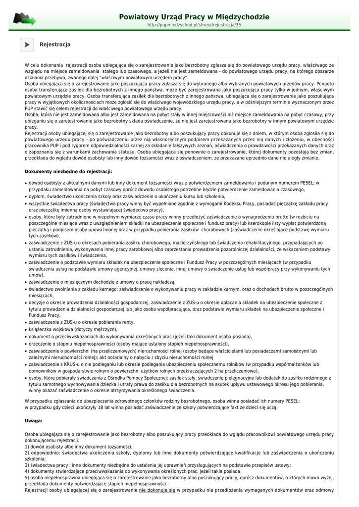 Powiatowy Urząd Pracy w Międzychodzie http://pupmiedzychod.pl/strona/rejestracja/35 Rejestracja W celu dokonania rejestracji osoba ubiegająca się o zarejestrowanie jako bezrobotny zgłasza się do powiatowego urzędu pracy, właściwego ze względu na miejsce zameldowania stałego lub czasowego, a jeżeli nie jest zameldowana - do powiatowego urzędu pracy, na którego obszarze działania przebywa, zwanego dalej "właściwym powiatowym urzędem pracy". Osoba ubiegająca się o zarejestrowanie jako poszukująca pracy zgłasza się do wybranego albo wybranych powiatowych urzędów pracy. Ponadto osoba transferująca zasiłek dla bezrobotnych z innego państwa, może być zarejestrowana jako poszukująca pracy tylko w jednym, właściwym powiatowym urzędzie pracy. Osoba transferująca zasiłek dla bezrobotnych z innego państwa, ubiegająca się o zarejestrowanie jako poszukująca pracy w wyjątkowych okolicznościach może zgłosić się do właściwego wojewódzkiego urzędu pracy, a w późniejszym terminie wyznaczonym przez PUP stawić się celem rejestracji do właściwego powiatowego urzędu pracy. Osoba, która nie jest zameldowana albo jest zameldowana na pobyt stały w innej miejscowości niż miejsce zameldowania na pobyt czasowy, przy ubieganiu się o zarejestrowanie jako bezrobotny składa oświadczenie, że nie jest zarejestrowana jako bezrobotny w innym powiatowym urzędzie pracy. Rejestracji osoby ubiegającej się o zarejestrowanie jako bezrobotny albo poszukujący pracy dokonuje się z dniem, w którym osoba zgłosiła się do powiatowego urzędu pracy - po poświadczeniu przez nią własnoręcznym podpisem przekazanych przez nią danych i złożeniu, w obecności pracownika PUP i pod rygorem odpowiedzialności karnej za składanie fałszywych zeznań, oświadczenia o prawdziwości przekazanych danych oraz o zapoznaniu się z warunkami zachowania statusu. Osoba ubiegająca się ponownie o zarejestrowanie, której dokumenty pozostają bez zmian, przedkłada do wglądu dowód osobisty lub inny dowód tożsamości wraz z oświadczeniem, ze przekazane uprzednio dane nie uległy zmianie. Dokumenty niezbędne do rejestracji: ● ● ● ● ● ● ● ● ● ● dowód osobisty z aktualnymi danymi lub inny dokument tożsamości wraz z potwierdzeniem zameldowania i podanym numerem PESEL; w przypdaku zameldowania na pobyt czasowy oprócz dowodu osobistego potrzebne będzie potwierdzenie zameldowania czasowego, dyplom, świadectwo ukończenia szkoły oraz zaświadczenie o ukończeniu kursu lub szkolenia, wszystkie świadectwa pracy (świadectwa pracy winny być wypełnione zgodnie z wymogami Kodeksu Pracy, posiadać pieczątkę zakładu pracy oraz pieczątkę imienną osoby wystawiającej świadectwo pracy), osoby, które były zatrudnione w niepełnym wymiarze czasu pracy winny przedłożyć zaświadczenie o wynagrodzeniu brutto (w rozbiciu na poszczególne miesiące wraz z uwzględnieniem składki na ubezpieczenie społeczne i fundusz pracy) lub kserokopie listy wypłat potwierdzoną pieczątką i podpisem osoby upoważnionej oraz w przypadku pobierania zasiłków chorobowych (zaświadczenie określające podstawę wymiaru tych zasiłków), zaświadczenie z ZUS-u o okresach pobierania zasiłku chorobowego, macierzyńskiego lub świadczenia rehabilitacyjnego, przypadających po ustaniu zatrudnienia, wykonywania innej pracy zarobkowej albo zaprzestania prowadzenia pozarolniczej działalności, ze wskazaniem podstawy wymiaru tych zasiłków i świadczenia, zaświadczenie o podstawie wymiaru składek na ubezpieczenie społeczne i Fundusz Pracy w poszczególnych miesiącach (w przypadku świadczenia usług na podstawie umowy agencyjnej, umowy zlecenia, innej umowy o świadczenie usług lub współpracy przy wykonywaniu tych umów), zaświadczenie o miesięcznym dochodzie z umowy o pracę nakładczą, świadectwo zwolnienia z zakładu karnego; zaświadczenie o wykonywaniu pracy w zakładzie karnym, oraz o dochodach brutto w poszczególnych miesiącach, decyzje o okresie prowadzenia działalności gospodarczej, zaświadczenie z ZUS-u o okresie opłacania składek na ubezpieczenie społeczne z tytułu prowadzenia działalności gospodarczej lub jako osoba współpracująca, oraz podstawie wymiaru składek na ubezpieczenie społeczne i Fundusz Pracy, zaświadczenie z ZUS-u o okresie pobierania renty, ● książeczka wojskowa (dotyczy mężczyzn), ● dokument o przeciwwskazaniach do wykonywania określonych prac (jeżeli taki dokument osoba posiada), ● orzeczenie o stopniu niepełnosprawności (osoby mające ustalony stopień niepełnosprawności), ● ● ● zaświadczenie o powierzchni (ha przeliczeniowych) nieruchomości rolnej (osoby będące właścicielami lub posiadaczami samoistnymi lub zależnymi nieruchomości rolnej); akt notarialny o nabyciu / zbyciu nieruchomości rolnej zaświadczenie z KRUS-u o nie podleganiu lub okresie podlegania ubezpieczeniu społecznemu rolników (w przypadku współmałżonków lub domowników w gospodarstwie rolnym o powierzchni użytków rolnych przekraczających 2 ha przeliczeniowe), osoby, które pobierały świadczenia z Ośrodka Pomocy Społecznej: zasiłek stały, świadczenie pielęgnacyjne lub dodatek do zasiłku rodzinnego z tytułu samotnego wychowywania dziecka i utraty prawa do zasiłku dla bezrobotnych na skutek upływu ustawowego okresu jego pobierania, winny okazać zaświadczenie o okresie otrzymywania określonego świadczenia. W przypadku zgłaszania do ubezpieczenia zdrowotnego członków rodziny bezrobotnego, osoba winna posiadać ich numery PESEL; w przypadku gdy dzieci ukończyły 18 lat winna posiadać zaświadczenie ze szkoły potwierdzające fakt że dzieci się uczą; Uwaga: Osoba ubiegająca się o zarejestrowanie jako bezrobotny albo poszukujący pracy przedkłada do wglądu pracownikowi powiatowego urzędu pracy dokonującemu rejestracji: 1) dowód osobisty albo inny dokument tożsamości; 2) odpowiednio: świad
