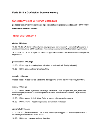 Ferie 2014 z Gryfińskim Domem Kultury Świetlica Wiejska w Nowym Czarnowie podczas ferii zimowych czynna od poniedziałku do piątku w godzinach 13.00-19.00 instruktor: Mariola Lenart TEREFERE FERIE 2014 piątek, 14 lutego 13.00 -16.00: „Walenty i Walentynka, czyli pomysły na wyznania” - warsztaty plastyczne z udziałem instruktora GDK w zakresie filcowania; wykonywanie okolicznościowych kartek 16.00 – 19.00: „Przez żołądek do serca” –zajęcia kulinarne – pieczenie naleśników i gofrów, degustacja poniedziałek, 17 lutego 13.00 - 15.30: zajęcia prelekcyjne z udziałem przedstawicieli Straży Miejskiej 16.00 - 19.00: „Zimowe kino” projekcja filmu wtorek, 18 lutego wyjazd dzieci i młodzieży do Szczecina do kręgielni, spacer po mieście i wizyta w KFC środa, 19 lutego 11.00 - 13.00: „Leśne tajemnice zimowego królestwa…czyli o czym zimą śnią zwierzęta”. Warsztaty przyrodnicze z udziałem przedstawiciela Nadleśnictwo Gryfino. Gry i zabawy edukacyjne 13.00 - 15.00: wyjazd do leśnictwa Gajki w ramach dokarmiania zwierząt 15.00 - 17.00: powrót i wspólne ognisko z pieczeniem kiełbasek czwartek, 20 lutego 13.00 -16.00: „Światowe smaki. Jak to z tą pizzą naprawdę jest?” - warsztaty kulinarne z udziałem przedstawiciela Hallo Pizza 16.00 - 19.00: gry i zabawy, zajęcia dowolne piątek, 21 lutego 13.00 - 15.00: „Śnieżne ślady” zajęcia plastyczne 15.30 - 18.00: warsztaty biblioterapeutyczne z udziałem pracownika Biblioteki Publicznej w Gryfinie poniedziałek, 24 lutego 13.00 -16.00: zajęcia plastyczne- wykonywanie masek karnawałowych 16.00 - 19.00: projekcja filmu wtorek, 25 lutego 13.00 -16.00: „Pchli targ czyli dla każdego coś pożytecznego” impreza dla mieszkańców mająca na celu wzajemną i darmową wymianę użytecznych przedmiotów 16.00 - 19.00: gry i zabawy, zajęcia dowolne środa, 26 lutego 13.00 -16.00: zajęcia plastyczne - masa solna i odlewy z gipsu 16.00 - 19.00: projekcja filmu czwartek, 27 lutego 13.00 - 19.00: „Tłusty czwartek” – pieczenie pączków i chrustów; zabawa karnawałowa dla dzieci i młodzieży piątek, 28 lutego 13.00 - 16.00: projekcja filmu 16.30 - 19.00: kulig, wspólne ognisko z pieczeniem kiełbasek sobota, 1 marca 13.00 - 16.30: spotkanie z proboszczem parafii w Pniewie, projekcja filmu i wspólna pogadanka 17.00 - 19.00: gry i zabawy, zajęcia dowolne