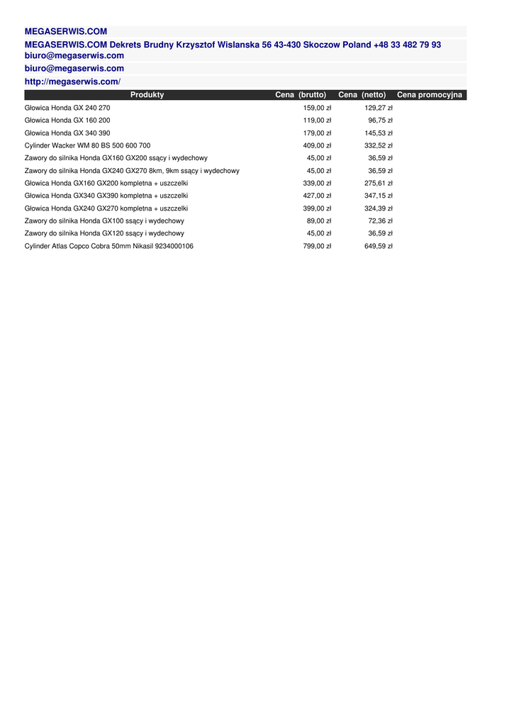 MEGASERWIS.COM MEGASERWIS.COM Dekrets Brudny Krzysztof Wislanska 56 43-430 Skoczow Poland +48 33 482 79 93 [email protected] [email protected] http://megaserwis.com/ Produkty Cena (brutto) Cena (netto) Cena promocyjna Głowica Honda GX 240 270 159,00 zł 129,27 zł Głowica Honda GX 160 200 119,00 zł 96,75 zł Głowica Honda GX 340 390 179,00 zł 145,53 zł Cylinder Wacker WM 80 BS 500 600 700 409,00 zł 332,52 zł 45,00 zł 36,59 zł Zawory do silnika Honda GX160 GX200 ssący i wydechowy Zawory do silnika Honda GX240 GX270 8km, 9km ssący i wydechowy 45,00 zł 36,59 zł Głowica Honda GX160 GX200 kompletna + uszczelki 339,00 zł 275,61 zł Głowica Honda GX340 GX390 kompletna + uszczelki 427,00 zł 347,15 zł Głowica Honda GX240 GX270 kompletna + uszczelki 399,00 zł 324,39 zł Zawory do silnika Honda GX100 ssący i wydechowy 89,00 zł 72,36 zł Zawory do silnika Honda GX120 ssący i wydechowy 45,00 zł 36,59 zł 799,00 zł 649,59 zł Cylinder Atlas Copco Cobra 50mm Nikasil 9234000106