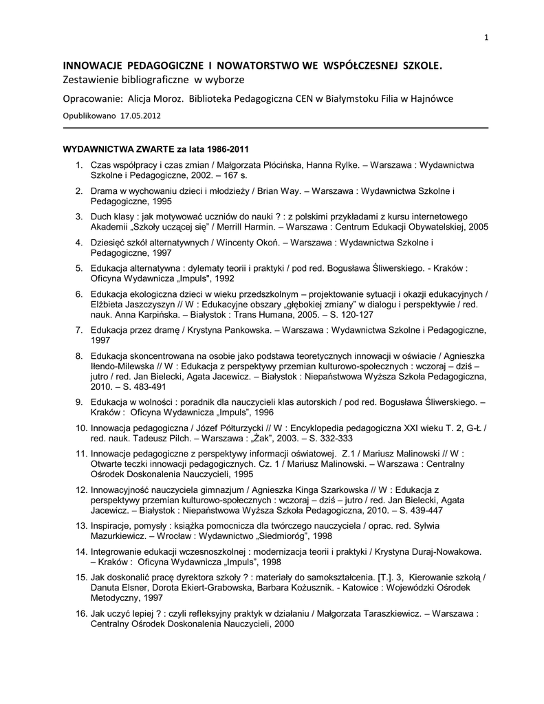 1 INNOWACJE PEDAGOGICZNE I NOWATORSTWO WE WSPÓŁCZESNEJ SZKOLE. Zestawienie bibliograficzne w wyborze Opracowanie: Alicja Moroz. Biblioteka Pedagogiczna CEN w Białymstoku Filia w Hajnówce Opublikowano 17.05.2012 WYDAWNICTWA ZWARTE za lata 1986-2011 1. Czas współpracy i czas zmian / Małgorzata Płócińska, Hanna Rylke. – Warszawa : Wydawnictwa Szkolne i Pedagogiczne, 2002. – 167 s. 2. Drama w wychowaniu dzieci i młodzieży / Brian Way. – Warszawa : Wydawnictwa Szkolne i Pedagogiczne, 1995 3. Duch klasy : jak motywować uczniów do nauki ? : z polskimi przykładami z kursu internetowego Akademii „Szkoły uczącej się” / Merrill Harmin. – Warszawa : Centrum Edukacji Obywatelskiej, 2005 4. Dziesięć szkół alternatywnych / Wincenty Okoń. – Warszawa : Wydawnictwa Szkolne i Pedagogiczne, 1997 5. Edukacja alternatywna : dylematy teorii i praktyki / pod red. Bogusława Śliwerskiego. - Kraków : Oficyna Wydawnicza „Impuls", 1992 6. Edukacja ekologiczna dzieci w wieku przedszkolnym – projektowanie sytuacji i okazji edukacyjnych / Elżbieta Jaszczyszyn // W : Edukacyjne obszary „głębokiej zmiany” w dialogu i perspektywie / red. nauk. Anna Karpińska. – Białystok : Trans Humana, 2005. – S. 120-127 7. Edukacja przez dramę / Krystyna Pankowska. – Warszawa : Wydawnictwa Szkolne i Pedagogiczne, 1997 8. Edukacja skoncentrowana na osobie jako podstawa teoretycznych innowacji w oświacie / Agnieszka Iłendo-Milewska // W : Edukacja z perspektywy przemian kulturowo-społecznych : wczoraj – dziś – jutro / red. Jan Bielecki, Agata Jacewicz. – Białystok : Niepaństwowa Wyższa Szkoła Pedagogiczna, 2010. – S. 483-491 9. Edukacja w wolności : poradnik dla nauczycieli klas autorskich / pod red. Bogusława Śliwerskiego. – Kraków : Oficyna Wydawnicza „Impuls”, 1996 10. Innowacja pedagogiczna / Józef Półturzycki // W : Encyklopedia pedagogiczna XXI wieku T. 2, G-Ł / red. nauk. Tadeusz Pilch. – Warszawa : „Żak”, 2003. – S. 332-333 11. Innowacje pedagogiczne z perspektywy informacji oświatowej. Z.1 / Mariusz Malinowski // W : Otwarte teczki innowacji pedagogicznych. Cz. 1 / Mariusz Malinowski. – Warszawa : Centralny Ośrodek Doskonalenia Nauczycieli, 1995 12. Innowacyjność nauczyciela gimnazjum / Agnieszka Kinga Szarkowska // W : Edukacja z perspektywy przemian kulturowo-społecznych : wczoraj – dziś – jutro / red. Jan Bielecki, Agata Jacewicz. – Białystok : Niepaństwowa Wyższa Szkoła Pedagogiczna, 2010. – S. 439-447 13. Inspiracje, pomysły : książka pomocnicza dla twórczego nauczyciela / oprac. red. Sylwia Mazurkiewicz. – Wrocław : Wydawnictwo „Siedmioróg”, 1998 14. Integrowanie edukacji wczesnoszkolnej : modernizacja teorii i praktyki / Krystyna Duraj-Nowakowa. – Kraków : Oficyna Wydawnicza „Impuls”, 1998 15. Jak doskonalić pracę dyrektora szkoły ? : materiały do samokształcenia. [T.]. 3, Kierowanie szkołą / Danuta Elsner, Dorota Ekiert-Grabowska, Barbara Kożusznik. - Katowice : Wojewódzki Ośrodek Metodyczny, 1997 16. Jak uczyć lepiej ? : czyli refleksyjny praktyk w działaniu / Małgorzata Taraszkiewicz. – Warszawa : Centralny Ośrodek Doskonalenia Nauczycieli, 2000 2 17. Jak uczyć, żeby nauczyć / Przemysław Bąbel, Marzena Wiśniak. – Warszawa : Wydawnictwa Szkolne i Pedagogiczne, 2008 18. Jak zmieniać szkołę ? : studia z polityki oświatowej i pedagogiki porównawczej / Bogusław Śliwerski. – Kraków : Oficyna Wydawnicza „Impuls”, 1998 19. Klasy autorskie w szkołach twórczych / Danuta Nakoneczna. – Warszawa : Towarzystwo Szkół Twórczych, 1993 20. Kryteria oceny innowacji pedagogicznych. Z.1 / Roman Schulz // W : Otwarte teczki innowacji pedagogicznych. Cz. 1 / Mariusz Malinowski. – Warszawa : Centralny Ośrodek Doskonalenia Nauczycieli, 1995 21. Kształcenie wyzwalające w edukacji wczesnoszkolnej / Władysław Puślecki. - Kraków: Oficyna Wydawnicza „Impuls”, 1996 22. Metody działań korekcyjnych w socjoterapii jako forma innowacyjnej pracy z dziećmi i młodzieżą / Dominika Kosewska // W : Edukacja z perspektywy przemian kulturowo-społecznych : wczoraj – dziś – jutro / red. Jan Bielecki, Agata Jacewicz. – Białystok : Niepaństwowa Wyższa Szkoła Pedagogiczna, 2010. – S. 555-562 23. Motywowanie uczniów do nauki / Jere Brophy. – Warszawa : Wydawnictwo Naukowe PWN, 2004 24. Nauczanie otwarte w 28 krokach / Bernd Badegruber. – Warszawa : Wydawnictwa Szkolne i Pedagogiczne, 1997 25. Nauczanie twórczości – twórcze nauczanie. Wspomaganie w rozwoju / Agata Cudowska // W : Edukacja w okresie przemian / red. nauk. Anna Karpińska. – Białystok : Trans Humana, 2010. – S. 199-208 26. Nauczyciel i innowacje pedagogiczne / Daniela Rusakowska. – Warszawa : Instytut Wydawniczy Związków Zawodowych, 1986 27. Nauczyciel jako innowator / Roman Schulz. – Warszawa : Wydawnictwa Szkolne i Pedagogiczne, 1989 28. Nauczyciel kompetentny : teraźniejszość i przyszłość / red. Zdzisław Bartkowicz, Marzena Kowaluk, Małgorzata Samujło. – Lublin : Wydawnictwo Uniwersytetu Marii Curie-Skłodowskiej, 2007. – 412 s. 29. Nauczycielskie wyzwania w erze zrównoważonego rozwoju / Edyta Wolter // W : Edukacja „głębszego poziomu” w dialogu i perspektywie / red. nauk. Anna Karpińska. – Białystok : Trans Humana, 2005. – S. 235-242 30. Nie lekcje, lecz zajęcia edukacyjne / Elżbieta Goźlińska. - Warszawa : Wydawnictwa Szkolne i Pedagogiczne, cop. 2004 31. Nowe uwarunkowania edukacji szkolnej / red. Stefan M. Kwiatkowski. – Warszawa : Instytut Badań Edukacyjnych, 1997 32. Nowoczesne nauczanie : praktyczne wskazówki i techniki dla nauczycieli, wykładowców i szkoleniowców / Geoff Petty. – Sopot : Gdańskie Wydawnictwo Psychologiczne, 2010 33. O nauczaniu i uczeniu się w „zielonych szkołach” – uogólnienia, postulaty i wnioski / Stefan Kokociński // W : Edukacyjne obszary „głębokiej zmiany” w dialogu i perspektywie / 