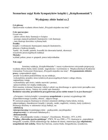 Scenariusz zajęć Koła Sympatyków książki ( „Książkomaniak”) Wydajemy zbiór baśni cz.2 Cel główny Opracowanie wydania zbioru baśni „Przyjaźń niejedno ma imię” Cele operacyjne: Uczeń wie: - jakim celom służy ilustracja w książce - poznaje znanych polskich ilustratorów i ich ilustracje - sam ilustruje dowolnie wybraną baśń Środki: książki z wybranymi ilustracjami znanych ilustratorów, plansza z budową książki, kartki A4, kredki, pastele, koszulki do chowania kartek, skoroszyt wizytówki poszczególnych redakcji Metody: wykład, pokaz, praca w grupach, praca indywidualna Tok zajęć Jesteśmy redakcją „KsiążkoManiaka” i nasze wydawnictwo otrzymało propozycję wydania zbioru baśni, które zostały nagrodzone i wyróżnione w Międzyszkolnym Konkursie Literackiej Twórczości Dziecięcej „Przyjaźń niejedno ma imię”. Przypomnienie efektów pracy z poprzednich zajęć: przede wszystkim podzieliliśmy się na redakcje, wykonaliśmy projekty stron tytułowych poszczególnych baśni i całego zbioru, napisaliśmy wstęp, wykonaliśmy spis treści, indeks nazwisk i postaci, opracowaliśmy też stopkę redakcyjną . Dziś musimy wykonać ilustracje i ułożyć całość wg określonego w spisie treści porządku oraz ponumerować strony. Należy też zrobić spis ilustracji. Redaktor naczelny przedstawia przygotowany przez siebie temat Co to jest ilustracja? „Związane z treścią książki i czasopisma uzupełnienie w postaci oryginalnego lub zreprodukowanego rysunku, obrazu , zdjęcia fotogr. W szerszym pojęciu ilustracja to również ornament zdobiący kartę tekstu, treścią odpowiadający charakterowi książki ( inicjały, ramki, nagłówki, winiety, karty tytułowe). Ilustrację dzielimy w zależności od jej funkcji, na: -zdobniczą -interpretacyjną (wyjaśniająca tekst – podręczniki, encyklopedie) -ekspresywną ( w utworach fabularnych ) -dokumentalną ” Patrz. „Encyklopedia wiedzy o książce”, Ossolineum, Wrocław, 1971, k.952. Według „Słownika języka polskiego”, PWN, W-wa,1988, s.773, ilustracja to „reprodukcja fotografii, rysunku, dzieła malarskiego itp. dodana do tekstu, stanowiąca jego objaśnienie, uzupełnienie lub ozdobę. Może być barwna, czarno-biała, fotograficzna, rysunkowa, malarska”. Specjalna funkcja ilustracji w komiksie i czasopiśmie. Pokaz przykładów wybranych ilustracji w książkach. Ilustracje Andriollego, J. Szancera, Sempe- Goscinny’ego, Loftinga i innych. Ustalenie jakiego rodzaju ilustracje należy wykonać w przypadku baśni. Grupa ustala, że w naszym przypadku ilustracja ma pełnić funkcję zdobniczą, może też być uzupełnieniem tekstu. Każda ilustracja może być podpisana (dyskretnie), może też posiadać tytuł. Wykonanie ilustracji do wybranych i przeczytanych wcześniej baśni. Przypomnienie o estetyce pracy. Wykonane ilustracje(wraz z nazwiskami i tytułami) trafiają do red. nacz., który zleca wykonanie spisu ilustracji (red. naukowa). Red. techniczna układa tekst wg spisu treści, red graf. proponuje numerację stron , red. nauk. uzupełnia wszystkie spisy i indeksy o paginację. Redaktor naczelny nadzoruje całość wydawnictwa i ukończone oddaje do biblioteki szkolnej.