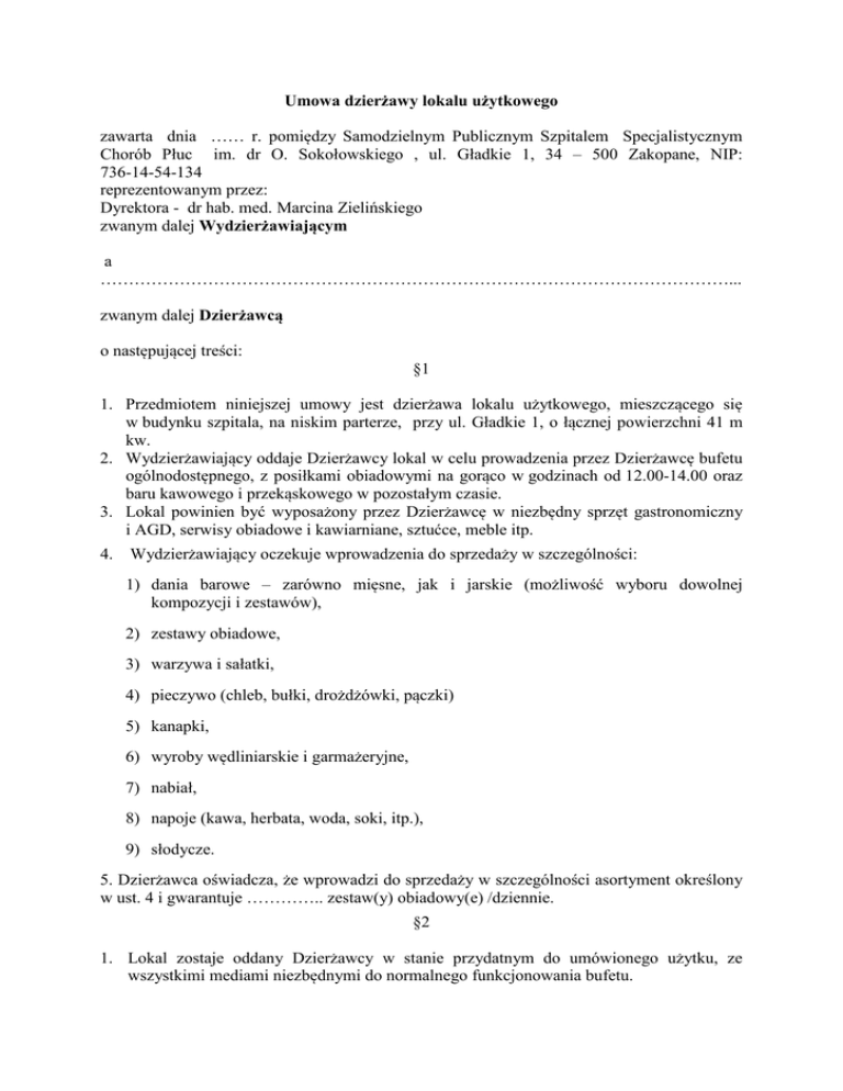 Umowa dzierżawy lokalu użytkowego zawarta dnia …… r. pomiędzy Samodzielnym Publicznym Szpitalem Specjalistycznym Chorób Płuc im. dr O. Sokołowskiego , ul. Gładkie 1, 34 – 500 Zakopane, NIP: 736-14-54-134 reprezentowanym przez: Dyrektora - dr hab. med. Marcina Zielińskiego zwanym dalej Wydzierżawiającym a …………………………………………………………………………………………………... zwanym dalej Dzierżawcą o następującej treści: §1 1. Przedmiotem niniejszej umowy jest dzierżawa lokalu użytkowego, mieszczącego się w budynku szpitala, na niskim parterze, przy ul. Gładkie 1, o łącznej powierzchni 41 m kw. 2. Wydzierżawiający oddaje Dzierżawcy lokal w celu prowadzenia przez Dzierżawcę bufetu ogólnodostępnego, z posiłkami obiadowymi na gorąco w godzinach od 12.00-14.00 oraz baru kawowego i przekąskowego w pozostałym czasie. 3. Lokal powinien być wyposażony przez Dzierżawcę w niezbędny sprzęt gastronomiczny i AGD, serwisy obiadowe i kawiarniane, sztućce, meble itp. 4. Wydzierżawiający oczekuje wprowadzenia do sprzedaży w szczególności: 1) dania barowe – zarówno mięsne, jak i jarskie (możliwość wyboru dowolnej kompozycji i zestawów), 2) zestawy obiadowe, 3) warzywa i sałatki, 4) pieczywo (chleb, bułki, drożdżówki, pączki) 5) kanapki, 6) wyroby wędliniarskie i garmażeryjne, 7) nabiał, 8) napoje (kawa, herbata, woda, soki, itp.), 9) słodycze. 5. Dzierżawca oświadcza, że wprowadzi do sprzedaży w szczególności asortyment określony w ust. 4 i gwarantuje ………….. zestaw(y) obiadowy(e) /dziennie. §2 1. Lokal zostaje oddany Dzierżawcy w stanie przydatnym do umówionego użytku, ze wszystkimi mediami niezbędnymi do normalnego funkcjonowania bufetu. 2. Wydanie Dzierżawcy lokalu nastąpi w dniu podpisania umowy na podstawie protokołu zdawczo-odbiorczego. §3 W trakcie realizacji umowy Dzierżawca może wykonywać w lokalu prace adaptacyjne i wprowadzić w nim stosowne ulepszenia na własny koszt, po uprzednim uzyskaniu pisemnej zgody Wydzierżawiającego. §4 1 Dzierżawca zobowiązany jest: 1) korzystać z lokalu zgodnie z umową, w sposób nie zakłócający funkcjonowanie szpitala 2) pokrywać koszty drobnych napraw i prac konserwacyjnych związanych ze zwykłym korzystaniem z lokalu, 3) utrzymywać w lokalu czystość i porządek, 4) do zagospodarowania i prowadzenia racjonalnej gospodarki resztek pokonsumpcyjnych, zgodnie z ustawą z dnia 14.12.2012 r. o odpadach (Dz. U. z 2013 r. poz.21 ze zm.) poza siedzibą Szpitala, 5) po wygaśnięciu lub rozwiązaniu umowy zwrócić lokal w stanie nie pogorszonym. 2. Dzierżawca nie może bez pisemnej zgody Wydzierżawiającego oddać lokalu osobie trzeciej do bezpłatnego używania albo poddzierżawy. 3. Dzierżawca ponosi odpowiedzialność za wszelkie szkody powstałe na mieniu Wydzierżawiającego bądź osób trzecich powstałe w wyniku zaniedbań lub nieprawidłowej eksploatacji przedmiotu umowy. 1. 2. 1. 2. 3. 4. 5. 6. 7. 8. 9. §5 Lokal powinien spełniać wymogi sanitarno – higieniczne. W oddanym Dzierżawcy do używania lokalu powinny być przestrzegane przepisy BHP i p.poż. §6 Za korzystanie z lokalu określonego w § 1 ustalono miesięczny czynsz w wysokości netto ….. zł/ m², co łącznie wynosi …… (słownie: ………………………….) plus podatek VAT. Czynsz, o którym mowa w ust. 1, będzie płatny w terminie 7 dni od dnia doręczenia Dzierżawcy faktury przez Wydzierżawiającego na konto wskazane w fakturze. Strony ustalają kaucję w wysokości dwóch miesięcznych czynszów dzierżawy. Kaucja jest pobierana jako zabezpieczenie ewentualnych roszczeń z tytułu zniszczenia lokalu ponad normalne zużycie w trakcie używania oraz zabezpieczenia wszelkich należności finansowych . Kaucja zostanie wpłacona w dniu podpisania umowy dzierżawy. Kaucja zostanie zwrócona niezwłocznie po rozliczeniu należności oraz przyjęciu lokalu przez wydzierżawiającego po wygaśnięciu lub rozwiązaniu umowy dzierżawy. Dzierżawca pokrywa opłaty za energię elektryczną, wodę ścieki według wskazań liczników oraz ryczałtowo………… zł za telefon. Należności wymienione w ust. 7 Dzierżawca będzie płacić Wydzierżawiającemu w sposób określony w ust. 2. W przypadku zwłoki w płatności czynszu i opłat eksploatacyjnych Dzierżawca jest obowiązany do zapłacenia odsetek ustawowych. §7 Umowa zostaje zawarta na okres dwóch lat tj. od ……………. do ……………. r. §8 Wydzierżawiający zastrzega sobie prawo rozwiązania niniejszej umowy bez uprzedniego jej wypowiedzenia w przypadku gdy: 1. Dzierżawca używa przedmiotu najmu w sposób niezgodny z niniejszą umową, 2. poddzierżawi przedmiot umowy osobie trzeciej bez uprzedniej zgody Wydzierżawiającego wyrażonej na piśmie, 3. zalega z zapłatą czynszu bądź opłatami eksploatacyjnymi powyżej 30 dni. §9 1. W przypadku nie wywiązania się z obowiązku , o którym mowa w § 4 ust. 1 pkt 5 umowy Dzierżawca zobowiązany jest do zapłaty kary umownej w wysokości 3 krotnego miesięcznego czynszu dzierżawy, płatnej w sposób określony w § 6 ust. 2. 2. Zastrzeżenie ust. 1 nie wyklucza żądania odszkodowania przewyższającego wysokość naliczonej kary umownej. § 10 W przypadku rozwiązania lub wygaśnięcia umowy Wydzierżawiający zatrzymuje nieodpłatnie wszelkie nakłady związane z adaptacją i ulepszeniem lokalu dokonane w trakcie trwania umowy przez Dzierżawcę. § 11 Wszelkie zmiany umowy wymagają formy pisemnej pod rygorem nieważności. § 12 W sprawach nie uregulowanych umową zastosowanie mają przepisy kodeksu cywilnego. § 13 Spory wynikające ze stosunku objętego umową będzie rozstrzygał Sąd właściwy dla Wydzierżawiającego. § 14 Umowę sporządzono w dwóch jednobrzmiących egzemplarzach, po jednym dla każdej ze stron. ………………………………. Wydzierżawiający …………………………
