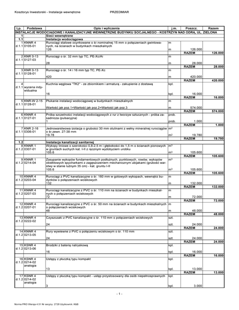 Kosztorys Inwestorski - Instalacje wewnętrzne PRZEDMIAR Lp. Podstawa Opis i wyliczenia j.m. Poszcz. Razem INSTALACJE WODOCIĄGOWE I KANALIZACYJNE WEWNĘTRZNE BUDYNKU SOCJALNEGO - KOSTRZYN NAD ODRĄ, UL. ZIELONA 1 Sieci wewnętrzne 1.1 Instalacja wodociągowa 1 KNNR 4 Rurociągi stalowe ocynkowane o śr.nominalnej 15 mm o połączeniach gwintowam d.1.1 0105-01 nych, na ścianach w budynkach mieszkalnych 126 m 126.000 RAZEM 126.000 2 KNR 0-13 Rurociągi o śr. 32 mm typ TC, PE-Xc/Ai m d.1.1 0127-03 28 m 28.000 RAZEM 28.000 3 KNR 0-13 Rurociągi o śr. 14 i 16 mm typ TC, PE-Xc m d.1.1 0128-01 420 m 420.000 RAZEM 420.000 4 Kuchnia węglowa "TK2" - ze zbiornikiem i armaturą - zakupienie z dostawą kpl. d.1.1 wycena indywidualna 16 kpl. 16.000 RAZEM 16.000 5 KNR-W 2-15 Płukanie instalacji wodociągowej w budynkach mieszkalnych m d.1.1 0128-01 Wartość jak poz.1+Wartość jak poz.2+Wartość jak poz.3 m 574.000 RAZEM 574.000 6 KNNR 4 Próba szczelności instalacji wodociągowych z rur z tworzyw sztucznych - próba za- prob. d.1.1 0127-01 sadnicza (pulsacyjna) 1 prob. 1.000 RAZEM 1.000 7 KNR 2-16 Jednowarstwowa izolacja o grubości 30 mm otulinami z wełny mineralnej rurociągów m2 d.1.1 0306-01 o śr.zewn. 27-38 mm 19.78 m2 19.780 RAZEM 19.780 1.2 Instalacja kanalizacji sanitarnej 8 KNNR 1 Wykopy liniowe o szerokości 0,8-2,5 m i głębokości do 1,5 m o ścianach pionowych m3 d.1.2 0307-01 w gruntach suchych kat. I-II z ręcznym wydobyciem urobku 105.6 m3 105.600 RAZEM 105.600 9 KNNR 1 Zasypanie wykopów fundamentowych podłużnych, punktowych, rowów, wykopów m3 d.1.2 0214-04 obiektowych spycharkami z zagęszczeniem mechanicznym ubijakami (grubość warstwy w stanie luźnym 35 cm) - kat. gruntu I-II 105.6 m3 105.600 RAZEM 105.600 10 KNNR 4 Rurociągi z PVC kanalizacyjne o śr. 160 mm w gotowych wykopach, wewnątrz bum d.1.2 0203-04 dynków o połączeniach wciskowych 132 m 132.000 RAZEM 132.000 11 KNNR 4 Rurociągi kanalizacyjne z PVC o śr. 110 mm na ścianach w budynkach mieszkalm d.1.2 0207-03 nych o połączeniach wciskowych 72 m 72.000 RAZEM 72.000 12 KNNR 4 Rurociągi kanalizacyjne z PVC o śr. 50 mm na ścianach w budynkach mieszkalnych m d.1.2 0207-01 o połączeniach wciskowych 48 m 48.000 RAZEM 48.000 13 KNNR 4 Czyszczaki z PVC kanalizacyjne o śr. 110 mm o połączeniach wciskowych szt. d.1.2 0222-02 24 szt. 24.000 RAZEM 24.000 14 KNNR 4 Rury wywiewne z PVC o połączeniu wciskowym o śr. 110 mm szt. d.1.2 0213-05 24 szt. 24.000 RAZEM 24.000 15 KSNR 4 Brodziki z baterią natryskową kpl. d.1.2 0213-06 16 kpl. 16.000 RAZEM 16.000 16 KSNR 4 Ustępy z płuczką typu kompakt kpl. d.1.2 0214-02 analogia 13 kpl. 13.000 RAZEM 13.000 17 KSNR 4 Ustępy z płuczką typu kompakt - ustęp przystosowany dla osób niepełnosprawnych kpl. d.1.2 0214-02 analogia 3 kpl. 3.000 -1- Norma PRO Wersja 4.51 Nr seryjny: 2728 Użytkownik: K&B Kosztorys Inwestorski - Instalacje wewnętrzne Lp. Podstawa 18 KSNR 4 d.1.2 0212-02 19 KNR 2-15 d.1.2 0220-05 1.3 45331000-6 20 d.1.3 21 KNR-W 2-15 d.1.3 0404-01 22 KNR 0-34 d.1.3 0101-06 23 KNR-W 2-15 d.1.3 0411-02 24 KNR-W 2-15 d.1.3 0412-03 25 KNR-W 2-15 d.1.3 0418-07 26 KNR-W 2-15 d.1.3 0406-02 PRZEDMIAR Opis i wyliczenia j.m. Umywalki porcelanowe pojedyncze z syfonem gruszkowym z baterią umywalkową stojącą 16 kpl. Montaż zlewozmywaków żeliwnych lub stalowych na szafce szt. 16 szt. kpl. Instalacja grzewcza Montaż naczynia wyrównawczego wraz z instalacją i zabezpieczeniami kpl. 8 kpl. Rurociągi w instalacjach c.o. z tworzyw sztucznych o śr. zewnętrznej 20 mm o połą- m czeniach zgrzewanych na ścianach w budynkach 8*2*(1.2+6.2+1.8+1) m Izolacja rurociągów śr.12-22 mm otulinami Thermaflex FRZ - jednowarstwowymi gr.13 mm (J) Wartość jak poz.21 m Zawory przelotowe i zwrotne o połączeniach gwintowanych o śr. nominalnej 20 mm szt. 48 szt. Zawory grzejnikowe o śr. nominalnej 20 mm szt. 24 szt. Grzejniki stalowe dwupłytowe o wysokości 600-900 mm i długości do 1600 mm szt. 8*3 szt. Próby szczelności instalacji c.o. z rur stalowych i miedzianych w budynkach niemieszkalnych Obmiar dodatkowy 1 m Wartość jak poz.21 m -2- Norma PRO Wersja 4.51 Nr seryjny: 2728 Użytkownik: K&B m Poszcz. RAZEM Razem 3.000 16.000 RAZEM 16.000 16.000 RAZEM 16.000 8.000 RAZEM 8.000 163.200 RAZEM 163.200 163.200 RAZEM 163.200 48.000 RAZEM 48.000 24.000 RAZEM 24.000 24.000 RAZEM 24.000 próba 1.000 163.200 RAZEM 163.200