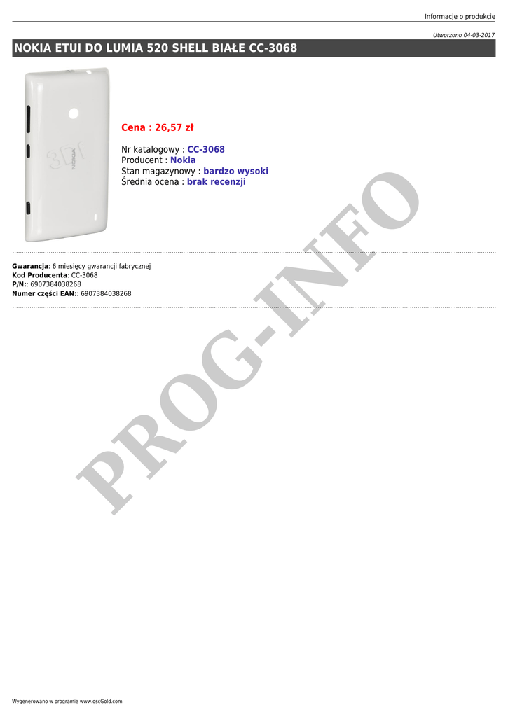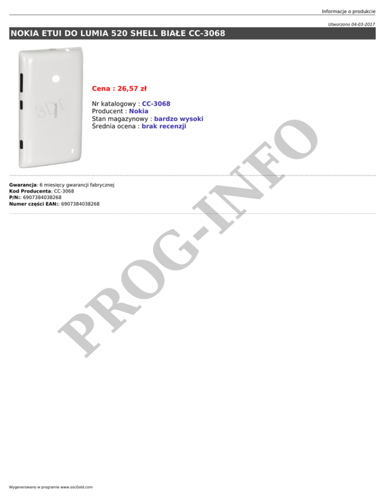 Informacje o produkcie Utworzono 04-03-2017 NOKIA ETUI DO LUMIA 520 SHELL BIAŁE CC-3068 Cena : 26,57 zł PR -I N O G Gwarancja: 6 miesięcy gwarancji fabrycznej Kod Producenta: CC-3068 P/N:: 6907384038268 Numer części EAN:: 6907384038268 FO Nr katalogowy : CC-3068 Producent : Nokia Stan magazynowy : bardzo wysoki Średnia ocena : brak recenzji Wygenerowano w programie www.oscGold.com