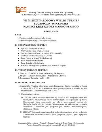Gminny Ośrodek Kultury w Nowej Wsi Lęborskiej ul. Lęborska 20, 84 - 351 Nowa Wieś Lęborska, tel. 059 86 12 253 VII MIĘDZYNARODOWY WIELKI TURNIEJ ŁUCZNICZO - RYCEDRSKI PAMIECI KRZYSZTOFA MARKOWSKIEGO REGULAMIN I. CEL 1. Popularyzacja łucznictwa tradycyjnego. 2. Popularyzacja tradycji i obyczajów rycerskich. II. ORGANIZATORZY TURNIEJU Lęborska Drużyna Łucznicza Wójt Gminy Nowa Wieś Lęborska Gminny Ośrodek Kultury w Nowej Wsi Lęborskiej Centrum Sportu i Rekreacji w Lęborku Rada Gminy w Nowej Wsi Lęborskiej BNA Polska w Obliwicach Rada Sołecka w Obliwicach Fundacja Ekologiczno Sportowa pam. Tomasza Hopfera III. TERMIN I MIEJSCE TURNIEJU 1. Termin - 12.09.2015r. Podczas Biesiady Ekologicznej. 2. Miejsce – Enklawa Historyczno – Przyrodnicza Obliwice 3. Rozpoczęcie Turnieju – godz. 11.00 IV. WARUNKI UCZESTNICTWA Uczestników Turnieju obowiązują stroje historyczne. Stroje swobodnie wybrane z okresu IX - XVII w. dostosowane do używanego przez uczestnika sprzętu i wyposażenia. Zaleca się strój z XIII- XV w. Wymagania sprzętowe: a) ŁUKI-W trakcie turnieju dopuszcza się wszelkie łuki tradycyjne oraz łuki historyczne i rekonstrukcje łuków historycznych. Nie dopuszcza się łuków bloczkowych (typu compound), ani łuków wyczynowych, sportowych. Naciągów łuków się nie limituje. Niedozwolone są jakiekolwiek przyrządy celownicze. Dozwolona jest podpórka pod strzałę: drewniana,rogowa, skórzana, z włosia. b) STRZAŁY-Promienie strzał mogą być wyłącznie drewniane, a lotki wyłącznie z materiałów naturalnych (skóra, pióra, pergamin, papier), groty wyłącznie toczone. Organizator Kultury, Sportu i Turystyki i Rekreacji na terenie Gminy Nowa Wieś Lęborska Punkt Informacji Turystycznej, ul. Lęborska 20, tel. 059 86 12 253 Gminny Ośrodek Kultury w Nowej Wsi Lęborskiej ul. Lęborska 20, 84 - 351 Nowa Wieś Lęborska, tel. 059 86 12 253 Nasady wyłącznie drewniane. Łucznik musi posiadać co najmniej 9 strzał w zależności od konkurencji - w konkurencji "strzelanie na czas" (przewiduje się czas około 40-60 sekund) nieograniczona liczba strzał V. KONKURENCJE Rozegrane będą 2 turnieje: Pierwszy - „Tarczowy” 1. Strzelanie do tarczy o średnicy max. 80 cm 2. Dystans: 15-25 m 3. Punktacja – od 1 do 5 pkt. 4. Nie zalicza się trafień strzałą, która nie wbiła się w tarczę. Drugi - „O Ziemniaka”: Strzelanie o ziemniaka - strzelanie systemem pucharowym VI. NAGRODY Pierwszy - „Tarczowy” Kategoria „Mężczyźni”: I. miejsce – 200 zł, II. miejsce – 150 zł III. Miejsce – 100 zł Kategoria „Kobiety”: I. miejsce – 200 zł, II. miejsce – 150 zł III. Miejsce – 100 zł Drugi turniej – „O Ziemniaka” I miejsce – 3 worki ziemniaków II. miejsce – 2 worki ziemniaków III. Miejsce – 1 worek ziemniaków VII. SPRAWY FINANSOWE Koszty organizacyjne pokrywają organizatorzy. Pozostałe koszty pokrywają zawodnicy i jednostki delegujące. Wypłaty nagród pieniężnych pomniejszone zostaną pomniejszone o zaliczkę z tytułu podatku dochodowego od osób fizycznych. Organizator Kultury, Sportu i Turystyki i Rekreacji na terenie Gminy Nowa Wieś Lęborska Punkt Informacji Turystycznej, ul. Lęborska 20, tel. 059 86 12 253 Gminny Ośrodek Kultury w Nowej Wsi Lęborskiej ul. Lęborska 20, 84 - 351 Nowa Wieś Lęborska, tel. 059 86 12 253 VIII. POSTANOWIENIA KOŃCOWE 1.Organizator zastrzega sobie możliwość wprowadzenia zmian w regulaminie w dniu przeprowadzenia turnieju, przed rozpoczęciem zawodów 2.Uczestnicy biorą udział w turnieju na własne ryzyko i odpowiedzialność 3.Organizator nie ubezpiecza łuczników od wypadków. Uczestnicy turnieju zobowiązani są zachować warunki bezpieczeństwa podczas strzelania i bezwzględnie podporządkować się poleceniom sędziego turnieju. 4.Sprawy sporne i nie uregulowane w niniejszym regulaminie rozstrzyga organizator w porozumieniu z sędzią turnieju. IX. KONTAKT Marzena Goike 601 059 689 Organizator Kultury, Sportu i Turystyki i Rekreacji na terenie Gminy Nowa Wieś Lęborska Punkt Informacji Turystycznej, ul. Lęborska 20, tel. 059 86 12 253