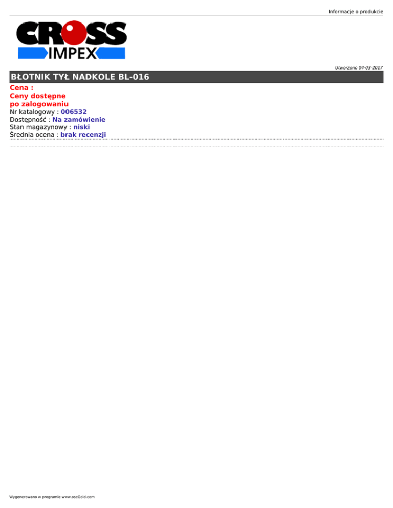 Informacje o produkcie Utworzono 04-03-2017 BŁOTNIK TYŁ NADKOLE BL-016 Cena : Ceny dostępne po zalogowaniu Nr katalogowy : 006532 Dostępność : Na zamówienie Stan magazynowy : niski Średnia ocena : brak recenzji Wygenerowano w programie www.oscGold.com