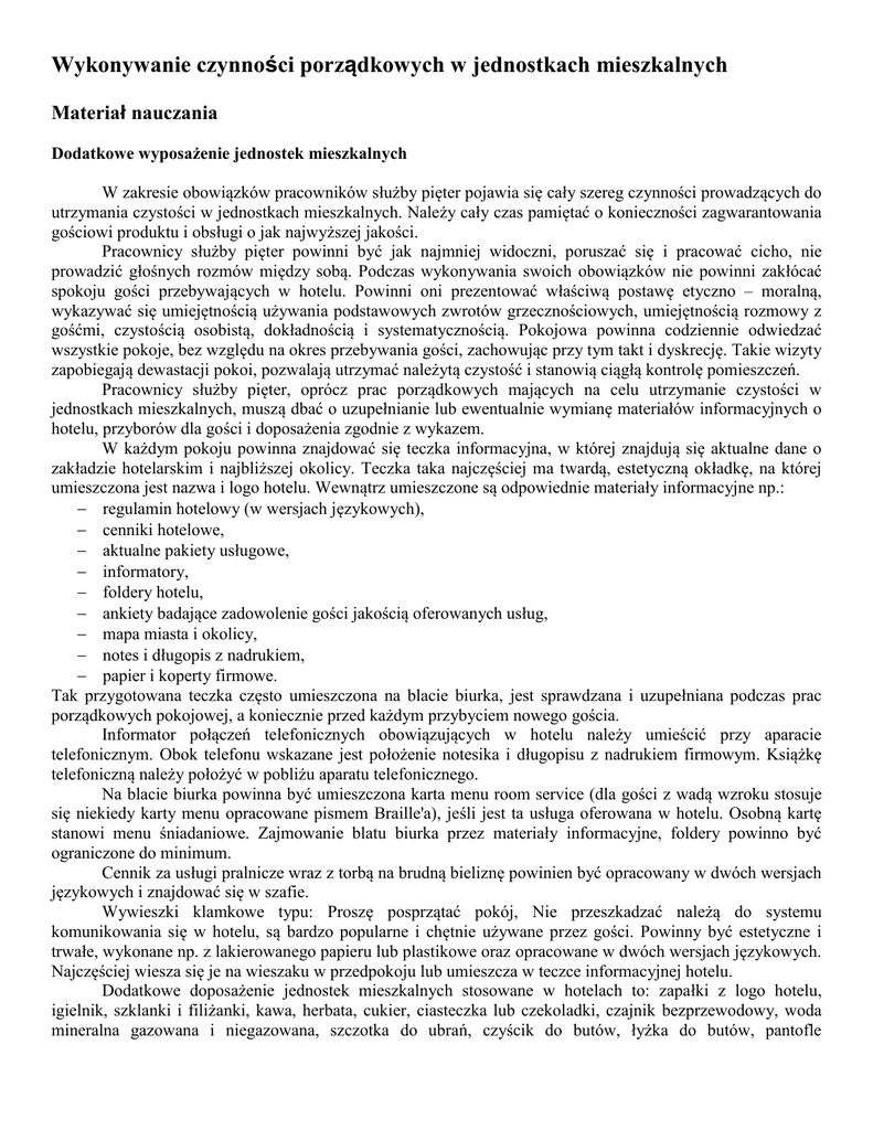 Wykonywanie czynności porządkowych w jednostkach mieszkalnych Materiał nauczania Dodatkowe wyposażenie jednostek mieszkalnych W zakresie obowiązków pracowników służby pięter pojawia się cały szereg czynności prowadzących do utrzymania czystości w jednostkach mieszkalnych. Należy cały czas pamiętać o konieczności zagwarantowania gościowi produktu i obsługi o jak najwyższej jakości. Pracownicy służby pięter powinni być jak najmniej widoczni, poruszać się i pracować cicho, nie prowadzić głośnych rozmów między sobą. Podczas wykonywania swoich obowiązków nie powinni zakłócać spokoju gości przebywających w hotelu. Powinni oni prezentować właściwą postawę etyczno – moralną, wykazywać się umiejętnością używania podstawowych zwrotów grzecznościowych, umiejętnością rozmowy z gośćmi, czystością osobistą, dokładnością i systematycznością. Pokojowa powinna codziennie odwiedzać wszystkie pokoje, bez względu na okres przebywania gości, zachowując przy tym takt i dyskrecję. Takie wizyty zapobiegają dewastacji pokoi, pozwalają utrzymać należytą czystość i stanowią ciągłą kontrolę pomieszczeń. Pracownicy służby pięter, oprócz prac porządkowych mających na celu utrzymanie czystości w jednostkach mieszkalnych, muszą dbać o uzupełnianie lub ewentualnie wymianę materiałów informacyjnych o hotelu, przyborów dla gości i doposażenia zgodnie z wykazem. W każdym pokoju powinna znajdować się teczka informacyjna, w której znajdują się aktualne dane o zakładzie hotelarskim i najbliższej okolicy. Teczka taka najczęściej ma twardą, estetyczną okładkę, na której umieszczona jest nazwa i logo hotelu. Wewnątrz umieszczone są odpowiednie materiały informacyjne np.: regulamin hotelowy (w wersjach językowych), cenniki hotelowe, aktualne pakiety usługowe, informatory, foldery hotelu, ankiety badające zadowolenie gości jakością oferowanych usług, mapa miasta i okolicy, notes i długopis z nadrukiem, papier i koperty firmowe. Tak przygotowana teczka często umieszczona na blacie biurka, jest sprawdzana i uzupełniana podczas prac porządkowych pokojowej, a koniecznie przed każdym przybyciem nowego gościa. Informator połączeń telefonicznych obowiązujących w hotelu należy umieścić przy aparacie telefonicznym. Obok telefonu wskazane jest położenie notesika i długopisu z nadrukiem firmowym. Książkę telefoniczną należy położyć w pobliżu aparatu telefonicznego. Na blacie biurka powinna być umieszczona karta menu room service (dla gości z wadą wzroku stosuje się niekiedy karty menu opracowane pismem Braille'a), jeśli jest ta usługa oferowana w hotelu. Osobną kartę stanowi menu śniadaniowe. Zajmowanie blatu biurka przez materiały informacyjne, foldery powinno być ograniczone do minimum. Cennik za usługi pralnicze wraz z torbą na brudną bieliznę powinien być opracowany w dwóch wersjach językowych i znajdować się w szafie. Wywieszki klamkowe typu: Proszę posprzątać pokój, Nie przeszkadzać należą do systemu komunikowania się w hotelu, są bardzo popularne i chętnie używane przez gości. Powinny być estetyczne i trwałe, wykonane np. z lakierowanego papieru lub plastikowe oraz opracowane w dwóch wersjach językowych. Najczęściej wiesza się je na wieszaku w przedpokoju lub umieszcza w teczce informacyjnej hotelu. Dodatkowe doposażenie jednostek mieszkalnych stosowane w hotelach to: zapałki z logo hotelu, igielnik, szklanki i filiżanki, kawa, herbata, cukier, ciasteczka lub czekoladki, czajnik bezprzewodowy, woda mineralna gazowana i niegazowana, szczotka do ubrań, czyścik do butów, łyżka do butów, pantofle jednorazowe, zestaw galanterii i kosmetyków łazienkowych np.: mydełka toaletowe, szampony, żele pod prysznic, czepki kąpielowe, zestawy do mycia zębów, zestawy do golenia, woreczki na odpadki higieniczne. Wprowadzenie do pokoi hotelowych mini barków ma na celu stworzenie gościowi dodatkowych udogodnień i odczucia zwiększonego komfortu. Najczęstszym sposobem rozliczania jest samodzielne odnotowanie przez gościa produktów, z których korzystał i dostarczenie karty mini baru do recepcji przed wymeldowaniem. Pokojowa sprzątająca pokój, w którym znajduje się mini barek zaopatruje go w odpowiedni asortyment napoi, słodyczy i przekąsek, a także inne artykuły objęte programem wyposażenia. Jeśli pokój jest zajęty przez gości wtedy musi sprawdzić mini bar i jest zobowiązana do powiadomienia recepcji o fakcie korzystania z niego przez gości. Częstość uzupełniania mini barów w pokojach zajmowanych przez gości jest ustalona w wewnętrznych procedurach hotelu. Czynności porządkowe w jednostkach mieszkalnych Postępowanie pokojowej w trakcie wykonywania obowiązków: Drobne upominki i materiały reklamowe należy wykładać na stałe miejsca, zgodnie z otrzymanymi instrukcjami. Najłatwiejszym sposobem wykonywania pracy jest wykonywanie jej dobrze. Każdy element umeblowania należy ustawić dokładnie na wyznaczonym miejscu. Wygląd pokoju zależy od dokładnego rozstawienia wszystkich części umeblowania w pewnej z góry ustalonej harmonii. Należy szczególnie uważać przy takich elementach jak sznury od radia, TV i telefonu oraz przy teczkach z reklamówkami. Dokładność pracy i systematyczne jej wykonywanie przyczyniają się do spokojnego oczekiwania na przybycie osoby kontrolującej jakość wykonywania obowiązków przez pokojową. Odkurzanie pokoju należy rozpocząć od drzwi wejściowych. Odkurzać należy idąc wokół pokoju w kierunku miejsca startu. Postępując w ten sposób można być pewnym, że się nie pominie żadnego przedmiotu. Należy zawsze skontrolować czy materac i ochraniacz materaca nie posiadają plam i czy nie są uszkodzone. Aby spulchnić poduszkę nie należy bić jej rękami, wystarczy lekkie potrząsanie. Zawartość poduszki – pierze lub puch – są bardzo kosztowne, a zbyt