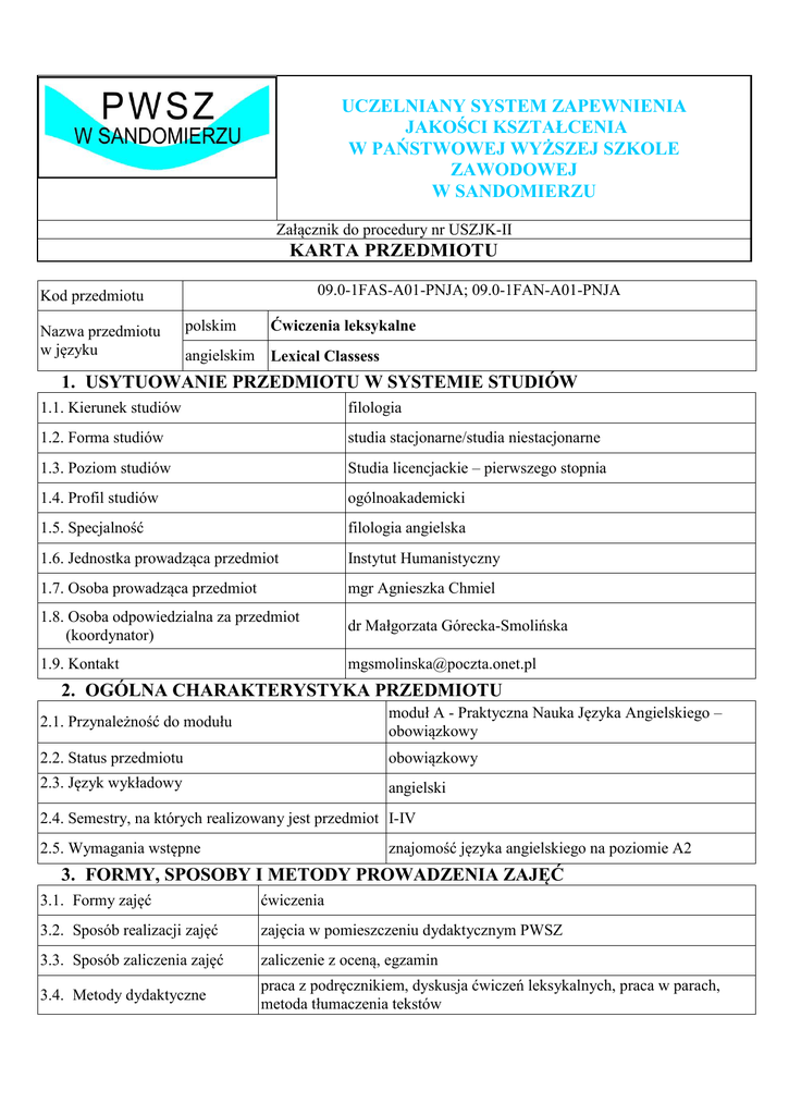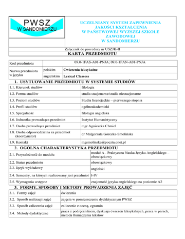 UCZELNIANY SYSTEM ZAPEWNIENIA JAKOŚCI KSZTAŁCENIA W PAŃSTWOWEJ WYŻSZEJ SZKOLE ZAWODOWEJ W SANDOMIERZU Załącznik do procedury nr USZJK-II KARTA PRZEDMIOTU 09.0-1FAS-A01-PNJA; 09.0-1FAN-A01-PNJA Kod przedmiotu Nazwa przedmiotu w języku polskim Ćwiczenia leksykalne angielskim Lexical Classess 1. USYTUOWANIE PRZEDMIOTU W SYSTEMIE STUDIÓW 1.1. Kierunek studiów filologia 1.2. Forma studiów studia stacjonarne/studia niestacjonarne 1.3. Poziom studiów Studia licencjackie – pierwszego stopnia 1.4. Profil studiów ogólnoakademicki 1.5. Specjalność filologia angielska 1.6. Jednostka prowadząca przedmiot Instytut Humanistyczny 1.7. Osoba prowadząca przedmiot mgr Agnieszka Chmiel 1.8. Osoba odpowiedzialna za przedmiot (koordynator) dr Małgorzata Górecka-Smolińska 1.9. Kontakt [email protected] 2. OGÓLNA CHARAKTERYSTYKA PRZEDMIOTU 2.1. Przynależność do modułu moduł A - Praktyczna Nauka Języka Angielskiego – obowiązkowy 2.2. Status przedmiotu obowiązkowy 2.3. Język wykładowy angielski 2.4. Semestry, na których realizowany jest przedmiot I-IV 2.5. Wymagania wstępne znajomość języka angielskiego na poziomie A2 3. FORMY, SPOSOBY I METODY PROWADZENIA ZAJĘĆ 3.1. Formy zajęć ćwiczenia 3.2. Sposób realizacji zajęć zajęcia w pomieszczeniu dydaktycznym PWSZ 3.3. Sposób zaliczenia zajęć zaliczenie z oceną, egzamin 3.4. Metody dydaktyczne praca z podręcznikiem, dyskusja ćwiczeń leksykalnych, praca w parach, metoda tłumaczenia tekstów Wykaz literatury 3.5. Virginia Evans, Jenny Dooley,(2004) "Upstream Pre-Intermediate B1", Express Publishing Virginia Evans, Jenny Dooley (2002), J. "Upstream Intermediate", Express podstawowa Publishing Virginia Evans, Bob Obee (2003), J. "Upstream Upper-Intermediate", Express Publishing Oxford Advanced Learner's Dictionary, OUP Annette Capel, Wendy Sharp "Objective first certificate. Second Edition", CUP Longman Language Activator, Longman 4. CELE, TREŚCI I EFEKTY KSZTAŁCENIA 4.1. Cele przedmiotu Cl – podnieść leksykalną kompetencję studentów do poziomu B2+; C2 – umożliwić studentom ćwiczenie poznanego słownictwa w realistycznych sytuacjach/kontekstach; C3 – wskazać studentom zależność słownictwa od rejestru(formalny/nieformalny/deskryptywny etc) uzupełniająca 4.2. Treści programowe 1. Słownictwo ogólne (teksty) umożliwiające studentom osiągnięcie kompetencji leksykalnej na poziomie B2+. 2. Słownictwo szczegółowe umożliwiające studentom poznanie użycia konkretnych jednostek leksykalnych (przysłowia, czasowniki frazalne, powiedzenia, kolokacje) jak i zrozumienie drobnych różnic między synonimami (ćwiczenia leksykalne). 3. Słownictwo kontekstowe używane w sytuacjach codziennych (kupowanie biletu na autobus, zamawianie posiłku w restauracji, etc). 4. Rozwijanie kompetencji słowotwórczej (świadomości struktury wyrazów i jej użycia w ćwiczeniach leksykalnych). 5. Rozwijanie umiejętności tłumaczenia słów/fraz/zdań zarówno angielsko-polskich jak i polskoangielskich. 4.3. Efekty kształcenia Kod Student, który zaliczył przedmiot w zakresie WIEDZY: Odniesienie do efektów kształcenia dla kierunku dla obszaru W01 zna słownictwo angielskie na poziomie B2+ FILIA_W06 H1A_W04 W02 identyfikuje błędy leksykalne w napotkanych pracach FILIA_W010 H1A_W07 W03 rozróżnia słownictwo użyte w zależności od rejestru FILIA_W09 H1A_W09 w zakresie UMIEJĘTNOŚCI: U01 używa słownictwa angielskiego na poziomie B2+ w mowie i piśmie FILIA_U01 H1A_U10 U02 tłumaczy zdania angielsko-polskie i polsko-angielskie FILIA_U03 H1A_U02 U03 poprawia błędy leksykalne w napotkanych tekstach FILIA_U08 H1A_U05 w zakresie KOMPETENCJI SPOŁECZNYCH: K01 jest świadomy potrzeby ciągłej nauki słownictwa FILIA_K01 H1A_K01 K02 krytycznie ocenia swoją wiedzę FILIA_K02 H1A_K04 K03 4.4. jest wrażliwy na zjawiska językowe takie jak poprawność polityczna, satyra, ironia, eufemizmy, dygresja etc. FILIA_K07 H1A_K04 Metody weryfikacji efektów kształcenia Forma oceny Efekt kształcenia Egzamin Egzamin Projekt Kolokwium Zadania do ustny pisemny wykonania W01 W02 W03 U01 U02 U03 K01 K02 K03 ++ Referat, sprawozdanie ++ ++ ++++ ++++ ++++++ ++++++ ++++ ++++ ++++ ++ ++ 4.5. Efekt kształcenia W01-W03 U01-U03 K01-K03 Inne ++++++++ ++++ ++ Dyskusja ++++ ++++++ ++ ++ ++ Kryteria jakościowe uzyskania oceny w danym zakresie efektów kształcenia ocena dostateczny/dostateczny dobry/ dobry plus bardzo dobry plus (4/ 4,5) (5) (3/ 3,5) a) zna wybrane a) zna większość słownictwa a) zna całość słownictwa słownictwo wprowadzone wprowadzonego podczas wprowadzonego podczas zajęć; podczas zajęć; zajęć; b) identyfikuje wszystkie błędy b) identyfikuje b) identyfikuje większość w napotkanych w tekstach; elementarne błędy błędów w napotkanych c) rozróżnia wszystkie przypadki napotkane w tekstach; tekstach; użycia słownictwa c) rozróżnia tylko c) rozróżnia większość uwarunkowanego rejestrem najprostsze przypadki przypadków użycia użycia słownictwa słownictwa uwarunkowanego uwarunkowanego rejestrem rejestrem a) używa słownictwa na a) używa słownictwa a) używa słownictwa poziomie B2+ w stopniu na poziomie B2+ w stopniu na poziomie B2+ w stopniu słabym; słabym bardzo dobrym b) tłumaczy tylko niektóre b) tłumaczy tylko niektóre b) tłumaczy wszystkie zdania zdania polsko-angielskie zdania polsko-angielskie polsko-angielskie i większość i większość zdań i większość zdań angielskozdań angielsko-polskich; angielsko-polskich; polskich; c) poprawa wszystkie błędy c) poprawia tylko c) poprawia tylko w napotkanych tekstach elementarne błędy elementarne błędy w napotkanych tekstach w napotkanych tekstach a) rozumie potrzebę a) rozumie potrzebę ciągłej a) rozumie potrzebę ciągłej ciągłej aktualizacji swojej aktualizacji swojej wiedzy aktualizacji swojej wiedzy wiedzy leksykalnej, ale nie leksykalnej i rozumie skutki leksykalnej, rozumie skutki rozumie skutków 