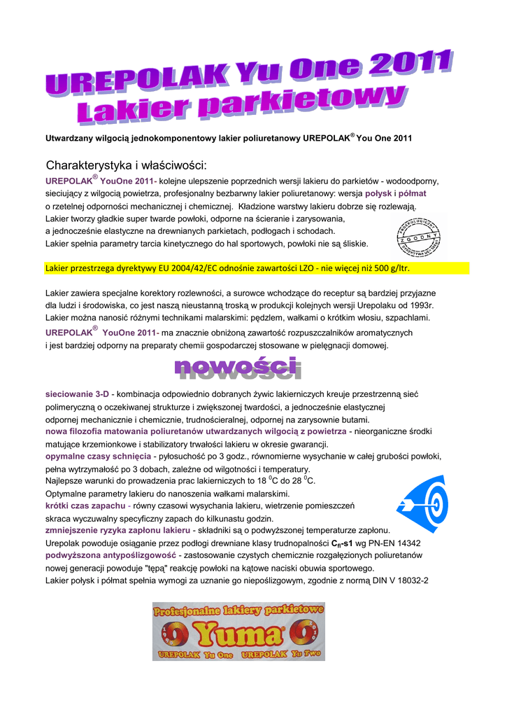 Utwardzany wilgocią jednokomponentowy lakier poliuretanowy UREPOLAK ® You One 2011 Charakterystyka i właściwości: ® UREPOLAK YouOne 2011- kolejne ulepszenie poprzednich wersji lakieru do parkietów - wodoodporny, sieciujący z wilgocią powietrza, profesjonalny bezbarwny lakier poliuretanowy: wersja połysk i półmat o rzetelnej odporności mechanicznej i chemicznej. Kładzione warstwy lakieru dobrze się rozlewają. Lakier tworzy gładkie super twarde powłoki, odporne na ścieranie i zarysowania, a jednocześnie elastyczne na drewnianych parkietach, podłogach i schodach. Lakier spełnia parametry tarcia kinetycznego do hal sportowych, powłoki nie są śliskie. Lakier przestrzega dyrektywy EU 2004/42/EC odnośnie zawartości LZO - nie więcej niż 500 g/ltr. Lakier zawiera specjalne korektory rozlewności, a surowce wchodzące do receptur są bardziej przyjazne dla ludzi i środowiska, co jest naszą nieustanną troską w produkcji kolejnych wersji Urepolaku od 1993r. Lakier można nanosić różnymi technikami malarskimi: pędzlem, wałkami o krótkim włosiu, szpachlami. UREPOLAK ® YouOne 2011- ma znacznie obniżoną zawartość rozpuszczalników aromatycznych i jest bardziej odporny na preparaty chemii gospodarczej stosowane w pielęgnacji domowej. sieciowanie 3-D - kombinacja odpowiednio dobranych żywic lakierniczych kreuje przestrzenną sieć polimeryczną o oczekiwanej strukturze i zwiększonej twardości, a jednocześnie elastycznej odpornej mechanicznie i chemicznie, trudnościeralnej, odpornej na zarysownie butami. nowa filozofia matowania poliuretanów utwardzanych wilgocią z powietrza - nieorganiczne środki matujące krzemionkowe i stabilizatory trwałości lakieru w okresie gwarancji. opymalne czasy schnięcia - pyłosuchość po 3 godz., równomierne wysychanie w całej grubości powłoki, pełna wytrzymałość po 3 dobach, zależne od wilgotności i temperatury. Najlepsze warunki do prowadzenia prac lakierniczych to 18 0C do 28 0C. Optymalne parametry lakieru do nanoszenia wałkami malarskimi. krótki czas zapachu - równy czasowi wysychania lakieru, wietrzenie pomieszczeń skraca wyczuwalny specyficzny zapach do kilkunastu godzin. zmniejszenie ryzyka zapłonu lakieru - składniki są o podwyższonej temperaturze zapłonu. Urepolak powoduje osiąganie przez podłogi drewniane klasy trudnopalności Cfl-s1 wg PN-EN 14342 podwyższona antypoślizgowość - zastosowanie czystych chemicznie rozgałęzionych poliuretanów nowej generacji powoduje "tępą" reakcję powłoki na kątowe naciski obuwia sportowego. Lakier połysk i półmat spełnia wymogi za uznanie go niepoślizgowym, zgodnie z normą DIN V 18032-2 Własności Lepkość Ford nr 4 minimum 50s Sucha masa wagowo minimum Gęstość w 20 0C minimum 1,00 g/cm3 Pyłosuchość maximum Połysk Gardner 600 min. 90 Pełna odporność powłoki 0 Półmat Gardner 60 ok. 30 Temperatura zapłonu Kinetyczny współczynnik tarcia w stanie suchym (statycznie) µ nie mniej niż Klasa odporności ogniowej zgodnie z normą PN-EN 14342 50 % 3h 72 h 23 0C 0,4 Cfl-s1 Przeznaczenie i sposoby stosowania: ® UREPOLAK Yu One polecany jest do lakierowania drewnianych parkietów, podłóg, schodów, mozaiki, stolarki w domach, mieszkaniach, biurach, obiektach służby zdrowia, opiekuńczo-wychowawczych, oświatowych, w halach sportowo-widowiskowych, w salach tanecznych, muzeach, itp. ® UREPOLAK Yu One zapewnia ochronę w pomieszczeniach o dużym obciążeniu eksploatacyjnym. ® Jako podkład rekomendujemy nasz Urepolak Primer - uniwersalny lakier podkładowy na drewno krajowe i zawierające oleje roślinne, drewno egzotyczne. Podkład schnie kilkanaście minut. ® UREPOLAK Yu One 2011 polecamy pod wodorozcieńczalne lakiery poliuretanowe różnych firm, ale zawsze po teście znoszenia się. Lakier sprawdza się w rozlicznych kombinacjach. ® Nasz wodorozcieńczalny UREPOLAK W polecamy szczególnie jako pielęgnację odświeżającą powłoki. Lakier Yu One 2011 nadaje się do lakierowań renowacyjnych różnych starych powłok lakierowych. ® W razie uzupełniania ubytków w drewnie stosować nasz Urepolak Szpachla z pyłem drzewnym. Lakier zalecamy nanosić wałkami o krótkim włosiu, pędzlami lub parkieciarskimi szpachlami stalowymi, bez potrzeby rozcieńczania. Do natrysku pneumatycznego zalecamy nasz rozcieńczalnik Urepoxyl. Powierzchnia przed lakierowaniem musi być czysta, przeszlifowana, wolna od tłuszczu, silikonów i brudu, ® a następnie zagruntowana naszym podkładem Urepolak Primer lub rozcieńczonym lakierem Yu One, ale wówczas najpierw trzeba wykonać test na wystąpienie akceptowalnych przebarwień drewna. Efekt ewentualnych przebarwień będzie widoczny po kilkunastu minutach. Lakier nanosić cienkimi warstwami do uwolnienia z powłok pęcherzyków powietrza i CO2. Najlepsze rezultaty daje naniesienie na parkiety trzech warstw lakieru w odstępach 8-12 godzin. Na boazerie wystarczą dwie warstwy. Szlif międzywarstwowy wykonywać papierem ściernym 240-320 i starannie usuwać powstały pył, końcowo najlepiej wilgotną nie elektryzującą się szmatą. Powłoka lakierowa uzyskuje pełne własności odpornościowe i użytkowe po 3 dniach. Do mycia narzędzi malarskich i usuwania zabrudzeń używać nasz rozcieńczalnik Akasol Thinner. Uwaga: Zaniechanie wietrzenia pomieszczeń przy lakierowaniu lub niedostateczne wietrzenie do 2-3 dni po lakierowaniu, może spowodować przebarwienia na powierzchniach pokrytych powłokami emulsyjnymi (dyspersyjnymi), zwłaszcza świeżymi. Zalecenia bhp i p.poż. Przechowywać w szczelnie zamkniętych opakowaniach, w suchym miejscu z dala od źródeł ognia i ciepła. Wyrób zawiera szkodliwe substancje lotne - stosować w pomieszczeniach o sprawnej wentylacji lub przewietrzanych. Chronić przed dziećmi, jak każdy wyrób lakierowy z rozpuszczalnikami. Wyrób wrażliwy na wilgoć z powietrza i wodę. Po otworzeniu najlepiej zużyć całe opakowanie, gdyż dostęp wilgotnego 