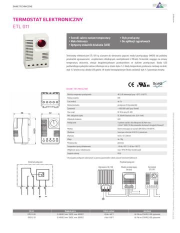 1 ANE TECHNICZNE UNTERNEHMEN DANE D www.stego.pl PRODUKTKATALOG - STEGO TERMOSTAT ELEKTRONICZNY ETL 011 >>Szeroki zakres nastaw temperatury >>Mała histereza >>Optyczny wskaźnik działania (LED) >>Styk przełączny >>Do aplikacji sygnałowych Termostaty elektroniczne ETL 011 są używane do sterowania poprzez moduł przełączający SM010 lub podobny przekaźnik ogrzewaczami, urządzeniami chłodzącymi, wentylatorami z filtrami. Termostat, reagując na zmiany temperatury otoczenia, steruje bezpotencjałowym przekaźnikiem ze stykiem przełącznym. Dioda LED podświetlająca pokrętło nastaw informuje nas o stanie styku 1-2. Kiedy temperatura przekracza nastawę na skali, styk 1-2 otwiera się a dioda LED gaśnie. W stanie beznapięciowym (brak zasilania) styk 1-2 pozostaje otwarty. 1 Różnica temperatur przełączania 4K (±1K tolerancja) przy +20°C (+68°F) Rodzaj czujnika NTC Czas reakcji ok. 5s Rodzaj kontaktu przełączny CO (przekaźnik) Żywotność > 100 000 cykli (przy 10mW) Max. prąd DC 0,5A przy DC 48V Min. obciążenie styku DC 10mW (wartości min. 0,1V i 1mA) Wskaźnik działania LED Podłączenie 5-polowe zaciski, siła dokręcania 0,5Nm max.: 2,5mm² (AWG 14) dla przewodów drutowych okrągłych/licowych1 Montaż klamra mocująca na szynach DIN 35mm, EN 60715 Obudowa tworzywo sztuczne UL94 V-0, jasnoszare Wymiary 64,5 x 42 x 38mm Waga ok. 70g Pozycja pracy pionowa Temperatura pracy/składowania -40 do +85°C (-40 do +185°F) Wilgotność pracy i składowania max. 95% RH (bez kondensacji) Stopień ochrony IP20 W przypadu podłączeń wykonanych za pomocą przewodów należy używać końcówek kablowych. Przykład połączeń Schemat połączeń Ogrzewacz HG 140 Moduł przełączający SM 010 Termostat ETL 011 Art. Nr art. No. Operating Napięcie voltage pracy Zakres Settingnastaw range Aprobacje Approvals 01131.2-00 12-48VDC (min. 10VDC, max. 60VDC) -20 do to +60°C UL File CSA-US; no. E164102, VDE + ULVDE intended zgłoszenie 01131.2-01 12-48VDC (min. 10VDC, max. 60VDC) -4 do to +140°F UL File CSA-US; no. E164102, VDE + ULVDE intended zgłoszenie 28.07.2014 | Zmiany techniczne zastrzeżone. Wszystkie parametry mogą podlegać zmianie. Poniższe informacje nie zwalniają nabywcy od samodzielnej kontroli instalacji. DANE TECHNICZNE