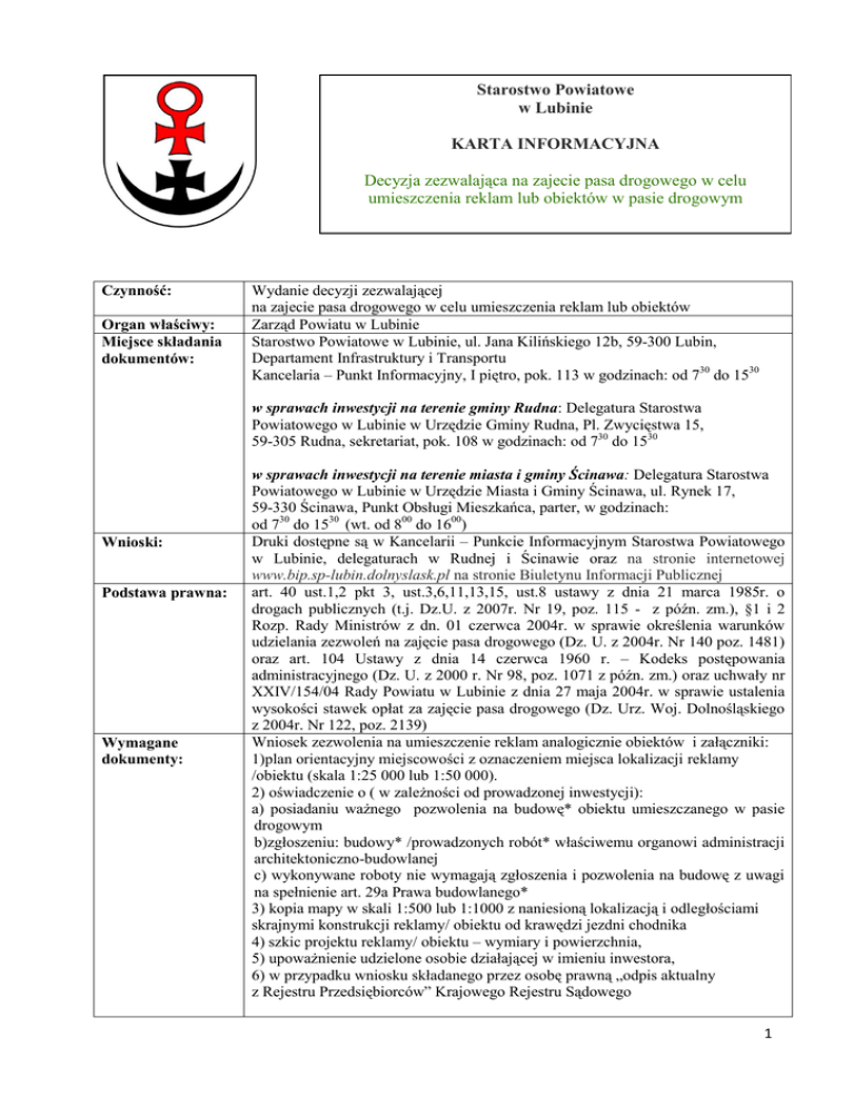 Starostwo Powiatowe w Lubinie KARTA INFORMACYJNA Decyzja zezwalająca na zajecie pasa drogowego w celu umieszczenia reklam lub obiektów w pasie drogowym Czynność: Organ właściwy: Miejsce składania dokumentów: Wydanie decyzji zezwalającej na zajecie pasa drogowego w celu umieszczenia reklam lub obiektów Zarząd Powiatu w Lubinie Starostwo Powiatowe w Lubinie, ul. Jana Kilińskiego 12b, 59-300 Lubin, Departament Infrastruktury i Transportu Kancelaria – Punkt Informacyjny, I piętro, pok. 113 w godzinach: od 730 do 1530 w sprawach inwestycji na terenie gminy Rudna: Delegatura Starostwa Powiatowego w Lubinie w Urzędzie Gminy Rudna, Pl. Zwycięstwa 15, 59-305 Rudna, sekretariat, pok. 108 w godzinach: od 730 do 1530 w sprawach inwestycji na terenie miasta i gminy Ścinawa: Delegatura Starostwa Powiatowego w Lubinie w Urzędzie Miasta i Gminy Ścinawa, ul. Rynek 17, 59-330 Ścinawa, Punkt Obsługi Mieszkańca, parter, w godzinach: od 730 do 1530 (wt. od 800 do 1600) Druki dostępne są w Kancelarii – Punkcie Informacyjnym Starostwa Powiatowego Wnioski: w Lubinie, delegaturach w Rudnej i Ścinawie oraz na stronie internetowej www.bip.sp-lubin.dolnyslask.pl na stronie Biuletynu Informacji Publicznej art. 40 ust.1,2 pkt 3, ust.3,6,11,13,15, ust.8 ustawy z dnia 21 marca 1985r. o Podstawa prawna: drogach publicznych (t.j. Dz.U. z 2007r. Nr 19, poz. 115 - z późn. zm.), §1 i 2 Rozp. Rady Ministrów z dn. 01 czerwca 2004r. w sprawie określenia warunków udzielania zezwoleń na zajęcie pasa drogowego (Dz. U. z 2004r. Nr 140 poz. 1481) oraz art. 104 Ustawy z dnia 14 czerwca 1960 r. – Kodeks postępowania administracyjnego (Dz. U. z 2000 r. Nr 98, poz. 1071 z późn. zm.) oraz uchwały nr XXIV/154/04 Rady Powiatu w Lubinie z dnia 27 maja 2004r. w sprawie ustalenia wysokości stawek opłat za zajęcie pasa drogowego (Dz. Urz. Woj. Dolnośląskiego z 2004r. Nr 122, poz. 2139) Wniosek zezwolenia na umieszczenie reklam analogicznie obiektów i załączniki: Wymagane 1)plan orientacyjny miejscowości z oznaczeniem miejsca lokalizacji reklamy dokumenty: /obiektu (skala 1:25 000 lub 1:50 000). 2) oświadczenie o ( w zależności od prowadzonej inwestycji): a) posiadaniu ważnego pozwolenia na budowę* obiektu umieszczanego w pasie drogowym b)zgłoszeniu: budowy* /prowadzonych robót* właściwemu organowi administracji architektoniczno-budowlanej c) wykonywane roboty nie wymagają zgłoszenia i pozwolenia na budowę z uwagi na spełnienie art. 29a Prawa budowlanego* 1. 3) kopia mapy w skali 1:500 lub 1:1000 z naniesioną lokalizacją i odległościami skrajnymi konstrukcji reklamy/ obiektu od krawędzi jezdni chodnika 2. 4) szkic projektu reklamy/ obiektu – wymiary i powierzchnia, 5) upoważnienie udzielone osobie działającej w imieniu inwestora, 6) w przypadku wniosku składanego przez osobę prawną „odpis aktualny z Rejestru Przedsiębiorców” Krajowego Rejestru Sądowego 1 Opłaty skarbowe: Opłaty skarbowe określa ustawa z dnia 16 listopada 2006 r. o opłacie skarbowej (Dz. U. z 2006 r. Nr 225, poz. 1635 z późniejszymi zmianami). Dokumentowanie zapłaty opłaty skarbowej oraz tryb jej zwrotu reguluje Rozporządzenie Ministra Finansów z dnia 21 grudnia 2006 r. (Dz. U. z 2006 r. Nr 246, poz. 1804) Nie podlega opłacie skarbowej: Dokonanie czynności urzędowej, wydanie zaświadczenia oraz zezwolenia w sprawach: - budownictwa mieszkaniowego, - nauki, szkolnictwa i oświaty pozaszkolnej oraz ochrony zdrowia Zwalnia się od opłaty skarbowej: - jednostki budżetowe, - jednostki samorządu terytorialnego, - organizacje pożytku publicznego, jeżeli dokonują zgłoszenia lub składają wniosek o dokonanie czynności urzędowej albo wniosek o wydanie zaświadczenia lub zezwolenia – wyłącznie w związku z nieodpłatną działalnością pożytku publicznego w rozumieniu przepisów o działalności pożytku publicznego i wolontariacie - wydanie zezwolenia na zajęcie pasa drogowego na cele niezwiązane z budową, przebudową, remontem, utrzymaniem i ochroną dróg - wydanie pozwolenia na lokalizowanie w pasie drogowym obiektów budowlanych lub urządzeń niezwiązanych z potrzebami zarządzania drogami lub potrzebami ruchu drogowego - wydanie zezwolenia na przejazd pojazdu nienormatywnego PEŁNOMOCNICTWO Wnioskodawca może działać przez pełnomocnika, którym może być wyłącznie osoba fizyczna. Pełnomocnictwo powinno być udzielone na piśmie. Do każdego wniosku składanego przez pełnomocnika należy dołączyć oryginał pełnomocnictwa lub urzędowo poświadczony odpis pełnomocnictwa, niezależnie od tego czy wcześniej były rozpatrywane w Departamencie sprawy inwestora działającego przez tego samego pełnomocnika. Pełnomocnictwo powinno zawierać dane personalne osoby upoważnianej umożliwiające jej identyfikację i być podpisane przez: wnioskodawcę - gdy inwestorem jest osoba fizyczna, osobę (osoby) uprawnione do reprezentowania wnioskodawcy. Zwolnione z opłaty skarbowej są pełnomocnictwa udzielone przez: - jednostki budżetowe, - jednostki samorządu terytorialnego, - organizacje pożytku publicznego, - oraz pełnomocnictwa w sprawach nauki, szkolnictwa i oświaty pozaszkolnej oraz ochrony zdrowia. Obowiązek zapłaty opłaty skarbowej powstaje: od wydania zaświadczenia – z chwilą złożenia wniosku o wydanie zaświadczenia od wydania pozwolenia – z chwilą złożenia wniosku o wydanie pozwolenia od złożenia dokumentu stwierdzającego udzielenie pełnomocnictwa oraz jego odpisu, wypisu lub kopii - z chwilą złożenia dokumentu w organie administracji publicznej Dowód zapłaty należnej opłaty skarbowej należy dołączyć do wniosku i do składanego dokumentu stwierdzającego udzielenie pełnomocnictwa. Opłata skarbowa od pełnomocnictwa wynosi - 17 zł Potwierdzenie zgodności kopii pełnomocnictwa z oryginałem – 5zł w przypadku pozostawiania w dokumentach sprawy kopii pełnomocnictwa 2 Opłaty skarbowej dokonuje się w KASIE - pok. 103, I