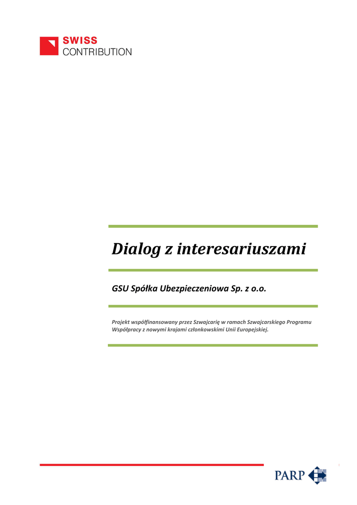 Dialog z interesariuszami GSU Spółka Ubezpieczeniowa Sp. z o.o. Projekt współfinansowany przez Szwajcarię w ramach Szwajcarskiego Programu Współpracy z nowymi krajami członkowskimi Unii Europejskiej. SPIS TREŚCI Słowo wstępu ..................................................................................................................................................... 3 Dialog z interesariuszami ................................................................................................................................... 4 Dobre praktyki dialogu z interesariuszami......................................................................................................... 4 Międzynarodowe standardy z serii AA1000 ....................................................................................................... 8 Etapy dialogu z interesariuszami na podstawie standardu AA1000SES ............................................................ 9 Ustalenie celu zaangażowania .................................................................................................................... 10 Ustalenie zakresu zaangażowania w zależności od celu ............................................................................. 11 Określenie inicjatora, realizatora i angażowanych interesariuszy .............................................................. 11 Stworzenie klasyfikacji i profili interesariuszy ............................................................................................. 12 Ustalenie stopnia i metody zaangażowania ............................................................................................... 12 Ustalenie granic jawności ........................................................................................................................... 12 Stworzenie planu zaangażowania ............................................................................................................... 13 Ustalenie wskaźników ................................................................................................................................. 13 Zgromadzenie zasobów............................................................................................................................... 13 Podniesienie poziomu gotowości interesariuszy ......................................................................................... 14 Rozpoznanie i przygotowanie na ryzyka związane z zaangażowaniem ...................................................... 14 Zaproszenie interesariuszy do zaangażowania ........................................................................................... 15 Szkolenie interesariuszy .............................................................................................................................. 15 Zaangażowanie ........................................................................................................................................... 15 Udokumentowanie zaangażowania i jego efektów .................................................................................... 16 Stworzenie planu działań ............................................................................................................................ 17 Przedstawienie efektów zaangażowania i planu działań ............................................................................ 17 Monitorowanie i ocena zaangażowania ..................................................................................................... 17 Wnioski i ulepszenia .................................................................................................................................... 18 Podsumowanie planu działań ..................................................................................................................... 18 Sprawozdanie z zaangażowania ................................................................................................................. 18 Słowo wstępu Dokument dialogu z interesariuszami stanowi instrukcję dla firmy GSU Spółka Ubezpieczeniowa Sp. z o.o. w jaki sposób przeprowadzić sesję dialogu społecznego z interesariuszami. Dokument został przygotowany przez firmę ARKET Maja DługołęckaSarlej zgodnie z umową zawartą dnia 17 grudnia 2014 r. w oparciu o analizę przeprowadzonych badania: - badania kwestionariuszowe wśród pracowników, - zogniskowane wywiady grupowe, - sesja z wybranymi interesariuszami. Wnioski z analizy posłużyły jako postulaty niniejszego dokumentu i są zgodne ze standardem AA1000 Zaangażowanie interesariuszy oraz odwołuje się do normy IS026000. Dialog z interesariuszami Interesariusze (ang. stakeholders) to grupy lub jednostki, na które firma bezpośrednio lub pośrednio oddziałuje i które oddziałują na nią. Przykładowi interesariusze firmy to jej pracownicy, dostawcy, klienci, społeczność lokalna, media, administracja publiczna czy organizacje pozarządowe.1 Dialog z interesariuszami jest jednym z podstawowych warunków właściwego planowania i realizowania działań z zakresu CSR, determinuje ich skuteczność i osiąganie zakładanych celów oraz rezultatów. Komunikacja z interesariuszami wewnętrznymi i zewnętrznymi odgrywa kluczową rolę w procesie budowania kapitału społecznego oraz w prowadzeniu biznesu w sposób odpowiedzialny.2 Dobre praktyki dialogu z interesariuszami Odpowiednie zarządzanie interesariuszami poprzez dialog pomaga w zidentyfikowaniu potrzeb i oczekiwań interesariuszy, a dzięki temu przekłada się na działania, które zadowalają zarówno organizację, jak i jej kluczowych interesariuszy. Raport przeprowadzony w 2011 roku przez Polską Konfederację Pracodawców Prywatnych Lewiatan i Deloitte pozwolił wskazać kluczowe korzyści, które daje ta forma zaangażowania. Poniższa tabela prezentuje tylko 1 Więcej informacji na temat interesariuszy na stronie interesariusze.pl 2 Dialog z 