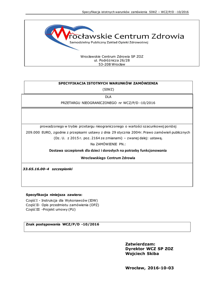 Specyfikacja istotnych warunków zamówienia SIWZ – WCZ/P/D -10/2016 Wrocławskie Centrum Zdrowia SP ZOZ ul. Podróżnicza 26/28 53-208 Wrocław SPECYFIKACJA ISTOTNYCH WARUNKÓW ZAMÓWIENIA (SIWZ) DLA PRZETARGU NIEOGRANICZONEGO nr WCZ/P/D -10/2016 prowadzonego w trybie przetargu nieograniczonego o wartości szacunkowej poniżej 209.000 EURO, zgodnie z przepisami ustawy z dnia 29 stycznia 2004r. Prawo zamówień publicznych (Dz. U. z 2015 r. poz. 2164 ze zmianami) – zwanej dalej: ustawą. Na ZAMÓWIENIE PN.: Dostawa szczepionek dla dzieci i dorosłych na potrzeby funkcjonowania Wrocławskiego Centrum Zdrowia 33.65.16.00-4 szczepionki Specyfikacja niniejsza zawiera: Część I - Instrukcja dla Wykonawców (IDW) Część II- Opis przedmiotu zamówienia (OPZ) Część III -Projekt umowy (PU) Znak postępowania WCZ/P/D -10/2016 Zatwierdzam: Dyrektor WCZ SP ZOZ Wojciech Skiba Wrocław, 2016-10-03 Specyfikacja istotnych warunków zamówienia SIWZ – WCZ/P/D -10/2016 (załącznik A do SIWZ) SIWZ Część II Opis przedmiotu zamówienia (OPZ) 2 Specyfikacja istotnych warunków zamówienia SIWZ – WCZ/P/D -10/2016 1. Nazwa (firma) oraz adres Zamawiającego Wrocławskie Centrum Zdrowia SP ZOZ ul. Podróżnicza 26/28 53-208 Wrocław NIP: 894 24 60 800; REGON: 000313331 tel: 71 39 11 748 Faks: 71 39 11 759, adres strony internetowej: www.spzoz.wroc.pl Godziny urzędowania pn-pt. 7:30-15:00 2. OPIS PRZEDMIOTU ZAMÓWIENIA 1. Przedmiotem zamówienia jest dostawa szczepionek dla dzieci i dorosłych na potrzeby funkcjonowania Wrocławskiego Centrum Zdrowia 2. Wykonawca będzie dostarczał szczepionki w warunkach zalecanych przez producenta dla danego produktu do następujących miejsc tj.: l.p 1 2 3 4 nazwa przychodni Przychodnia "GRABISZYN” Przychodnia „KOZANÓW” Przychodnia „STARE MIASTO” Przychodnia „STABŁOWICE” adres ul. Stalowa 50, Wrocław ul. Dokerska 9, Wrocław Pl. Dominikański 6, Wrocław ul. Stabłowicka 125, Wrocław 5 Dział Farmacji ul. Wszystkich Świętych 2, Wrocław 3. Zamawiający wymaga, by oferowane leki posiadały aktualne wymagane prawem zezwolenia dopuszczające do obrotu i używania na terytorium Rzeczpospolitej Polskiej, zgodnie z wymaganiami określonymi w Ustawie z dnia 6 września 2001 Prawo farmaceutyczne (dz. U. tj. z 2008 nr 45 poz. 271 ze zm.) 4. Gwarancja: Dostarczane szczepionki muszą posiadać min. 12 miesięczny terminem ważności, liczony od dnia odbioru szczepionki przez Zamawiającego. 5. Specyfikacja techniczna przedmiotu zamówienia Nr pakietu Nazwa asortymentu towaru: 1. Szczepionka inaktywnowana przeciw wirusowemu zapaleniu wątroby typu A dla dorosłych 2. Preparat zawierający nie mniej niż 5 j.m. toksoid błoniczy i nie mniej niż 40 j.m.toksoid tężcowy dla młodzieży i dorosłych, objętość 0,5 ml w ampułce Preparat zawierający toksoid błoniczy, szczepionkę bezkomórkową przeciw krzuśćowi i toksoid tężcowy dla dzieci od 4 r. ż. i dorosłych, objętość 0,5 ml w ampułkostrzykawce Preparat zawierający toksoid błoniczy, szczepionkę bezkomórkową przeciw krzuśćowi, szczepionkę inaktywowaną przeciw poliomyelitis i toksoid tężcowy dla dzieci od 4 r. ż. i dorosłych, objętość 0,5 ml w ampułkostrzykawce Preparat zawierający toksoid błoniczy, toksoid tężcowy i szczepionkę przeciw poliomyelitis 3. 4. 5. ilość 85 45 60 60 20 3 Specyfikacja istotnych warunków zamówienia SIWZ – WCZ/P/D -10/2016 6. 7. 8. 9. Szczepionka przeciw przenoszonemu przez kleszcze zapaleniu mózgu zawierająca całego wirusa dla osób od 16 r. ż., objętość 0,5 ml w ampułkostrzykawce Preparat zawierający toksoid błoniczy, szczepionkę przeciw H. influenzae typu B, szczepionkę bezkomórkową przeciw krztuśćowi, szczepionkę inaktywowaną przeciw poliomyelitis i toksoid tężcowy dla dzieci od 2 m. ż. Preparat zawierający toksoid błoniczy, szczepionkę przeciw H. influenzae typu B, szczepionkę rekombinowaną przeciw wirusowemu zapaleniu wątroby typu B, szczepionkę bezkomórkową przeciw krztuścowi (3 komponenty), szczepionkę inaktywowaną przeciw poliomyelitis i toksoid tężcowy, 1 fiolka z proszkiem + 1 ampułkostrzykawka objętości 0,5 ml z zawartością + 2 igły Preparat zawierający toksoid błoniczy, szczepionkę przeciw H. influ-enzae typu B, szczepionkę rekombinowaną przeciw wirusowemu za-paleniu wątroby typu B, szczepionkę bezkomórkową przeciw krztu-ścowi (2 komponenty), szczepionkę inaktywowaną przeciw poliomyelitis i toksoid tężcowy 40 400 200 250 10. Szczepionka przeciw meningokokom czterowalentna (A+C+W135+Y) dla osób od 11 r. ż., zawierająca 1 fiolkę z proszkiem i 1 ampułkostrzykawkę z roztworem 7 11. Szczepionka przeciw meningokokom czterowalentna (A+C+W135+Y) dla dzieci od 12 m. ż., zawierająca 1 fiolkę z proszkiem i 1 ampułkostrzykawkę z roztworem 25 12. Szczepionka przeciw meningokokom gr. A i C dla dzieci od 2 r. ż. i dorosłych 7 13. Szczepionka polisacharydowa, przeciw pneumokokom dla dzieci od 2 r. ż. i osób dorosłych, objętości 0,5 ml w ampułkoskrzykawce 10 14. Szczepionka przeciw pneumokokom, polisacharydowa, skoniugowana (adsorbowana), 13-walentna dla niemowląt, dzieci i młodzieży od 6 t. ż. oraz dorosłych, objętość 0,5 ml w ampułkoskrzykawce 15. Szczepionka żywa, atenuowana przeciw żółtej gorączce 16. 17. 18. 19. 20. 21. 22. 300 35 Szczepionka przeciw meningokokom gr. B Szczepionka skoniugowana przeciw meningokokom gr. C dla dzieci od 2 miesiąca życia, objętość 0,5 ml w ampułko-strzykawce 15 Szczepionka inaktywnowana przeciw poliomyelitis, objętość 0,5 ml w ampułkostrzykawce 7 Szczepionka rekombinowana przeciw wirusowemu zapaleniu wątroby typu B Szczepionka polisacharydowa przeciw durowi brzusznemu dla dzieci od 2 r. ż. i dorosłych, objętość 0,5 ml w ampułkostrzykawce Szczepionka inaktywowana przeciw wirusowemu zapaleniu wątroby typu A połączona z szczepionką rekombinowaną przeciw wirusowemu zapaleniu wątroby typu B dla mło