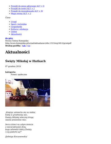 Przejdź do menu głównego ALT + 0 Przejdź do treści ALT + 1 Przejdź do wyszukiwarki ALT + W Mapa strony ALT + 2 Close Urząd Sport i turystyka Gospodarka Kultura i edukacja Gmina Aktualności do góry Strona Gminy Konopiska http://www.konopiska.pl/urzad/aktualnosci/idn:1313/stg140:2/printpdf Drukuj grafikę : tak / nie Aktualności Święty Mikołaj w Hutkach 07 grudnia 2016 kategoria: Pomoc społeczna „Księżyc uśmiecha się na niebie, kiedy w grudniową noc, Święty Mikołaj mleczną drogą wiezie prezentów moc. Serca dzieci na całym świecie z niecierpliwości drżą, kogo odwiedzi dobry Święty i czy podarki są?” /Jadwiga Koczanowska/ Z dalekiej Laponii, zmagając się ze śnieżycami, lodowymi górami oraz watahami wilków do 70 dzieci z gminy Konopiska zawitał św. Mikołaj. Przyjechał wraz z aniołkiem w dniu 6 grudnia 2016 r. do Zespołu Szkolno – Przedszkolnego im. M. Kopernika w Hutkach, gdzie niecierpliwie wyczekiwały go dzieci zaproszone wraz z rodzicami przez pracowników Gminnego Ośrodka Pomocy Społecznej w Konopiskach. Witany okrzykami i gromkimi brawami, św. Mikołaj opowiedział historie o swojej podroży i niezwykłych przygodach, które mu się po drodze przytrafiły. Ponieważ wszystkie dzieci przez cały rok były grzeczne, każde z nich otrzymało prezent – worek pełen słodyczy. Jak ważne to było wydarzenie dla najmłodszych oraz ile budziło w nich emocji, najlepiej świadczyły rumieńce na ich roześmianych buziach, które nie zniknęły nawet gdy Mikołaj pożegnał się i wyruszył w dalszą podróż. Spotkanie mikołajkowe swą obecnością uświetnili członkowie Gminnej Komisji ds Rozwiązywania Problemów Alkoholowych oraz Sekretarz Gminy Konopiska Pani Barbara Ankowska – Lis, która na wstępie skierowała kilka ciepłych słów do zaproszonych gości. Mikołajki odbyły się dzięki funduszom przekazanym przez Gminną Komisję Rozwiązywania Problemów Alkoholowych w Konopiskach. Magdalena Badora Kierownik GOPS Konopiska 07 gru 2016 Święty Mikołaj w Hutkach Spotkanie Spotkanie Spotkanie Spotkanie z z z z Świętym Świętym Świętym Świętym Aktualności - strona 1 Aktualności - strona 2 powrót do listy aktualności Mikołajem Mikołajem Mikołajem Mikołajem